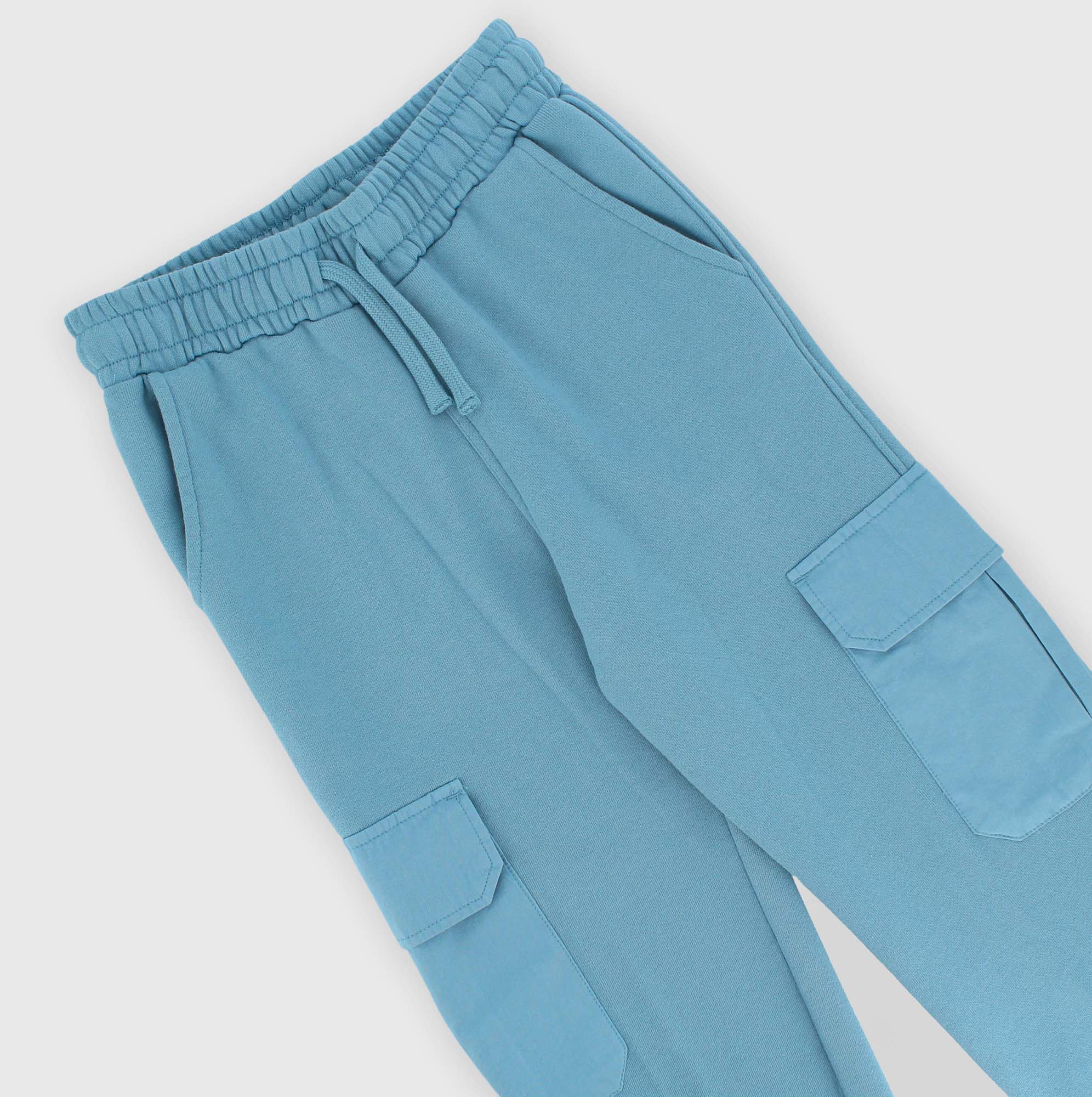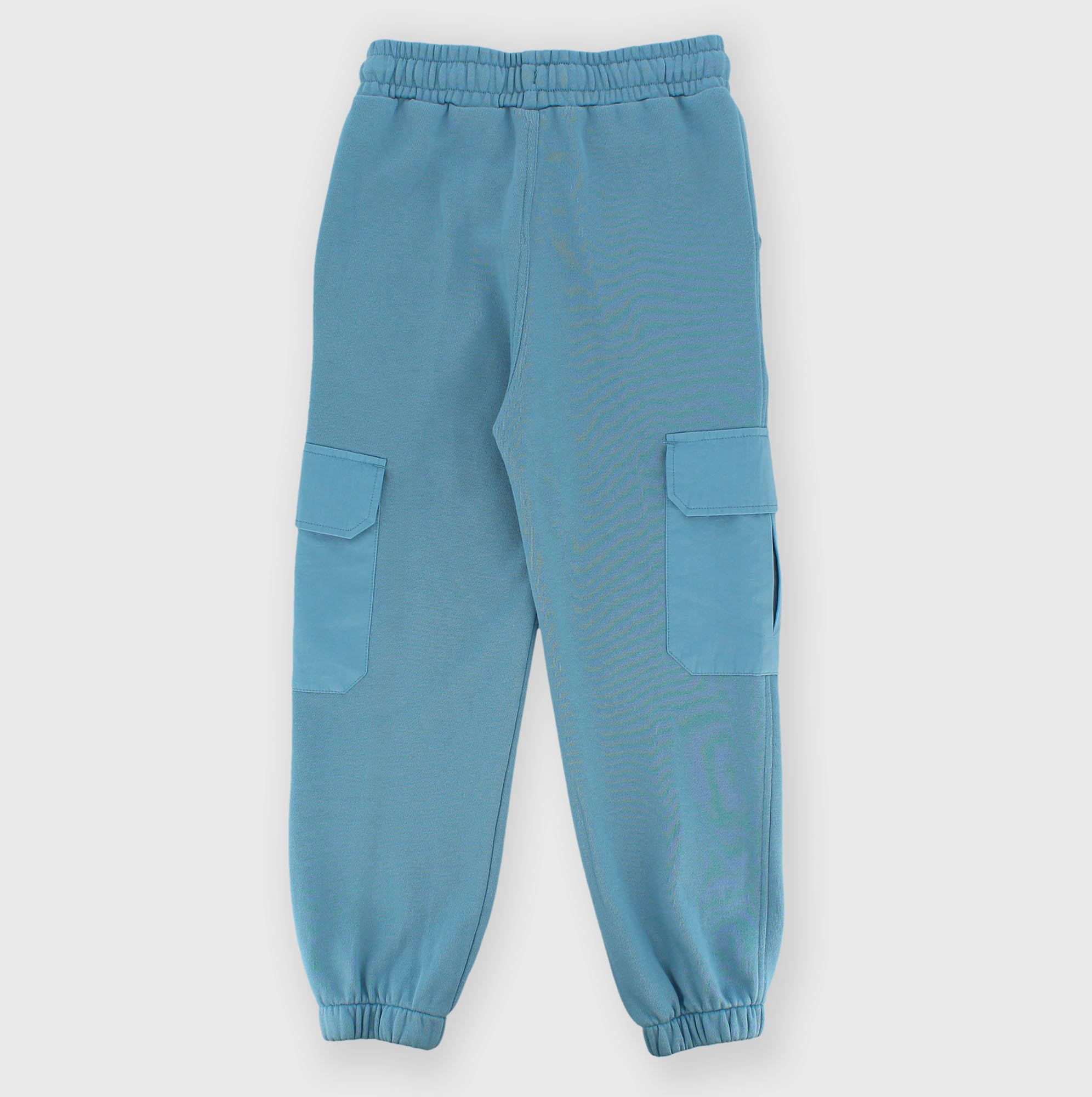 Pantalone in felpa con vita elasticizzata e lacci frontali. Tasche alla francese e tasconi laterali con pattina. Fondo con elastico.