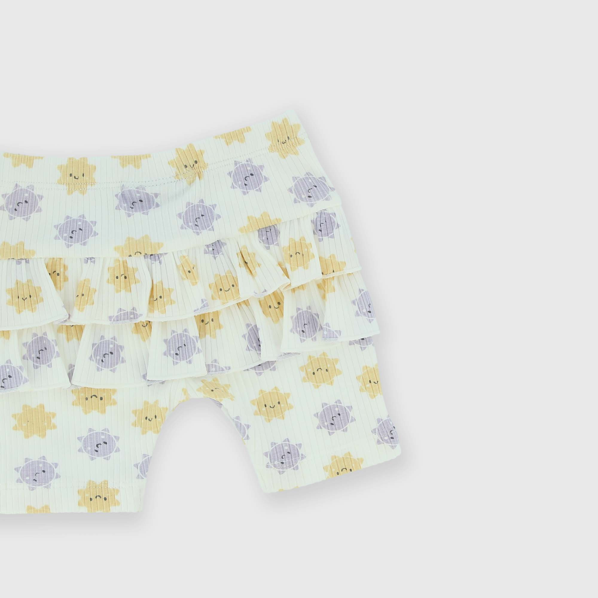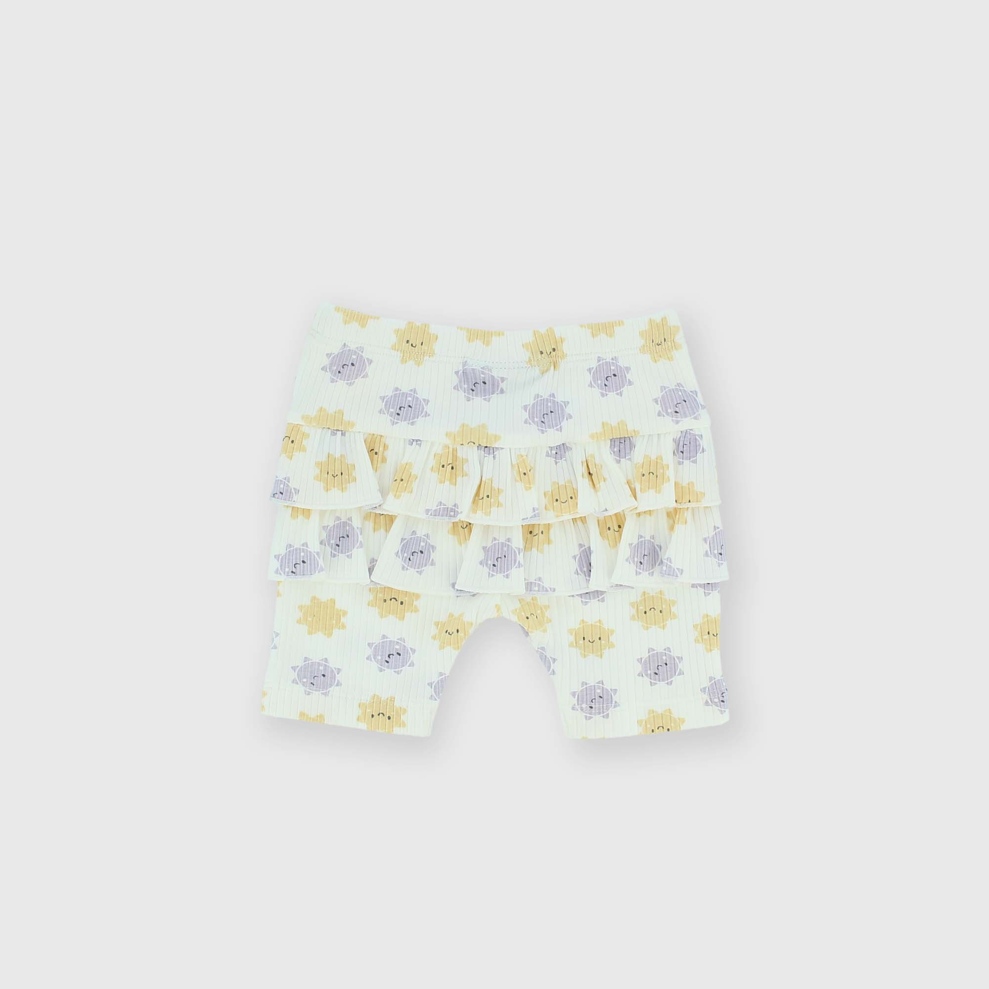 Shorts in costina con vita elasticizzata. Volants applicati sul retro. Stampa all-over sole.