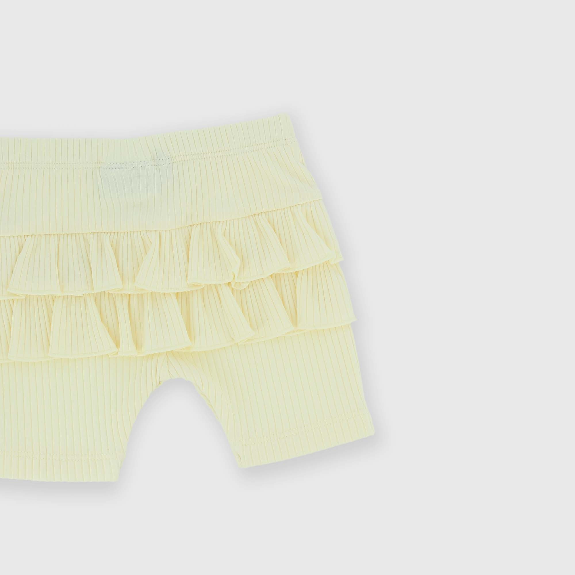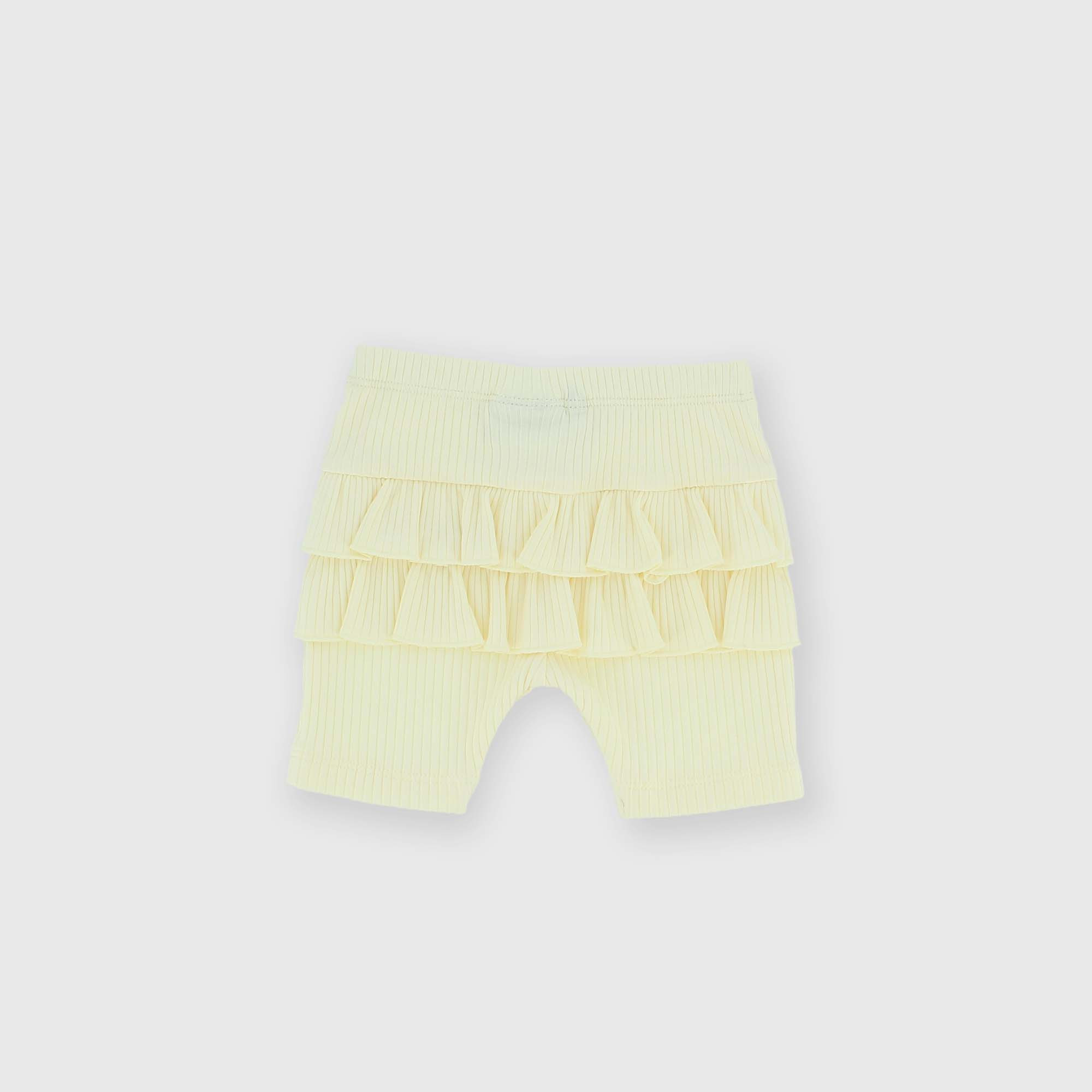 Shorts in costina con vita elasticizzata. Volants applicati sul retro. Tinta unita.