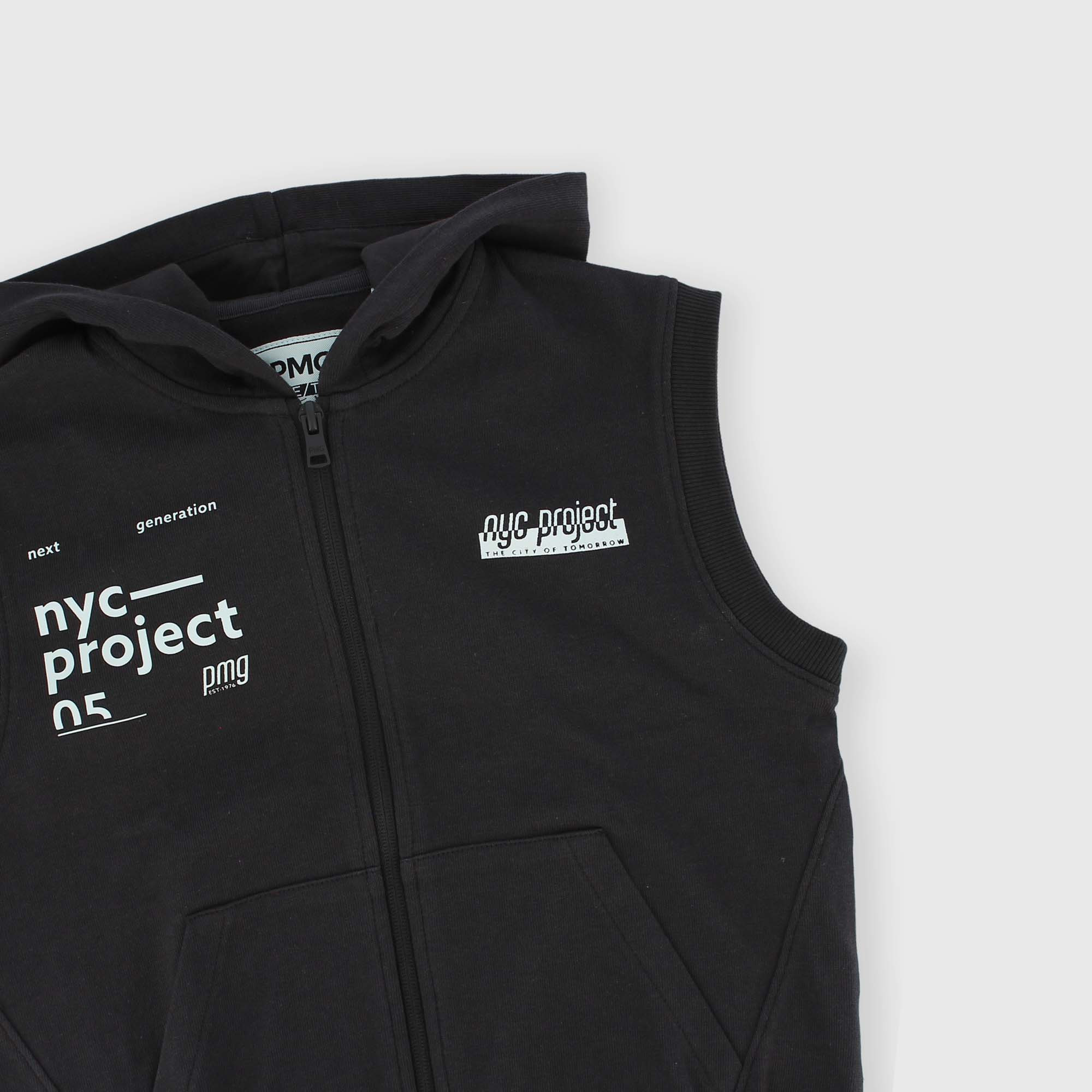 Gilet aperto in Jersey pesante con cappuccio. Chiusura con zip a contrasto sul davanti. Tasca a marsupio. Scritte con stampa sul fronte e sul retro. Fondo in costina.