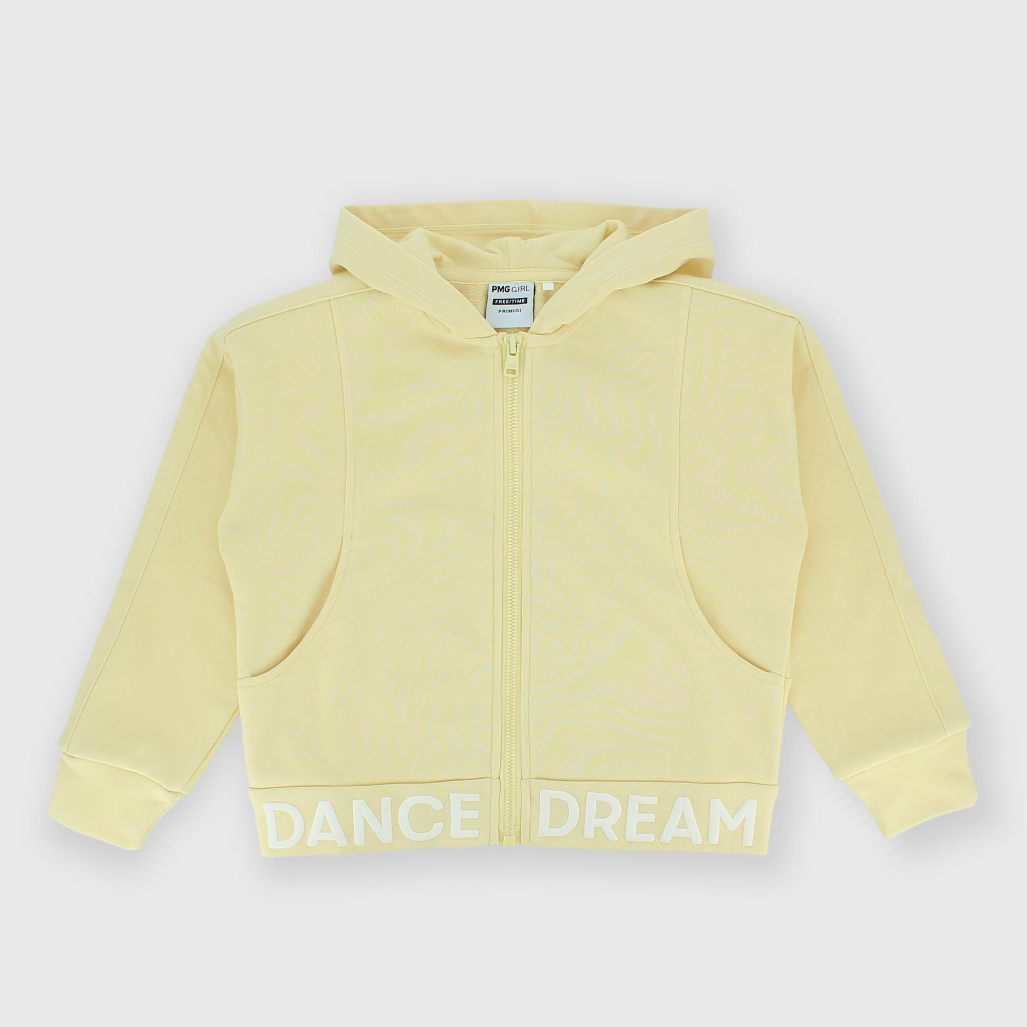 Felpa aperta con cappuccio. Chiusura con zip frontale. Tasche a scomparsa sul davanti. Stampa con scritte gommate sul cappuccio e sul fondo.
