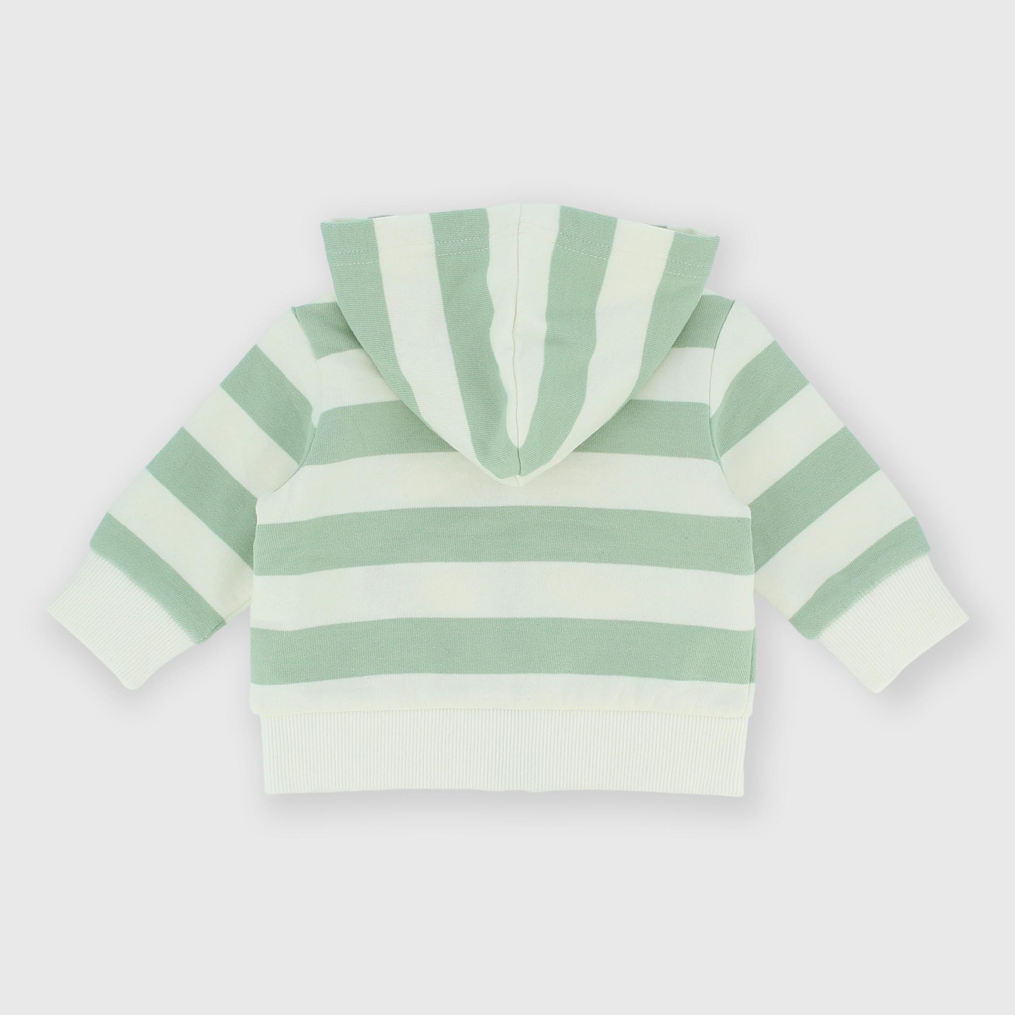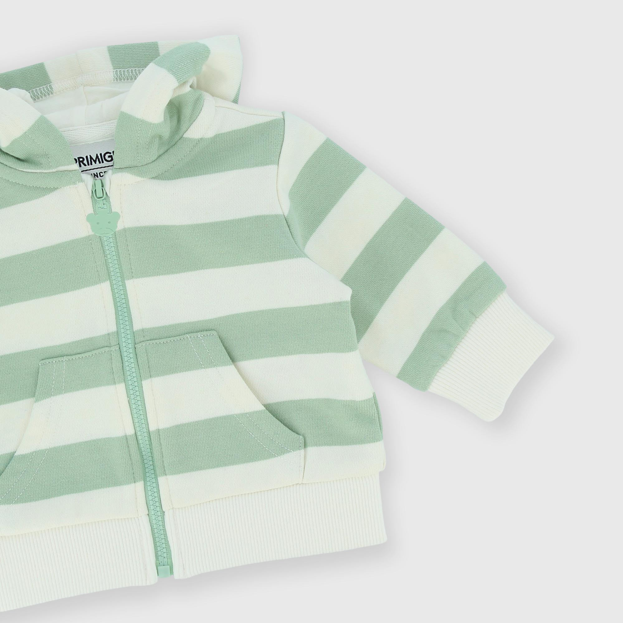 Felpa aperta con cappuccio. Zip frontale e tasche a marsupio. Righe stampate. Polsini e fondo in costina.