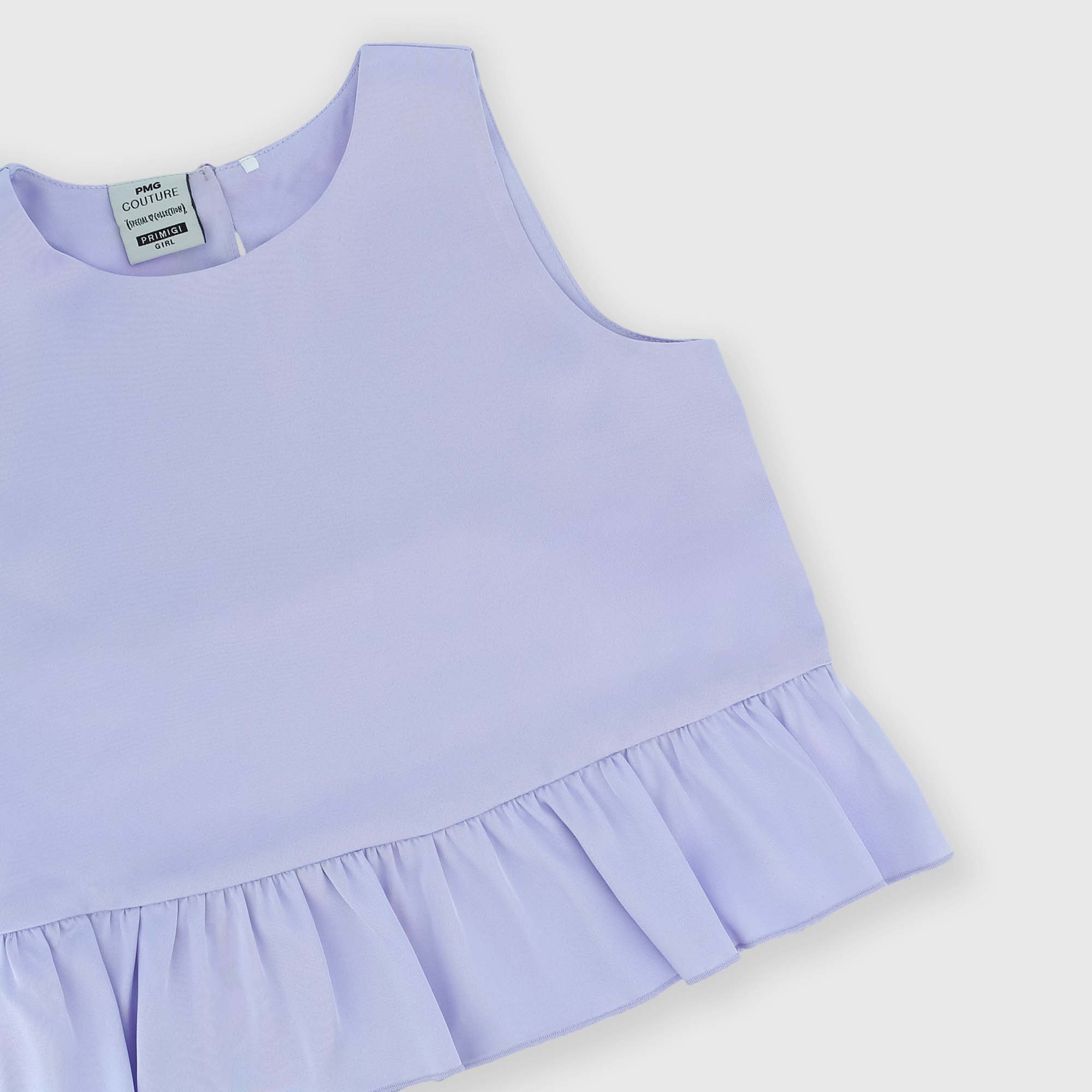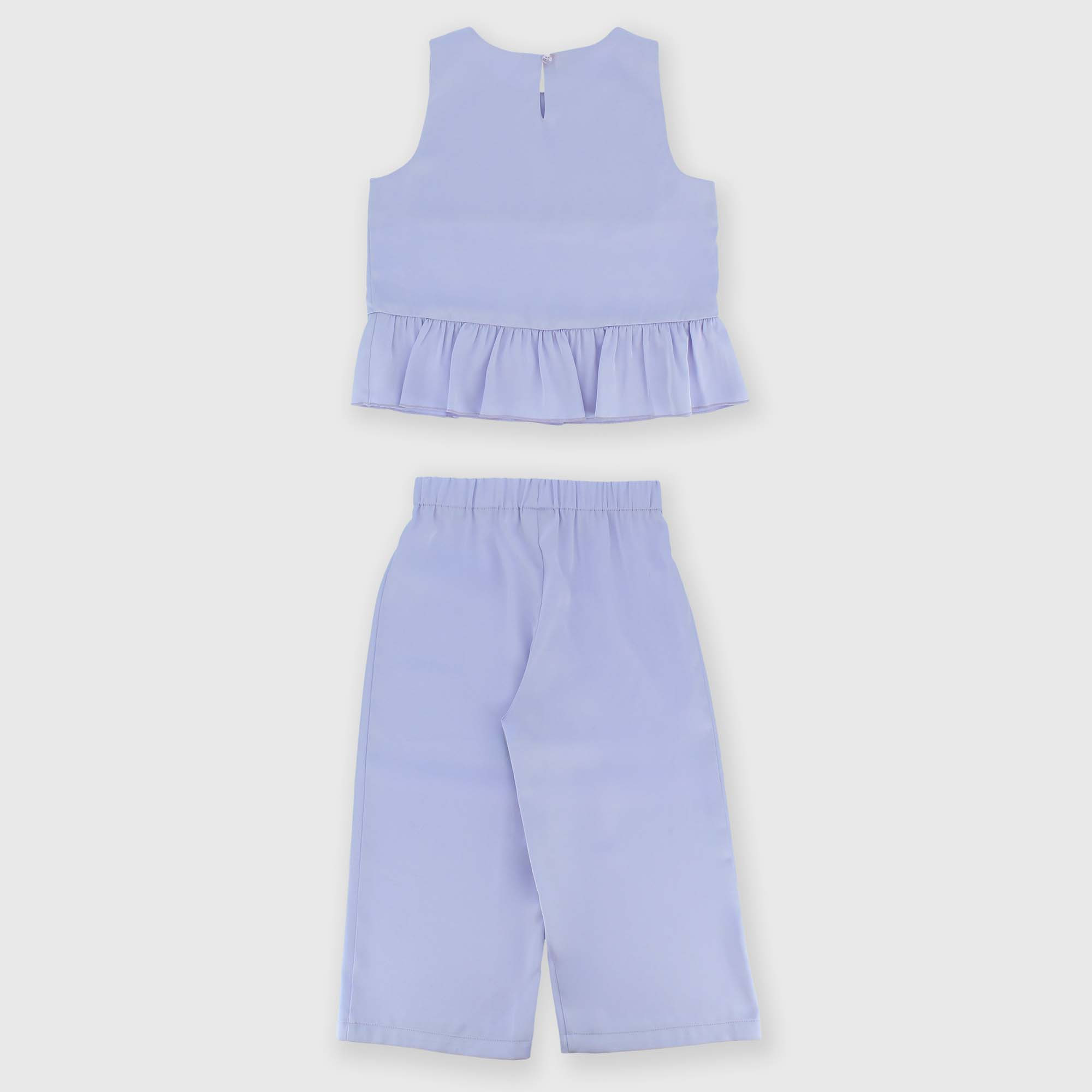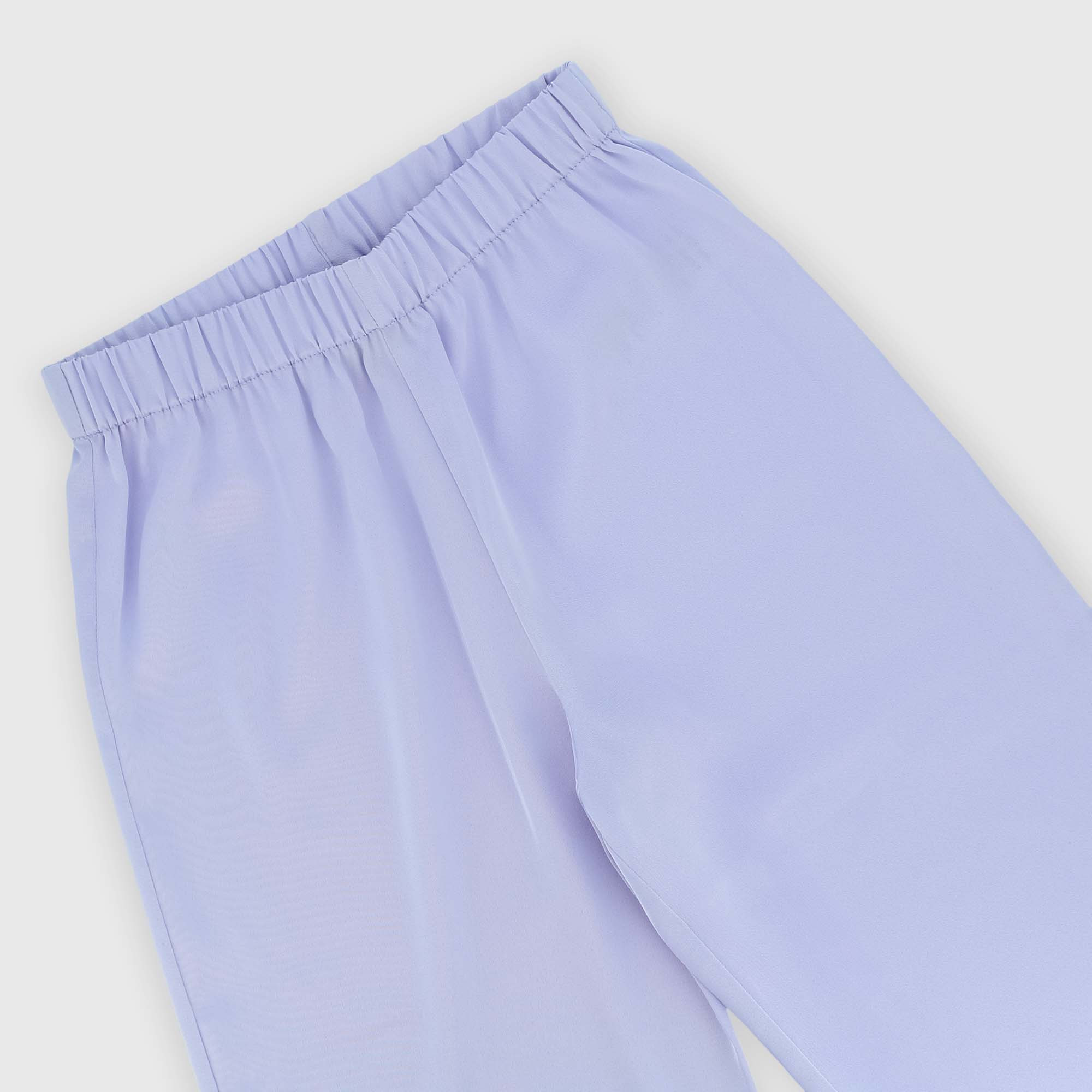 Completo composto da due pezzi. Blusa, girocollo, giromanica. Chiusura a goccia con bottoncino sul retro. Balza sul fondo. Pantalone wide leg con vita elasticizzata.