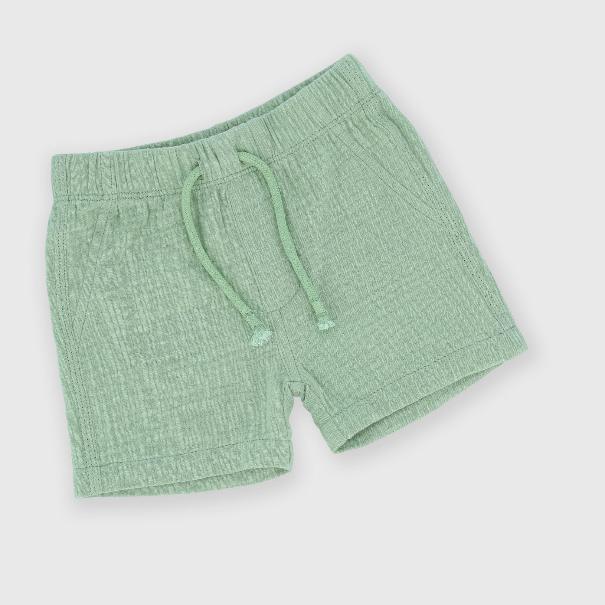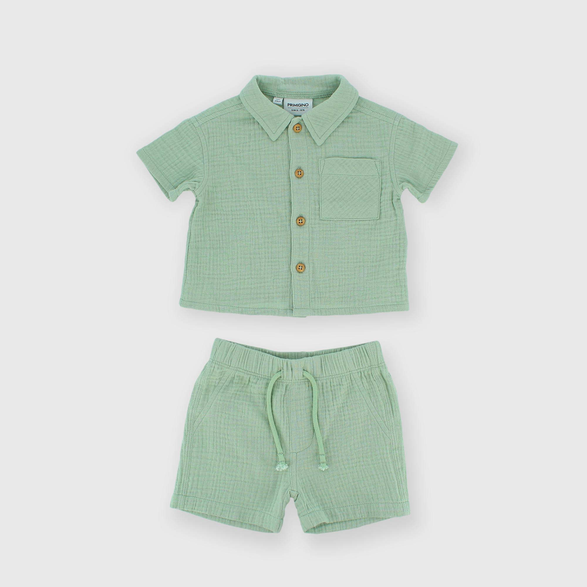 Completo in garza di cotone composto da due pezzi. Camicetta a maniche corte. Chiusura con bottoni e taschina sul davanti. Pantaloncino con vita elasticizzata e lacci frontali. Tasche a toppa sul retro.
