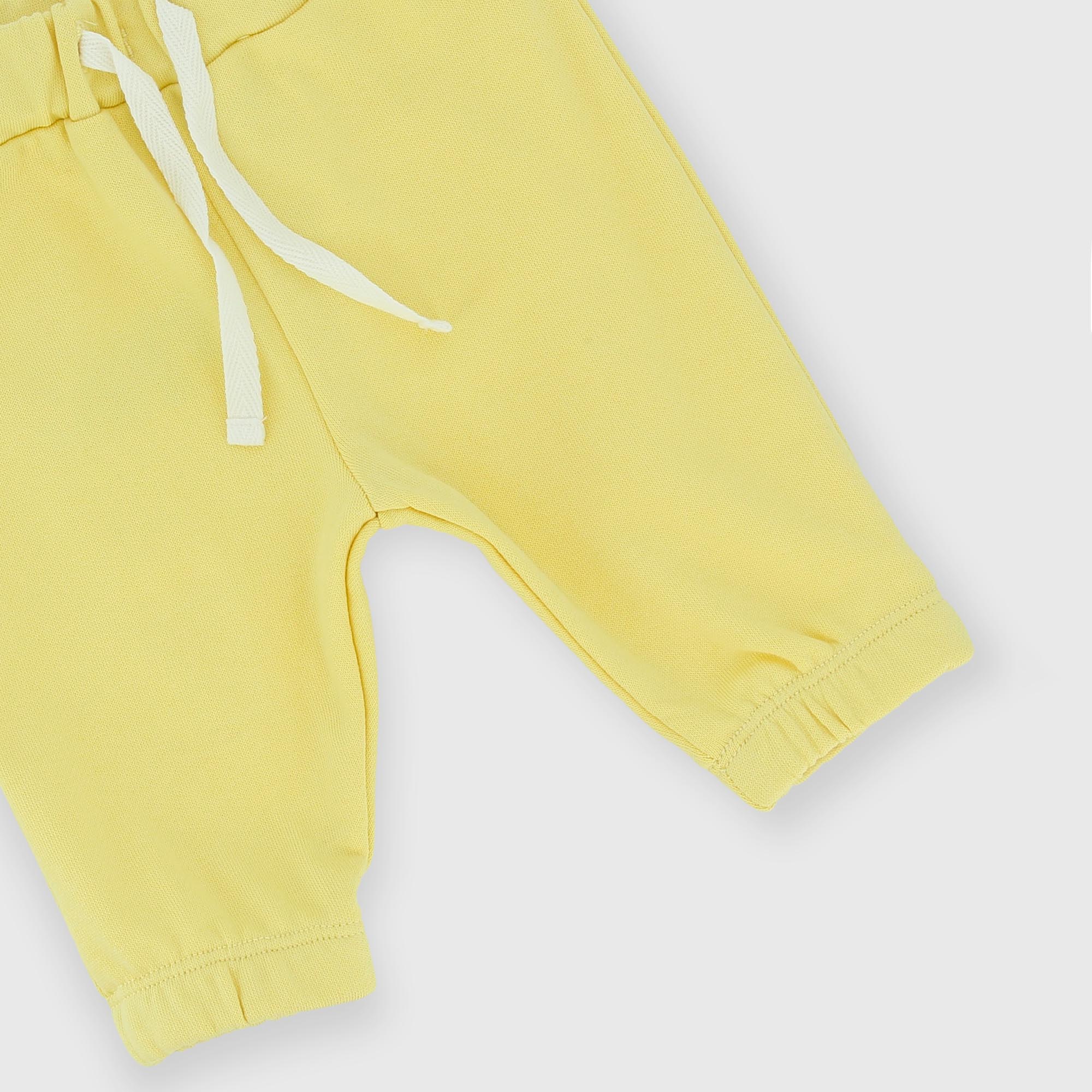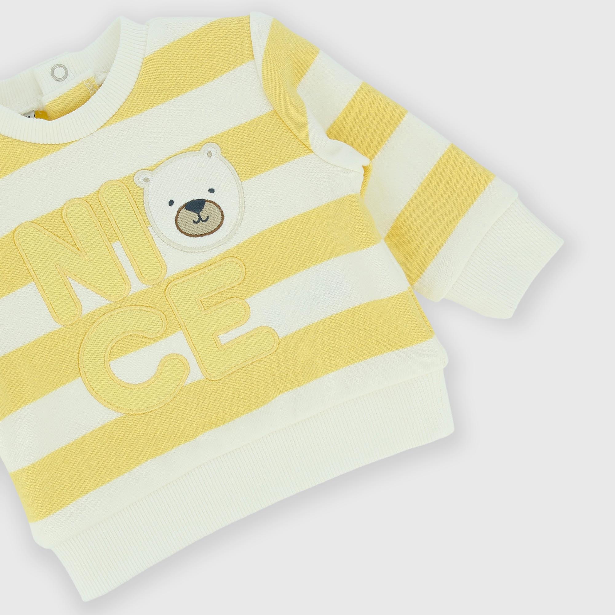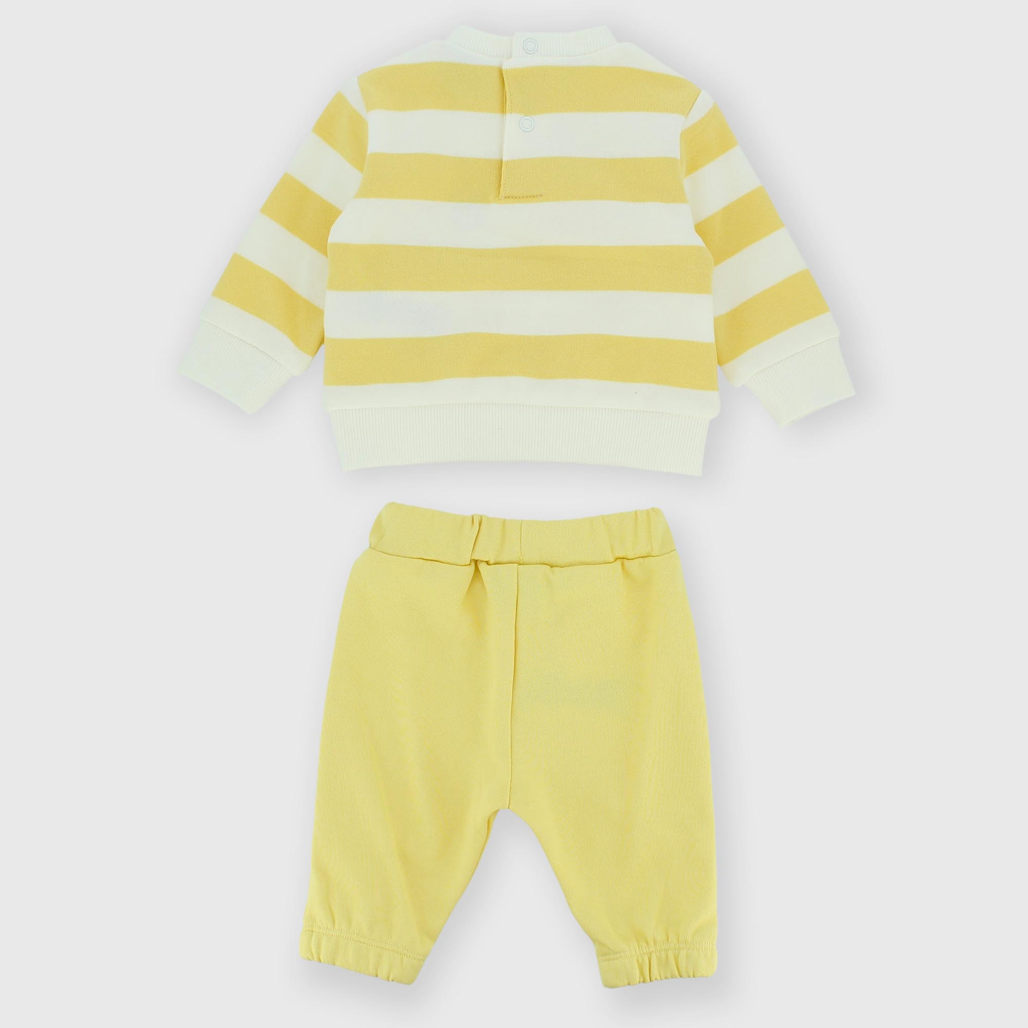 Completo composto da due pezzi. Felpa a righe girocollo a maniche lunghe. Chiusura posteriore con bottoni automatici. Applicazione ricamata sul davanti. Collo, polsini e fondo in costina. Pantalone in felpa con vita elasticizzata e lacci frontali. Fondo elasticato.