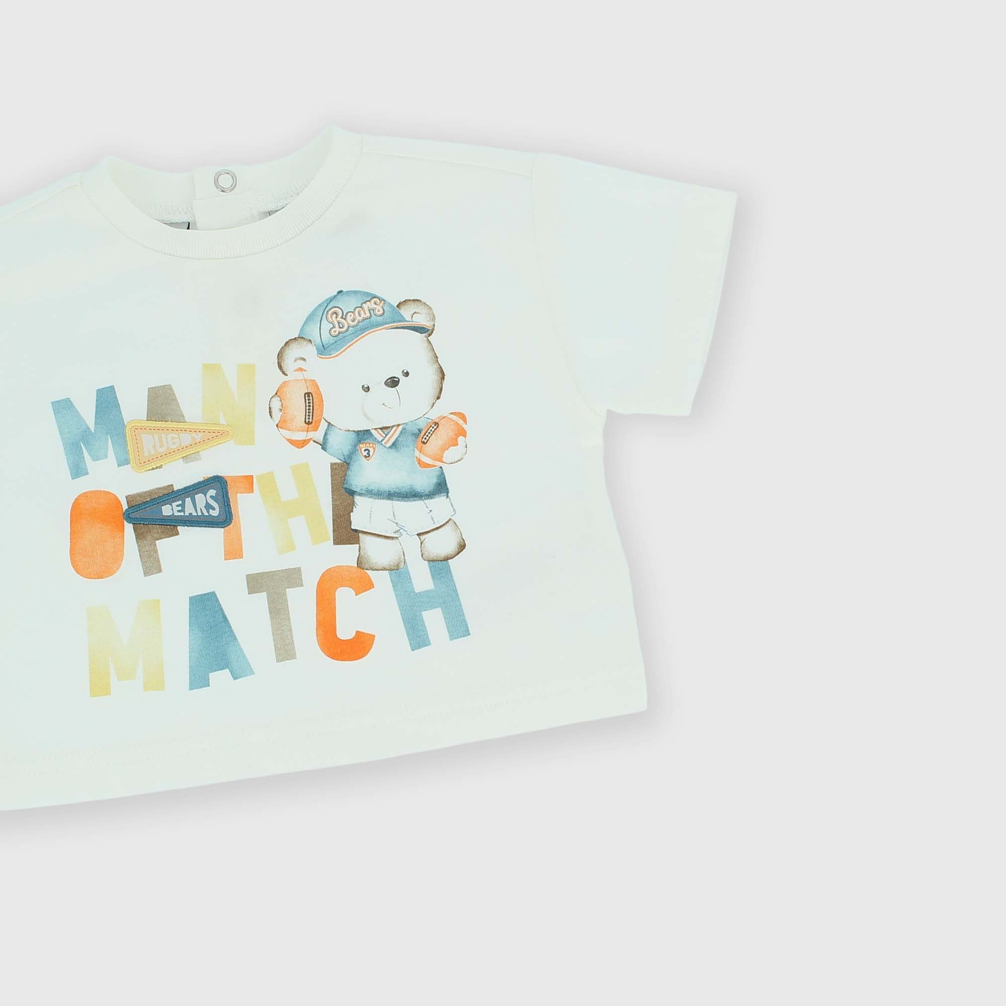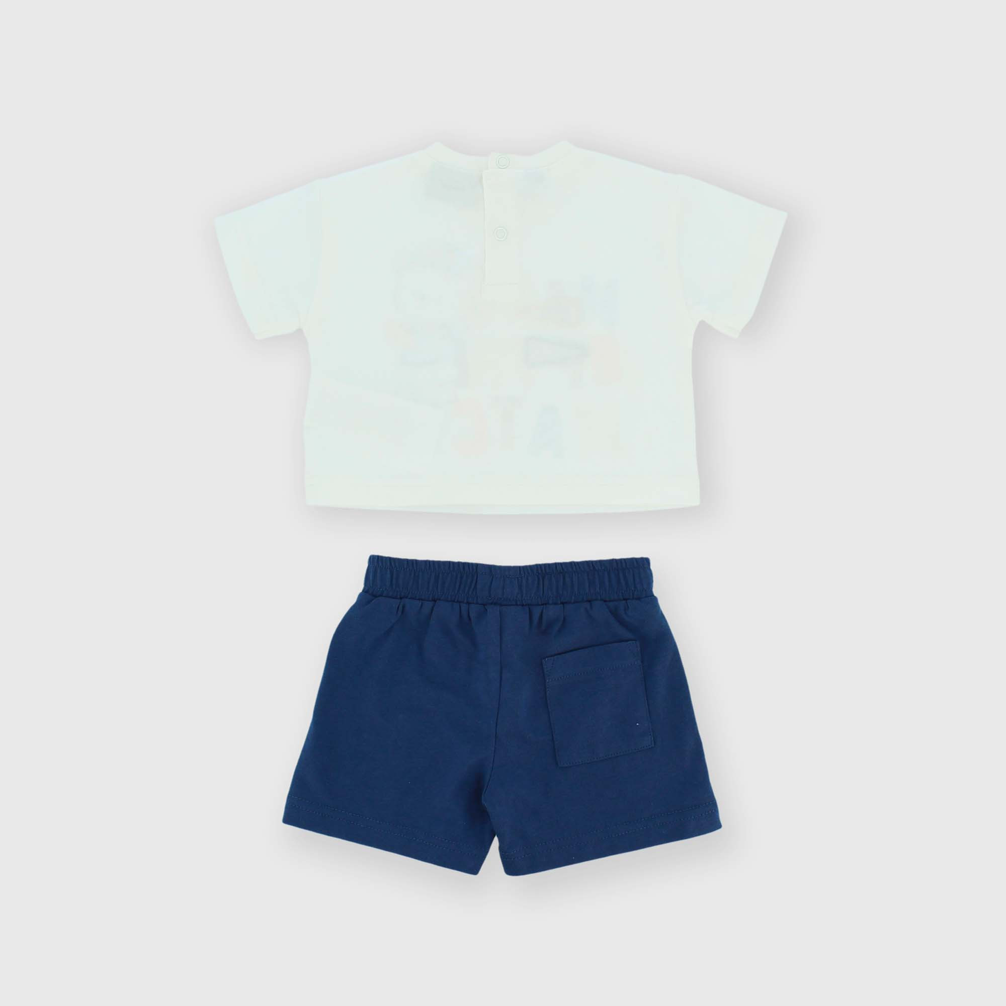 Completo in Jersey composto da due pezzi. Maglietta girocollo a maniche corte. Chiusura con bottoni automatici sul retro. Patch e stampe sul davanti. Pantaloncino con vita elasticizzata e tasca a toppa sul retro.