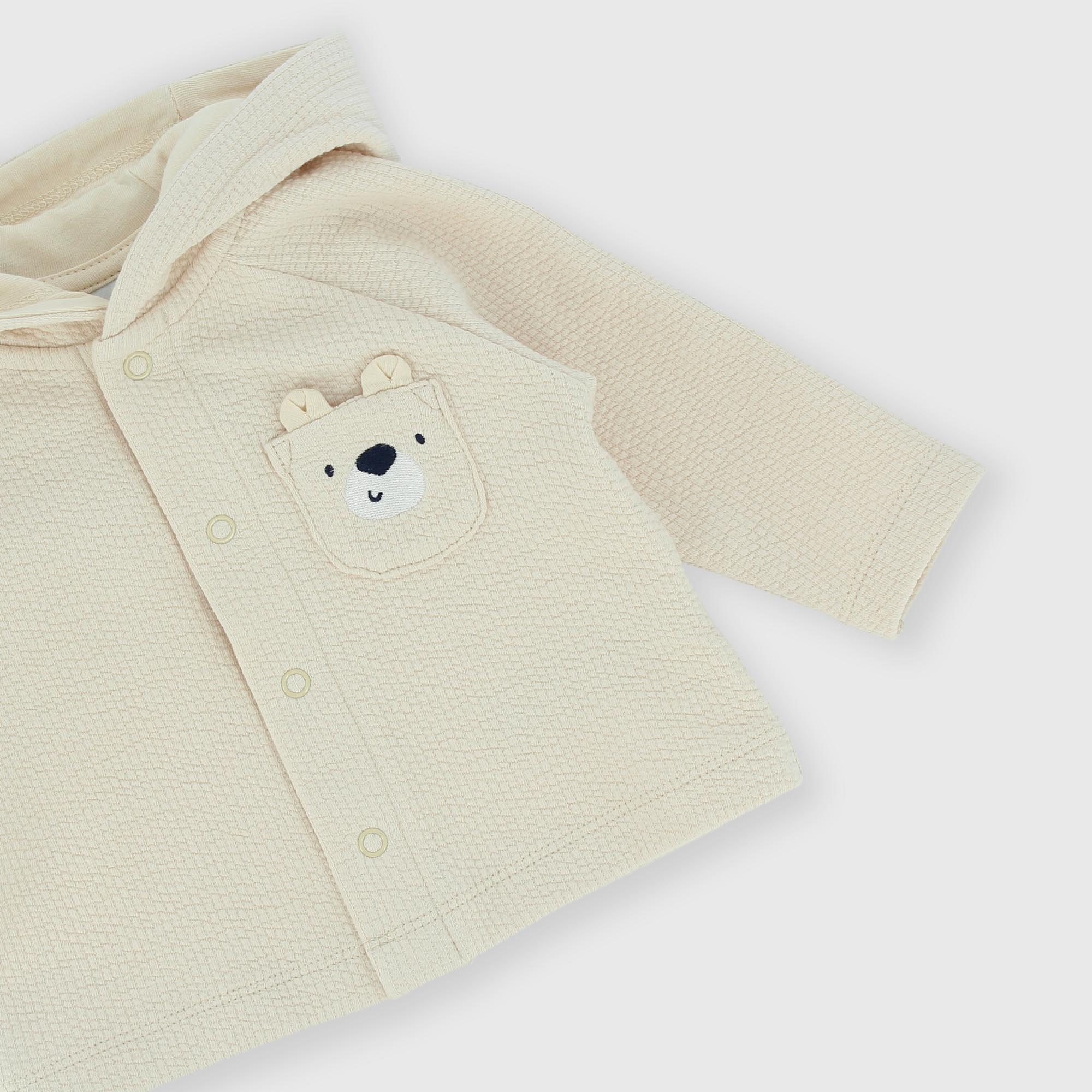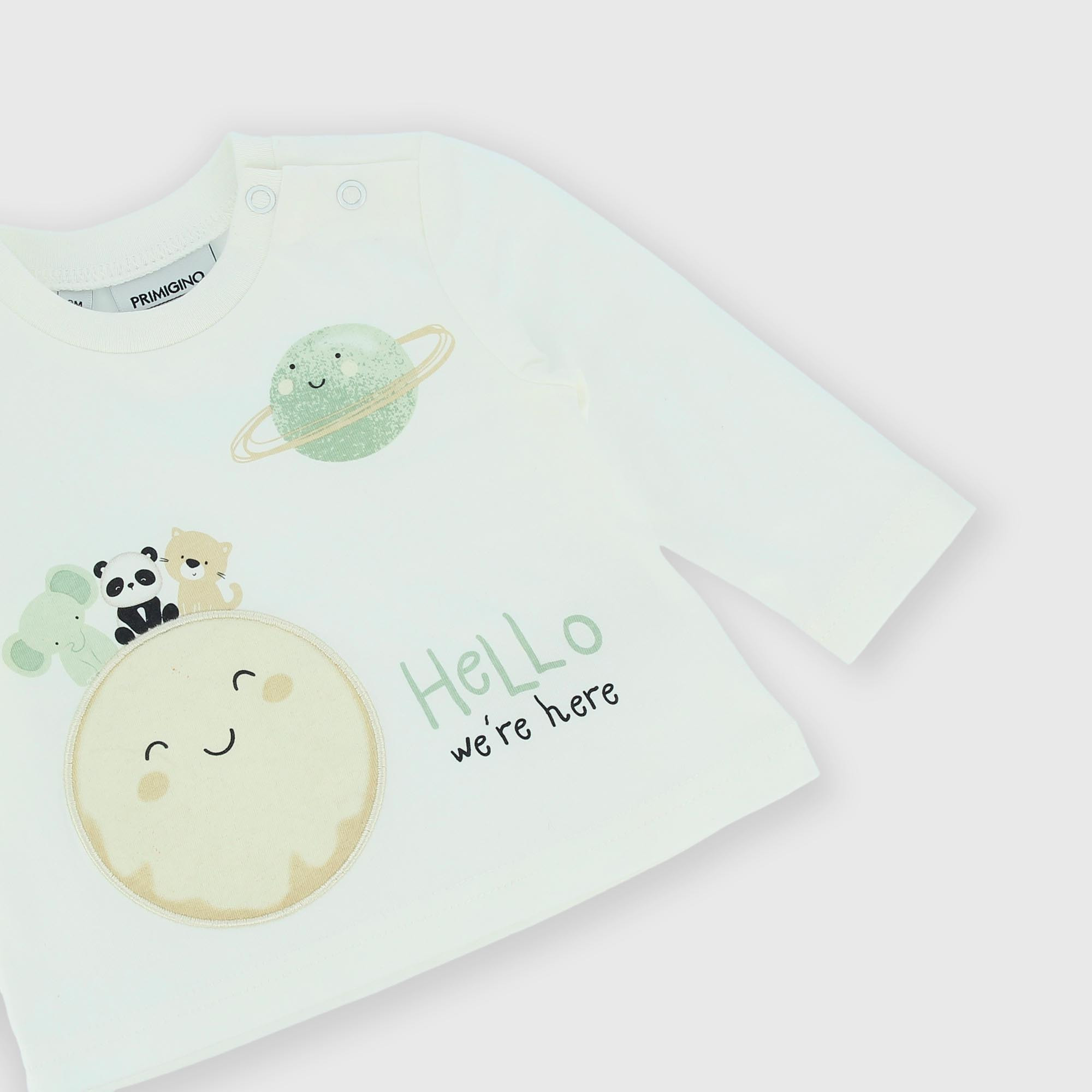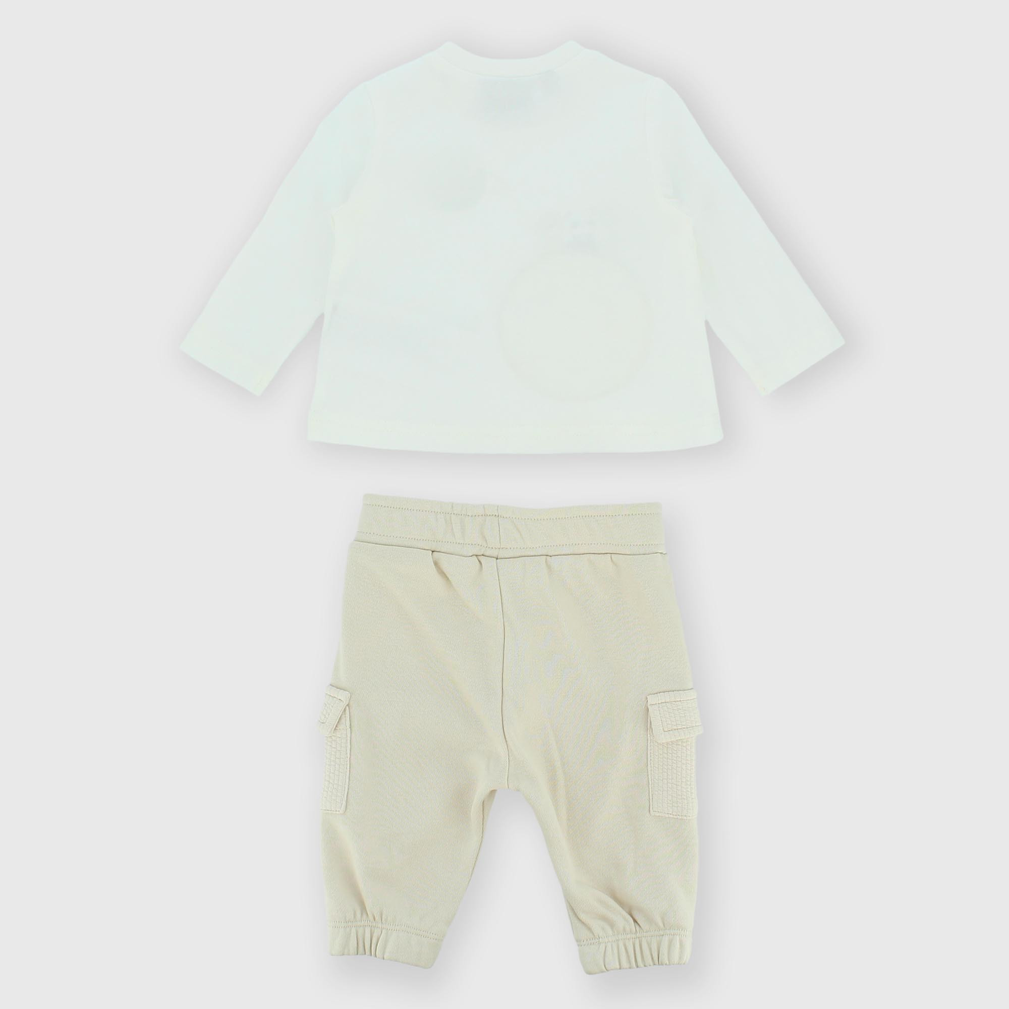 Completo composto da tre pezzi. Felpa aperta con cappuccio a maniche lunghe. Chiusura con bottoncini automatici. Taschina ad orsetto sul petto. Maglietta in Jersey girocollo, a maniche lunghe. Chiusura con bottoncini automatici sulla spalla. Stampa ed applicazione sul davanti. Pantalone in felpa con vita elasticizzata e lacci frontali. Tasche a toppa con pattini sui lati, e fondo elasticato.