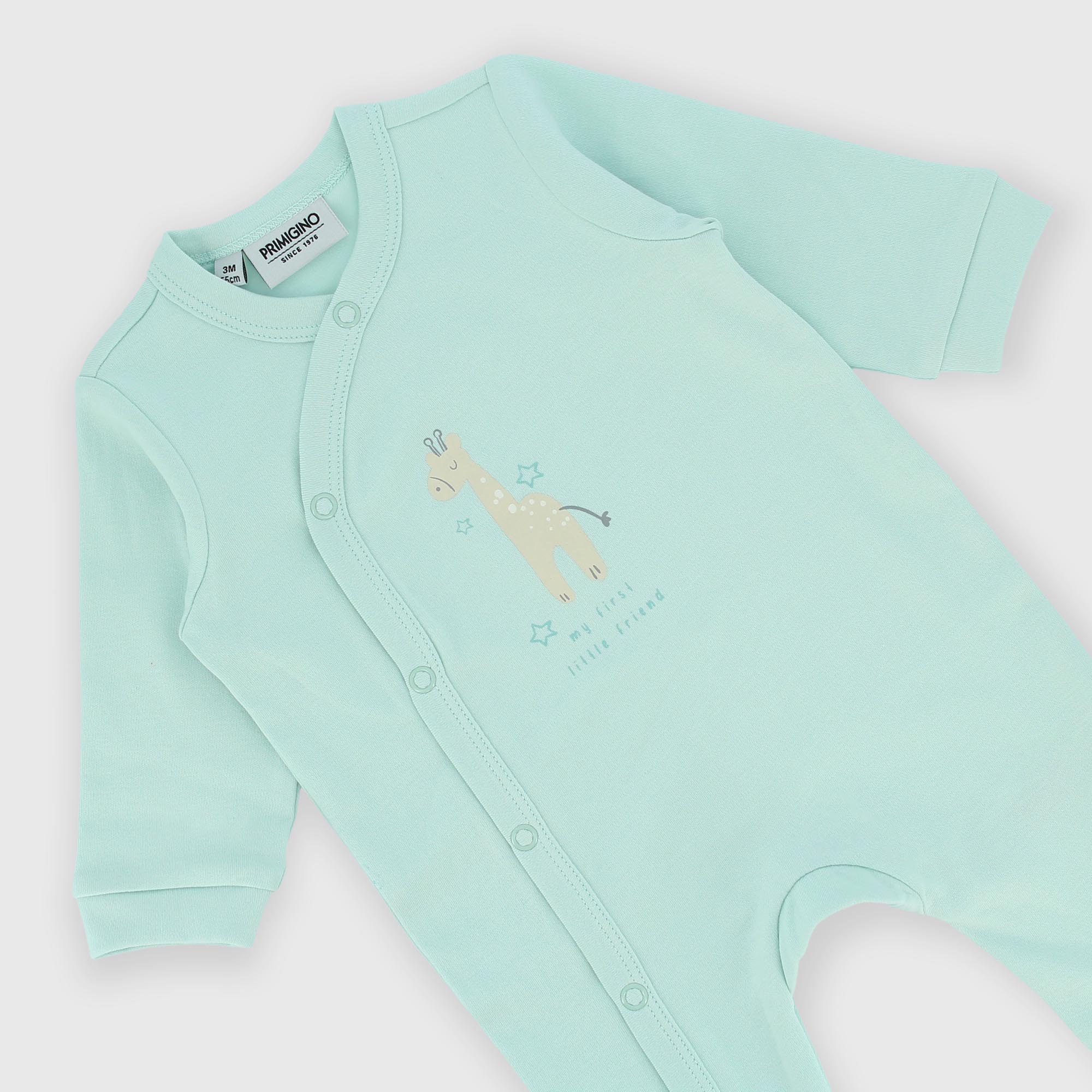 Tutina in Interlock girocollo, a maniche lunghe. Chiusura a kimono con bottoncini automatici. Stampa Giraffa sul davanti.