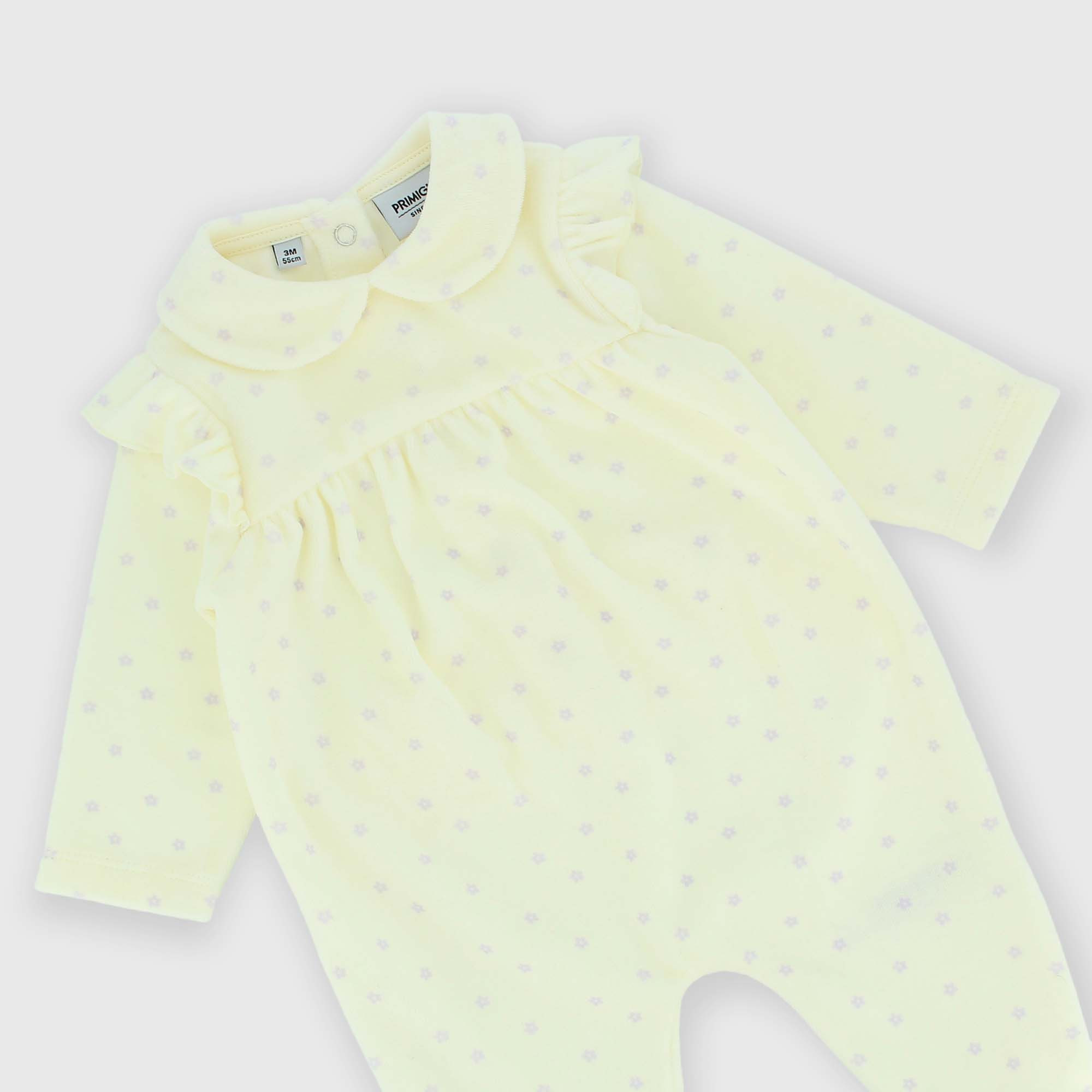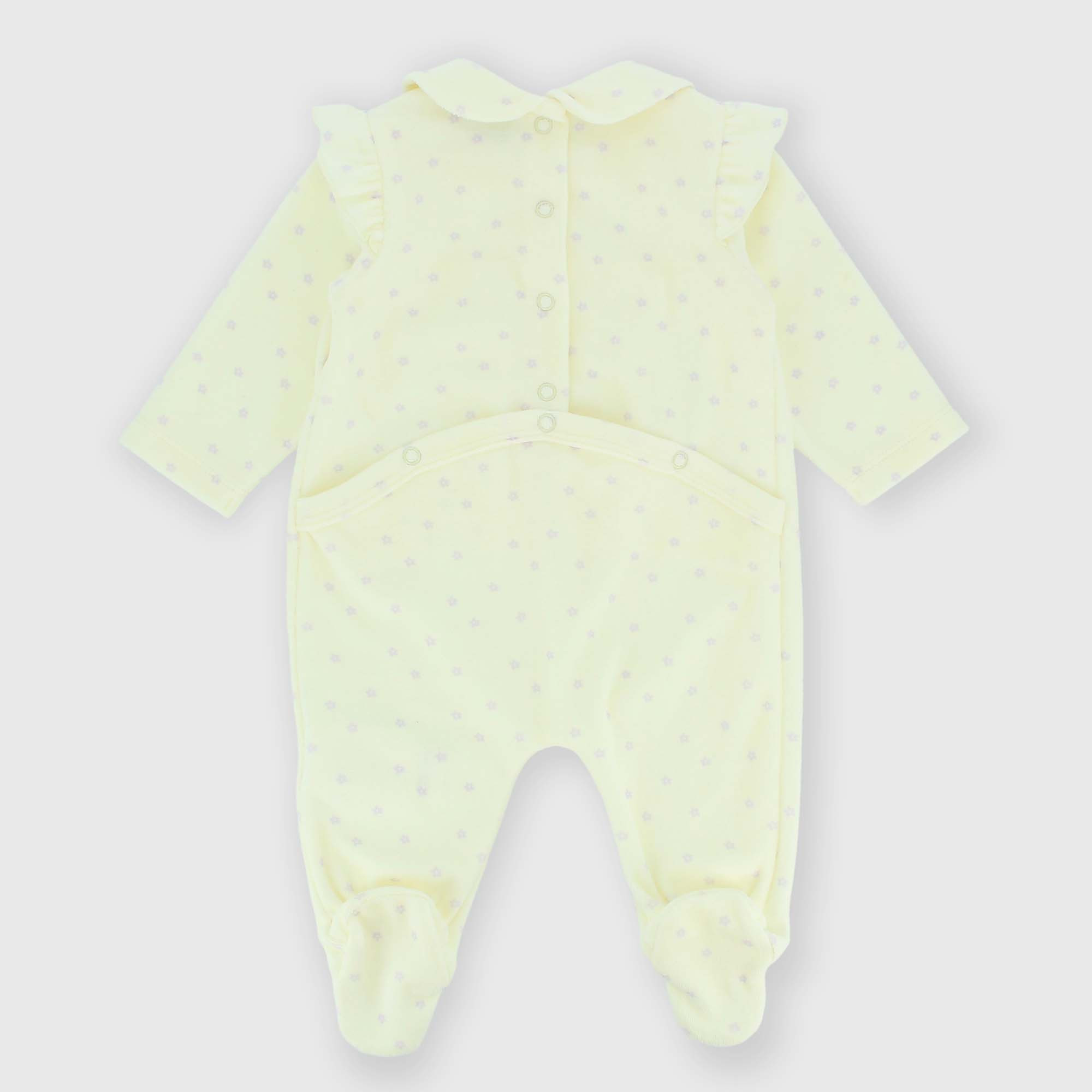 Tutina in ciniglia, con colletto peter pan, a maniche lunghe. Chiusura posteriore con bottoncini automatici. Volants sulle spalle. Stampa all-over fiorellini.