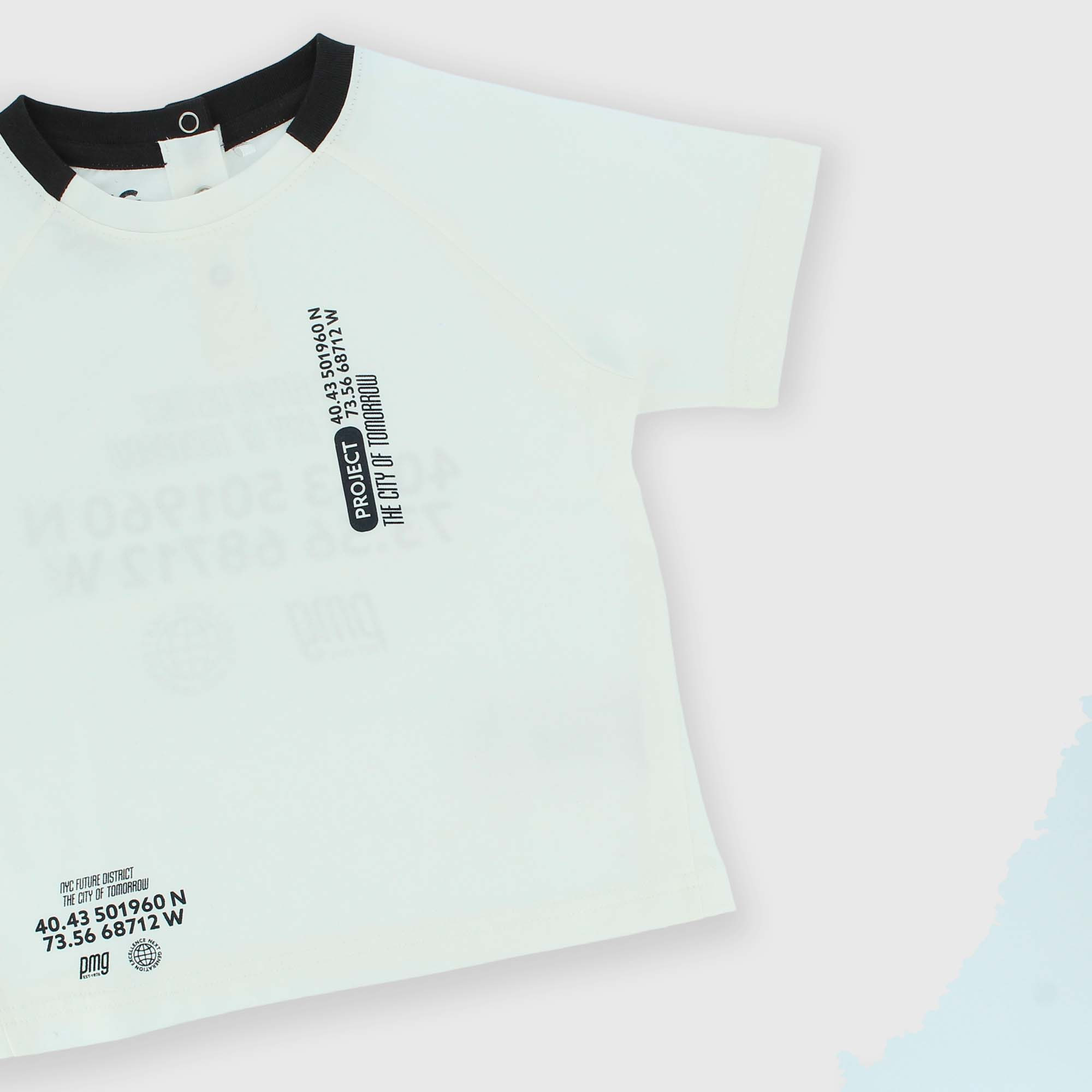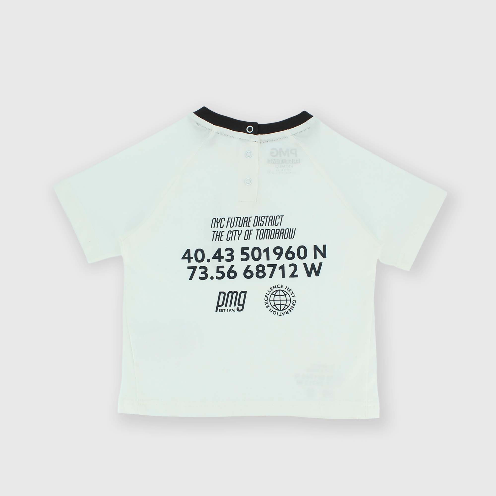 Maglietta in Jersey, girocollo, a maniche corte. Chiusura con bottoncini automatici sul retro. Stampe con scritte sul fronte e sul retro. Collo in costina a contrasto.