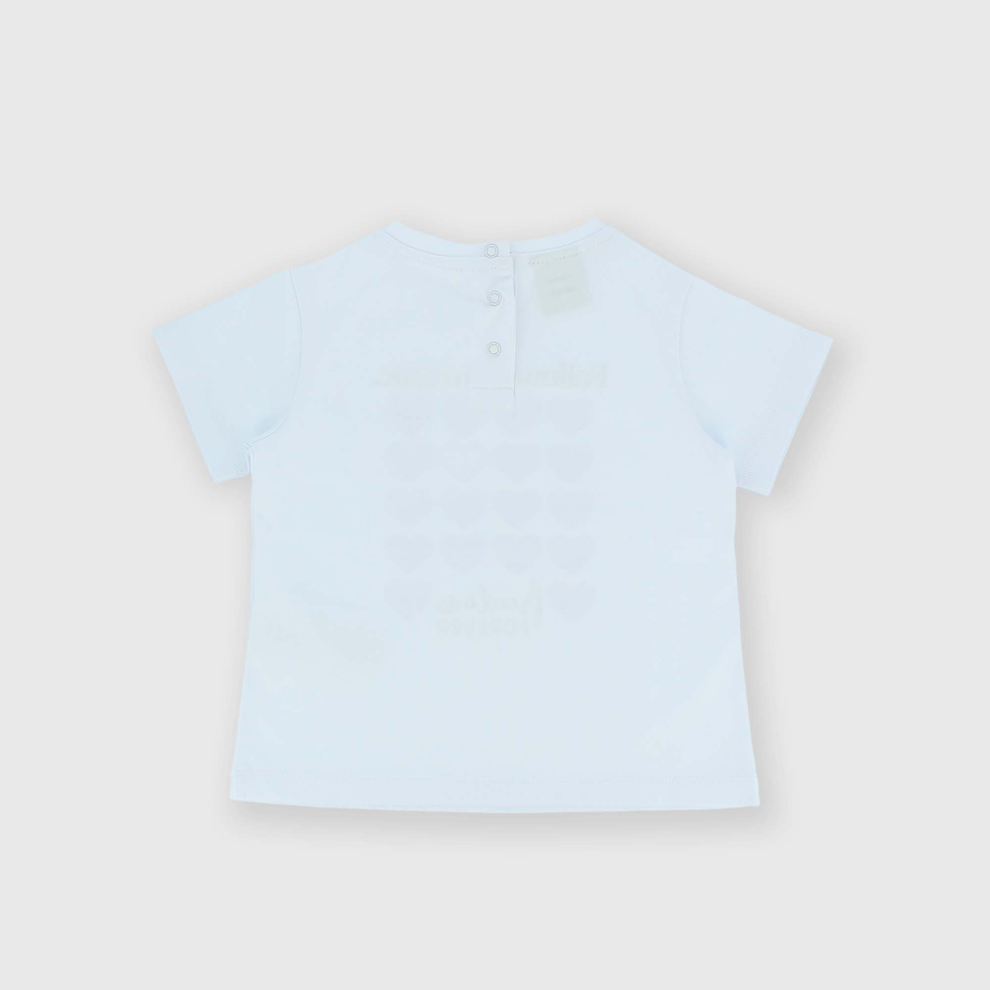 Maglietta in Jersey, girocollo, a maniche corte. Chiusura con bottoni automatici sul retro. Stampa con dettagli glitterati sul davanti.