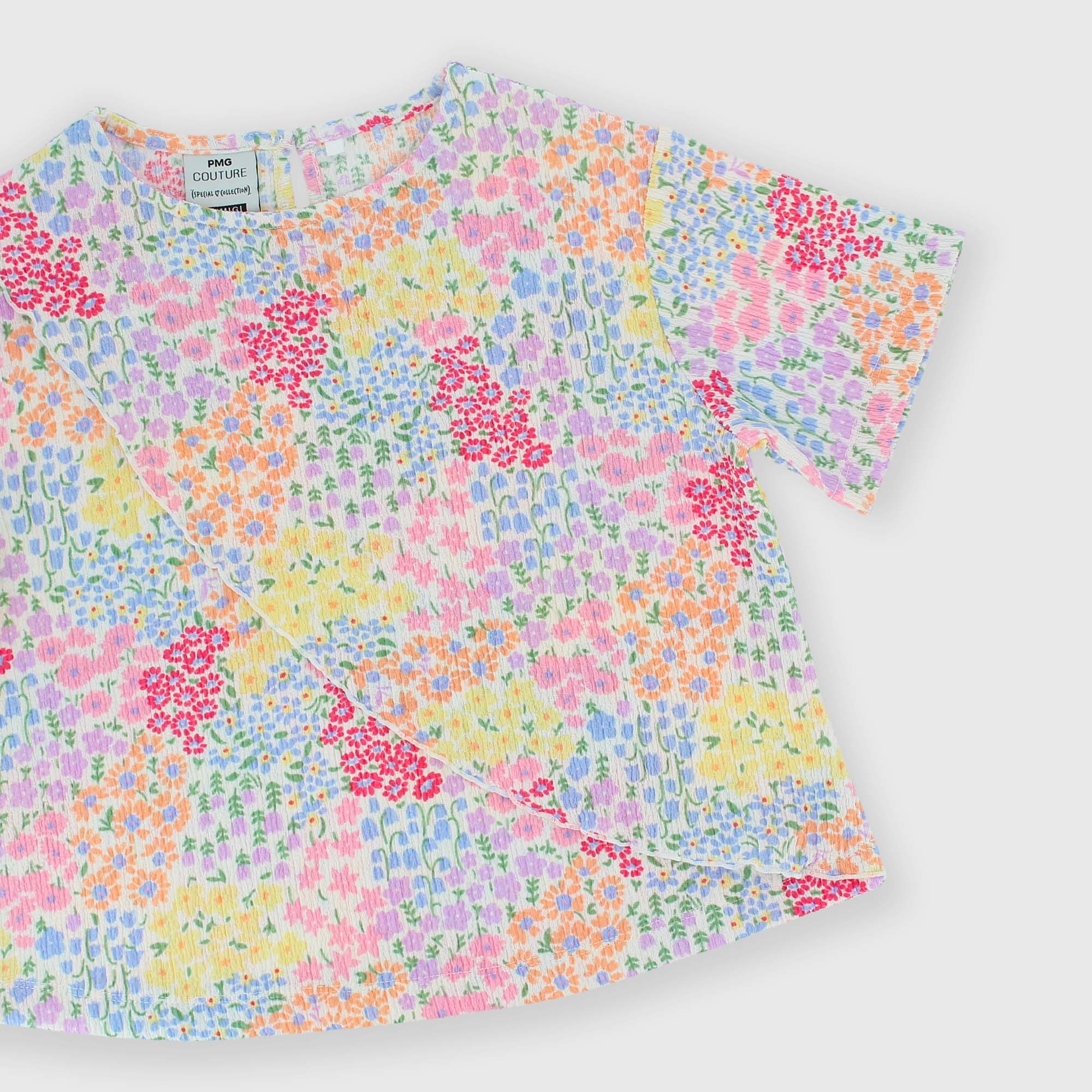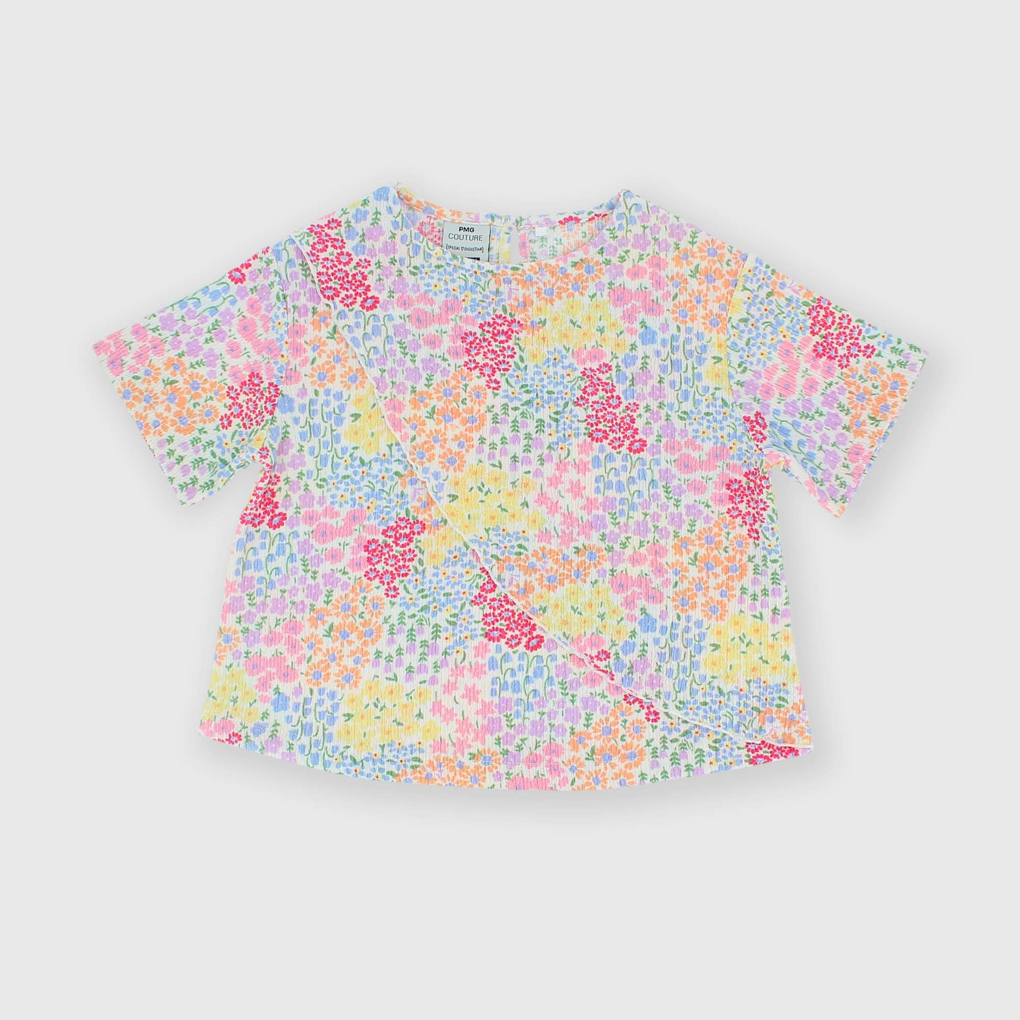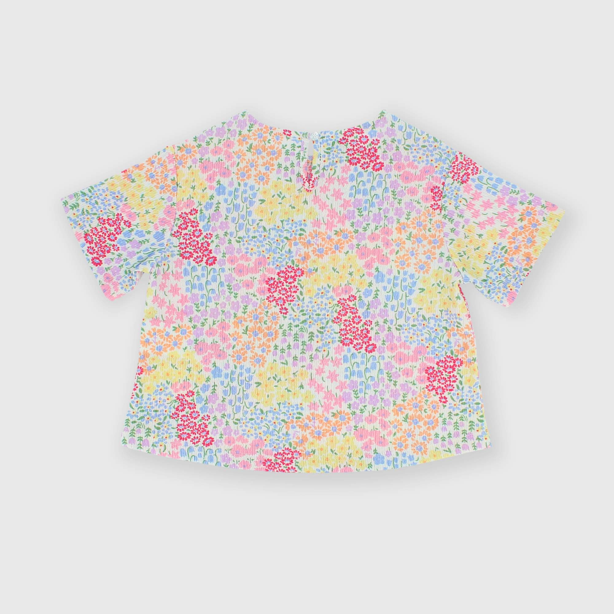 Maglietta in seersucker, girocollo, a maniche corte. Pannello in tessuto sul davanti. Chiusura a goccia con bottone sul retro. Stampa all-over fiorellini multicolor. Rifiniture con punto bambola.