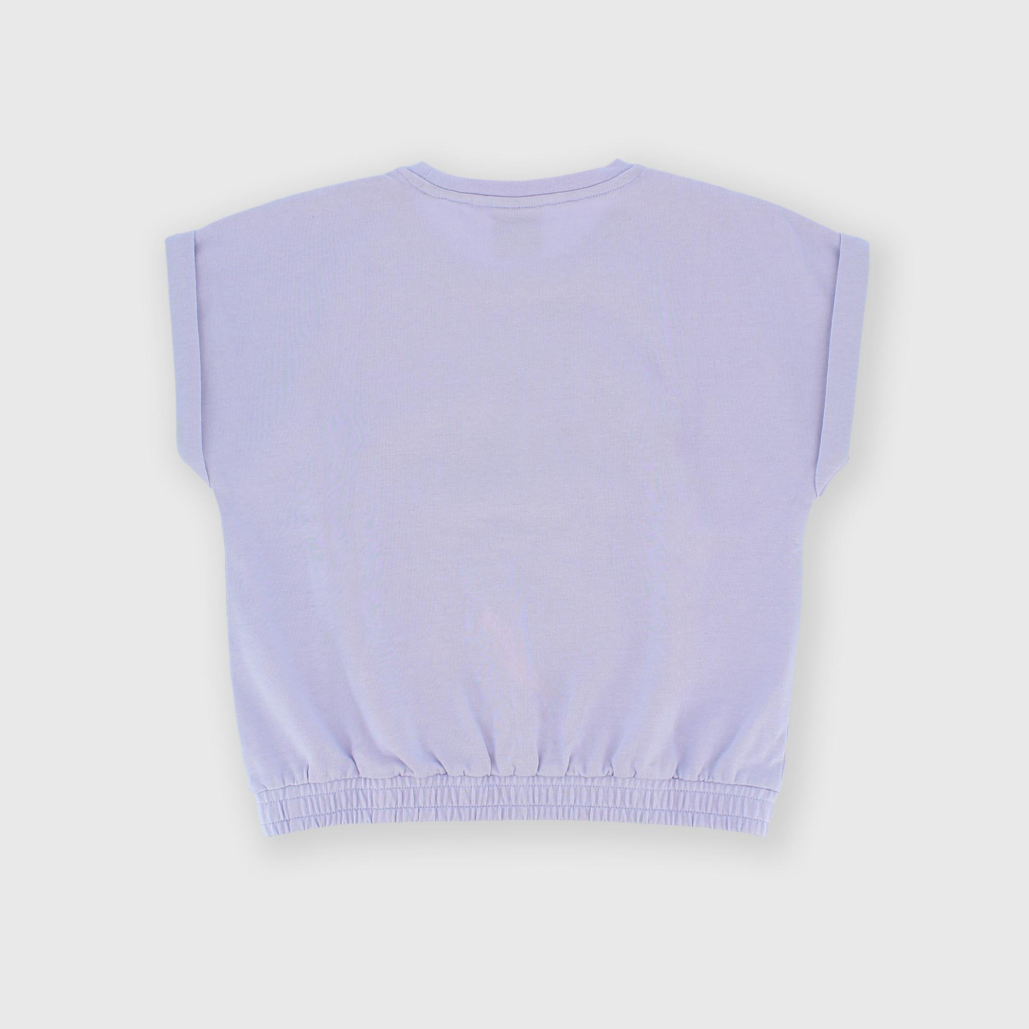 Maglietta in Jersey pesante, girocollo, a maniche corte con risvoltino. Stampa con scritte gommate sul davanti e fondo con elastico.