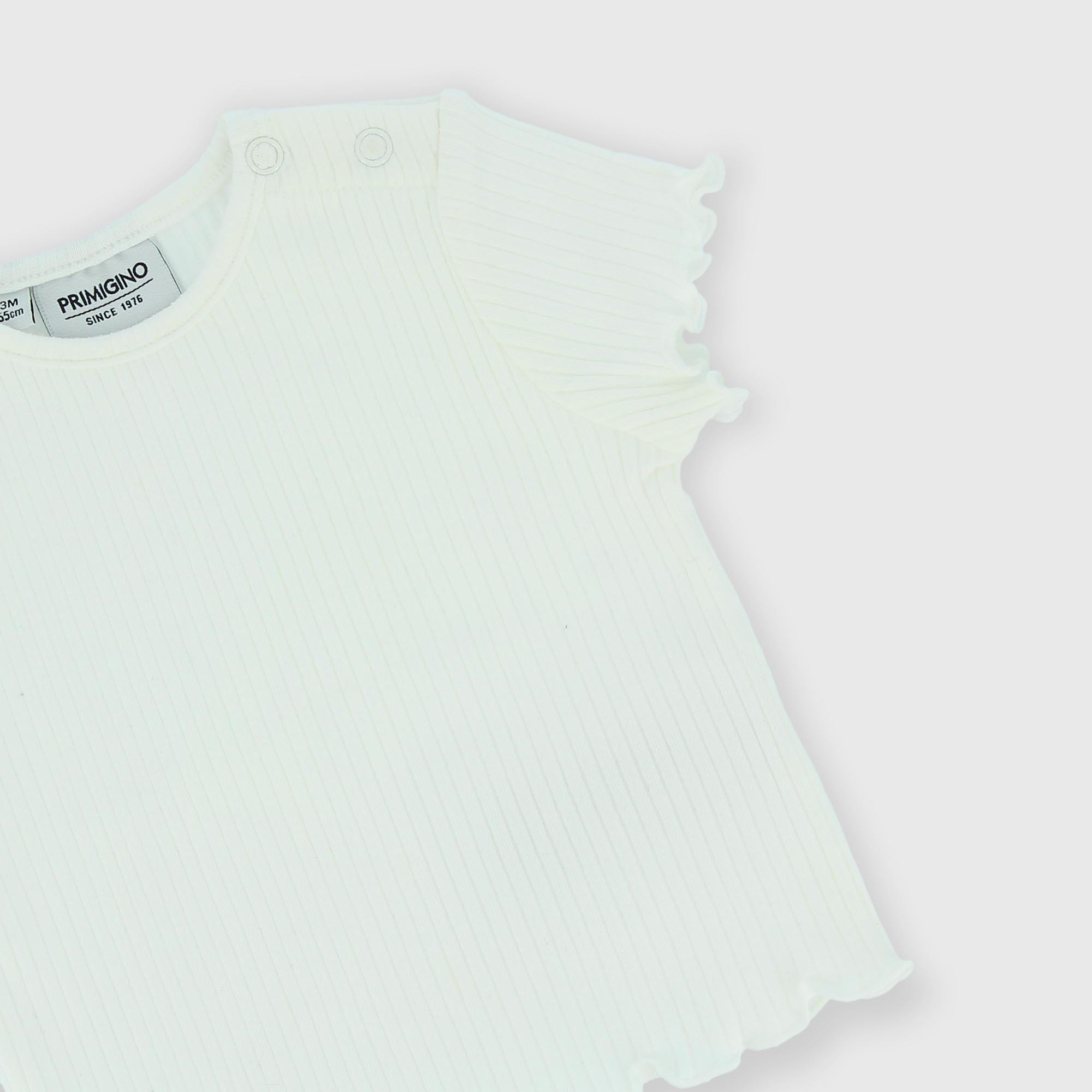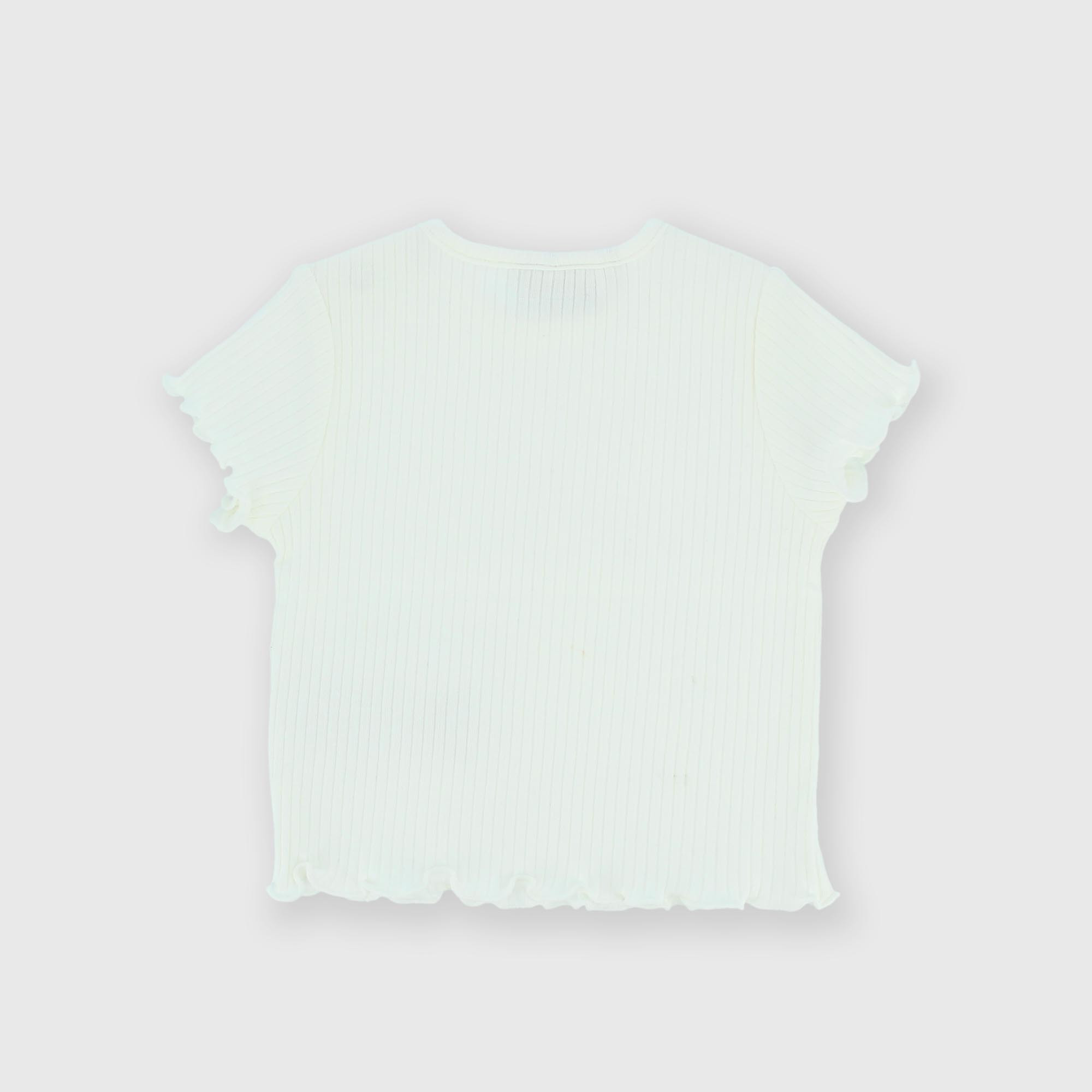 Maglietta in costina, girocollo, con maniche corte. Chiusura con bottoncini automatici sulla spalla. Rifiniture con punto bambola.