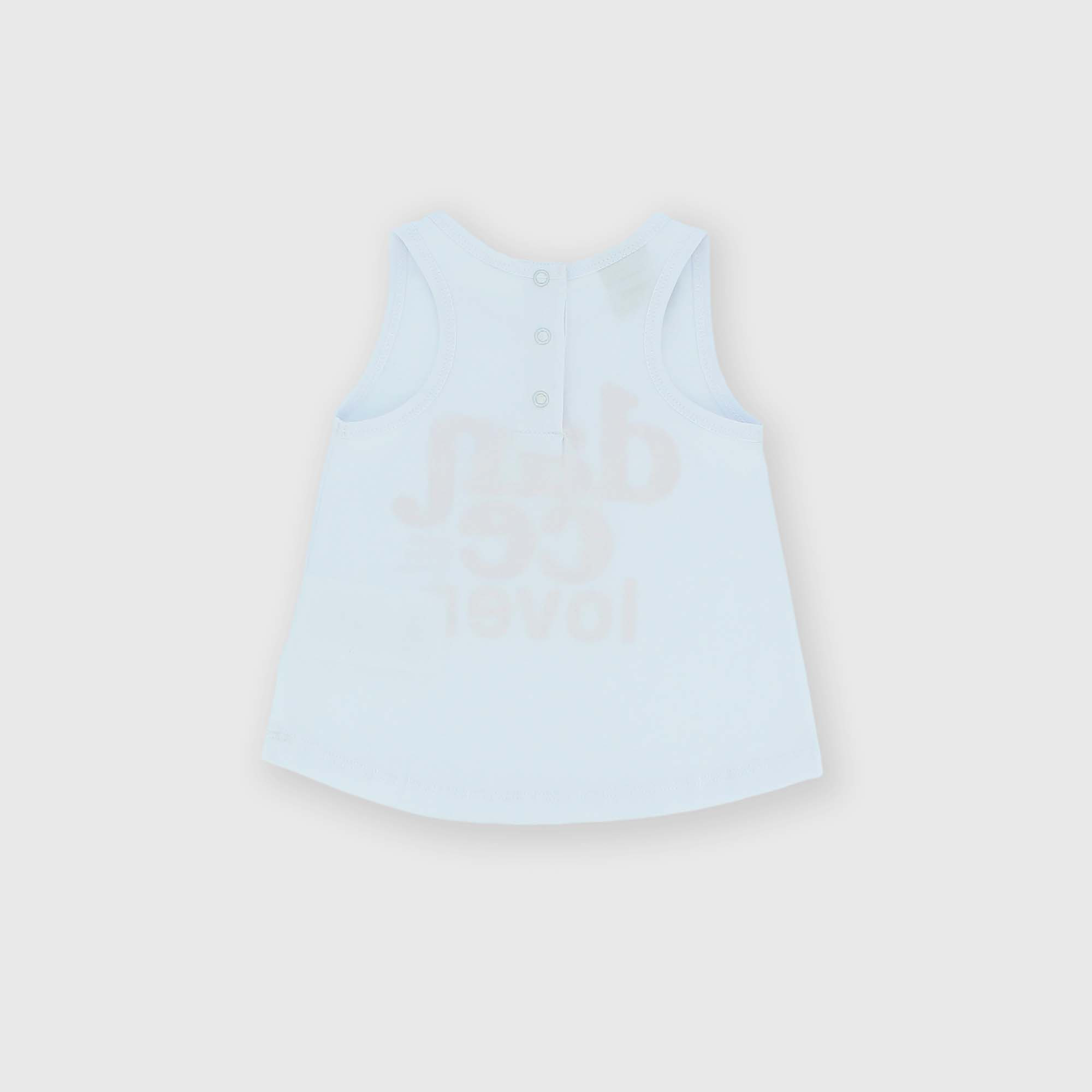 Canotta in Jersey, girocollo. Chiusura con bottoncini automatici sul retro. Stampa con scritte effetto gommato sul davanti.