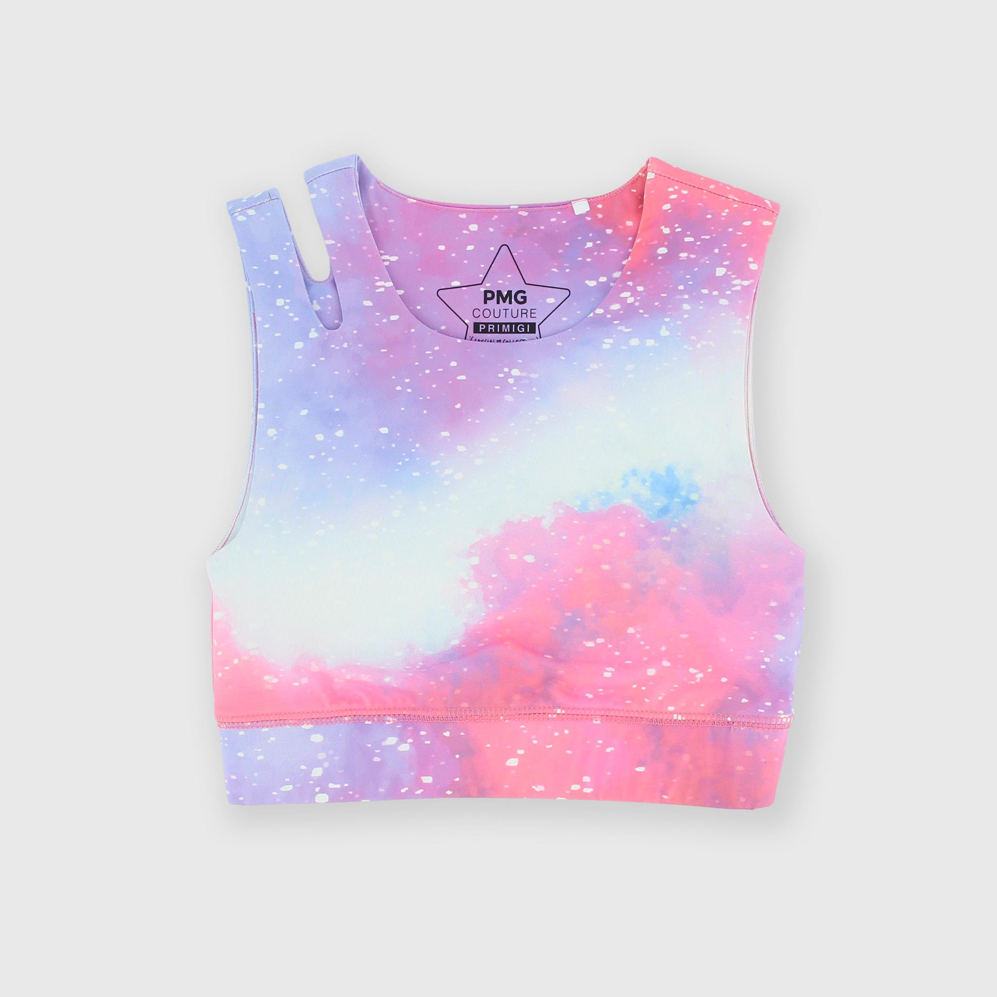 Top in tessuto tecnico stretch, girocollo, senza maniche. Stampa all-over. Fondo con elastico.