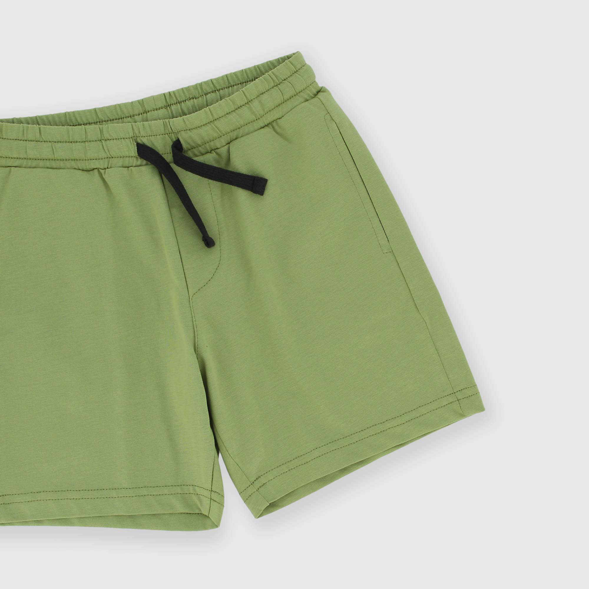 Bermuda in Jersey con vita elasticizzata e lacci frontali a contrasto. Tasche laterali a scomparsa.