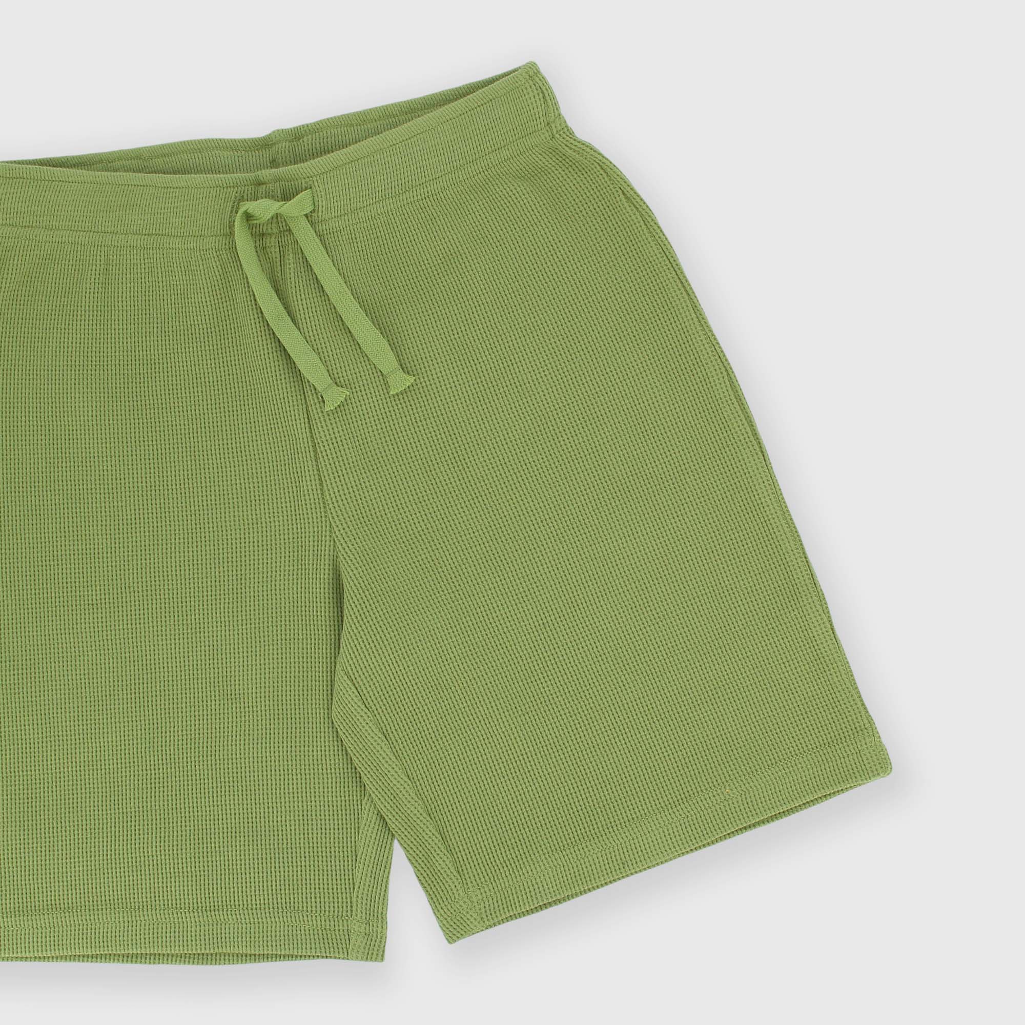 Bermuda con vita elasticizzata e lacci frontali. Lavorazione effetto nido d'ape.