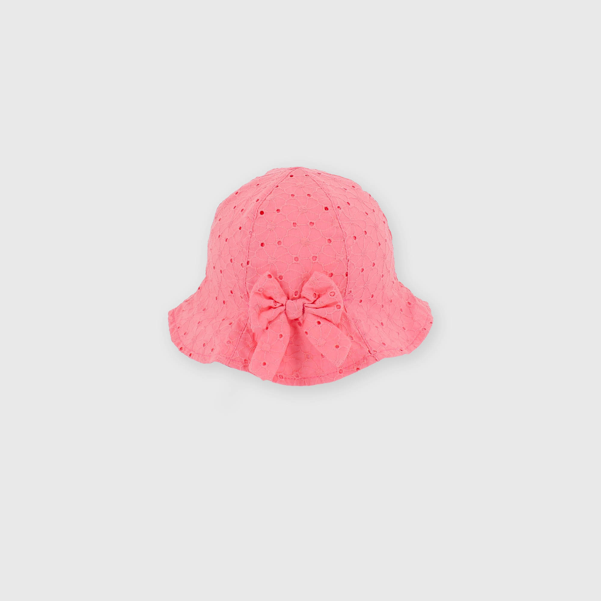 Cappello in pizzo con fiocchetto applicato. Chiusura con laccetti.