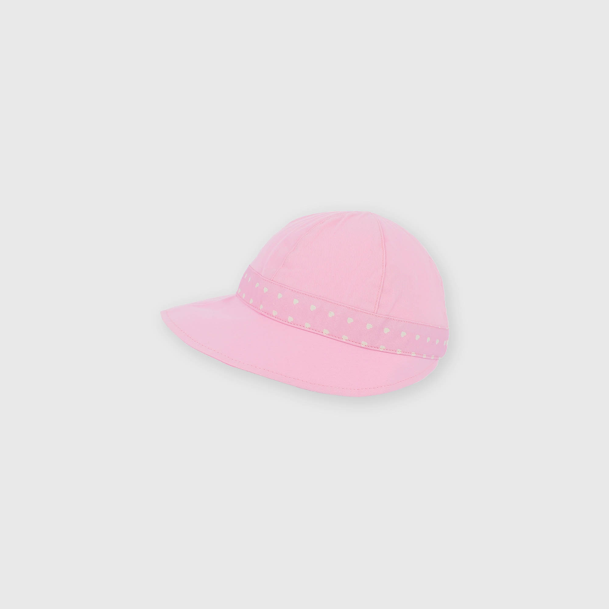 Cappello con nastrino con stampa cuori. Elastico sul retro.