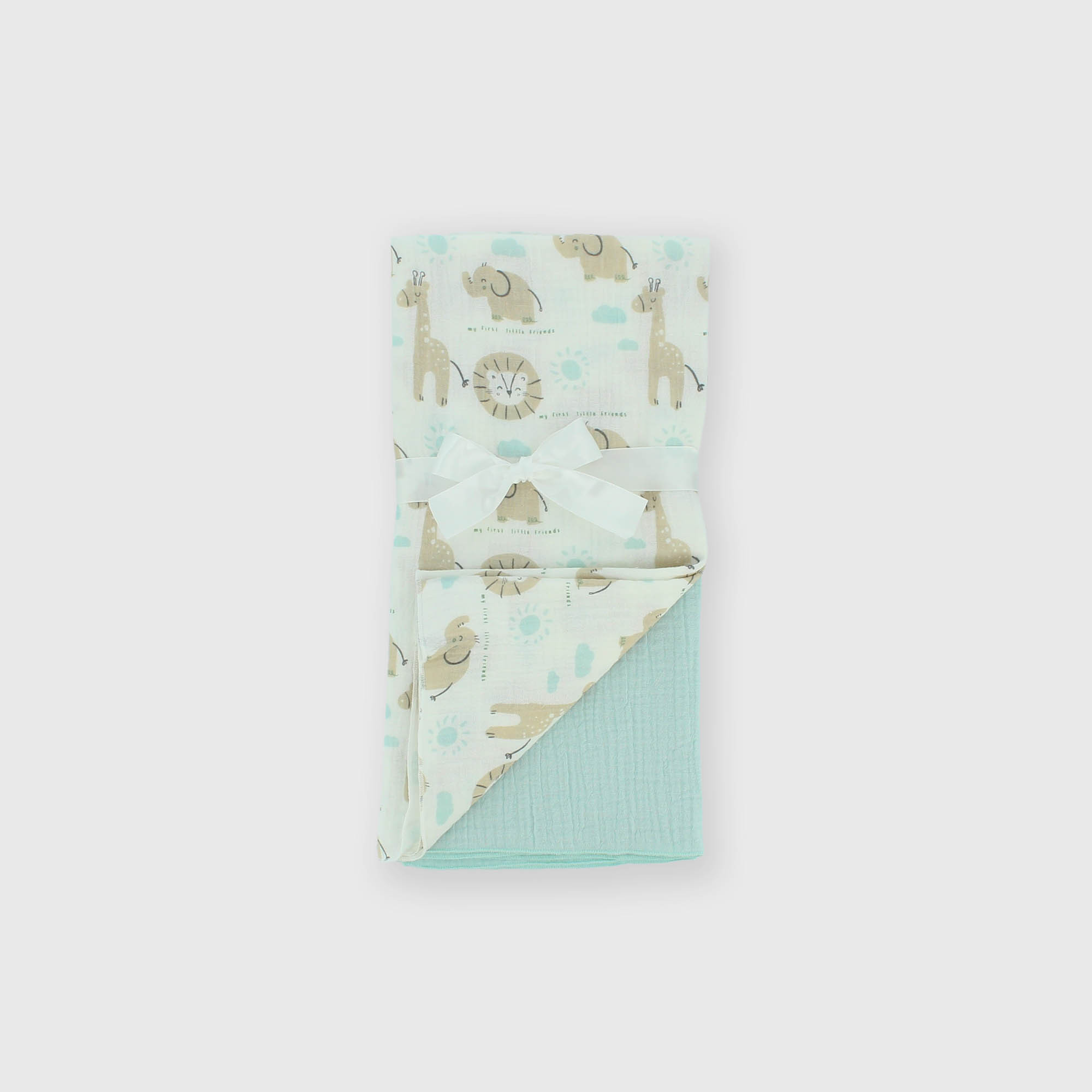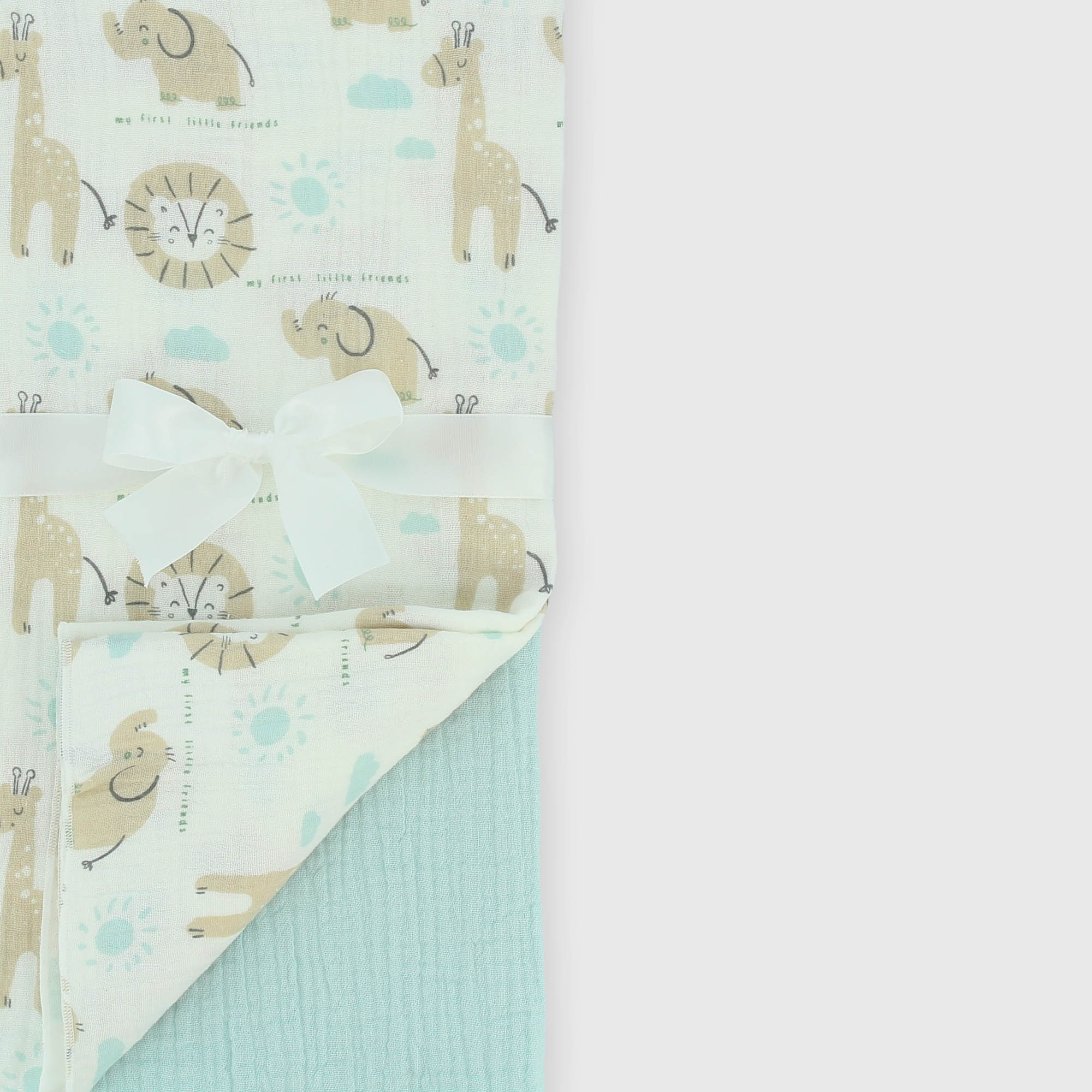 Confezione composta da due copertine in garza di cotone: una tinta unita, l'altra stampa all-over animaletti.