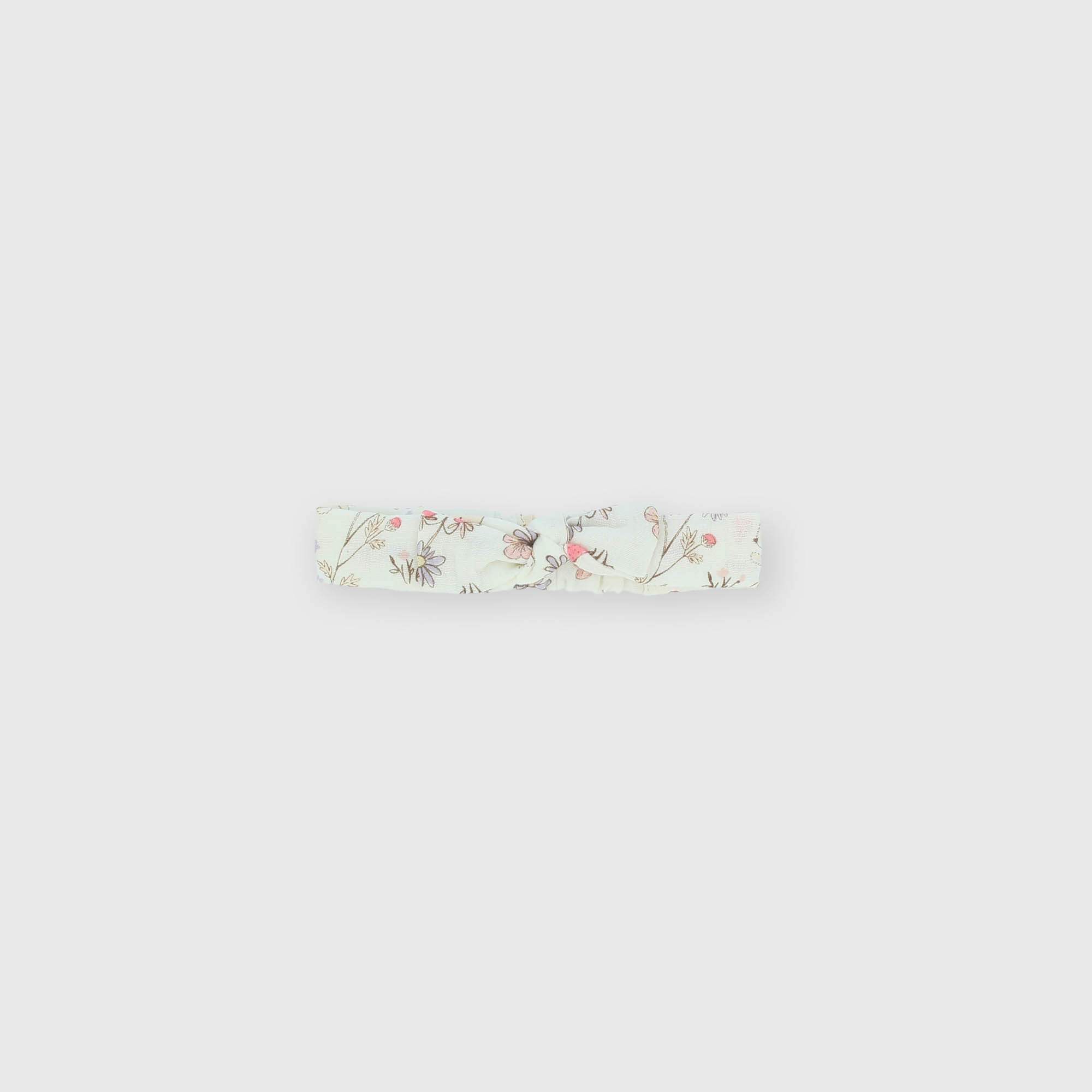 Fascia per capelli da neonata con fiocco centrale. Stampa all-over fiorellini e coniglietti.