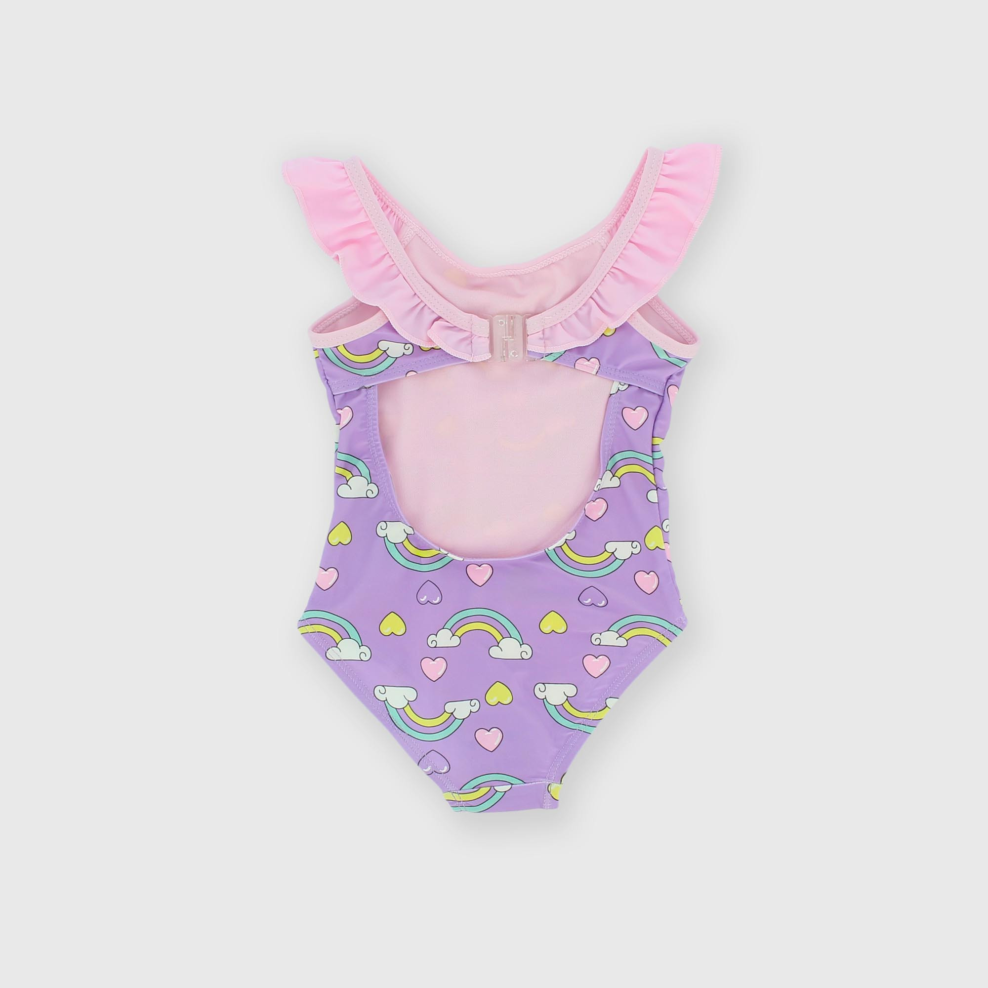 Costume intero con volants sulle bretelle. Chiusura con gancetto sul retro. Motivo arcobaleno.