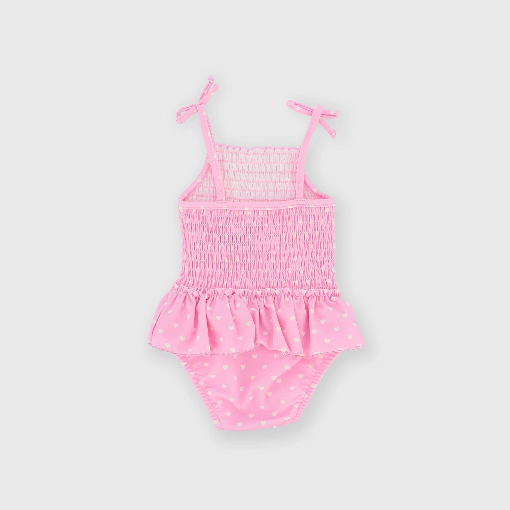 Costume intero con stampa all-over pois. Bretelline sottili con fiocchetto. Impunture elastiche sul torace. Volants in vita.