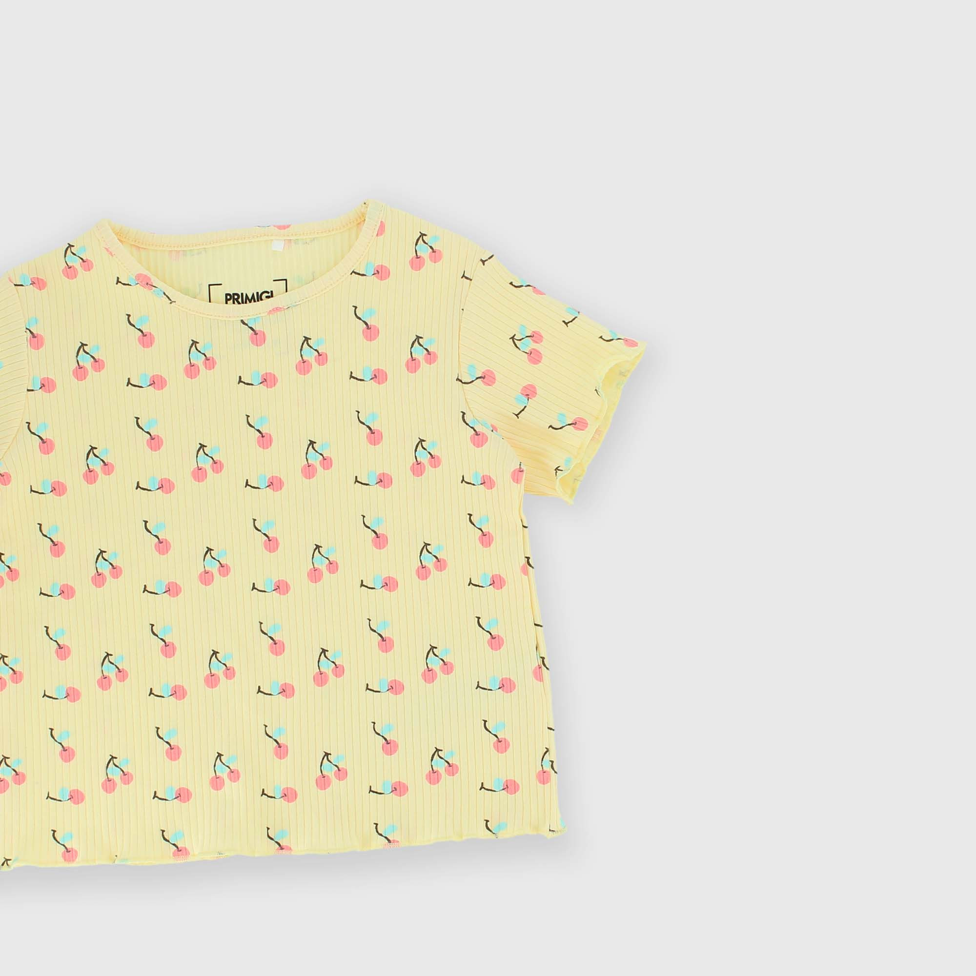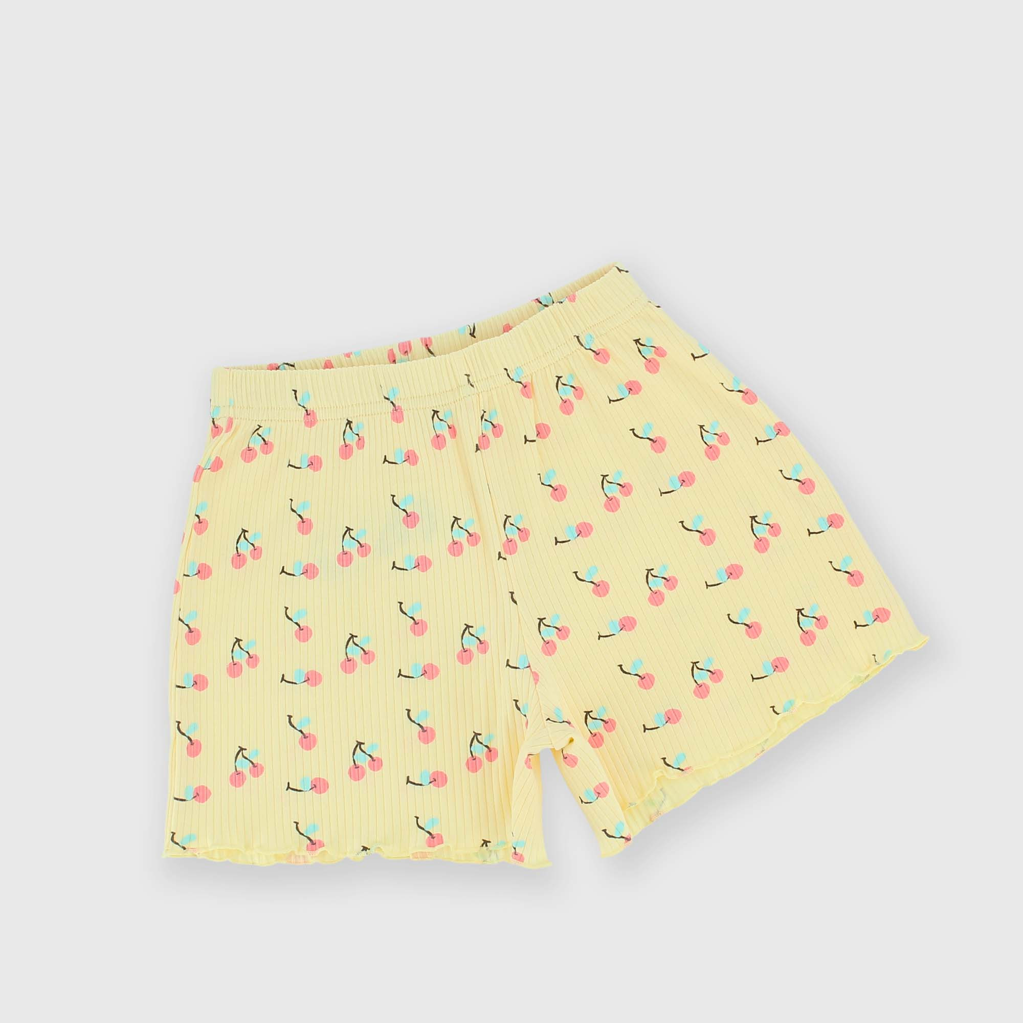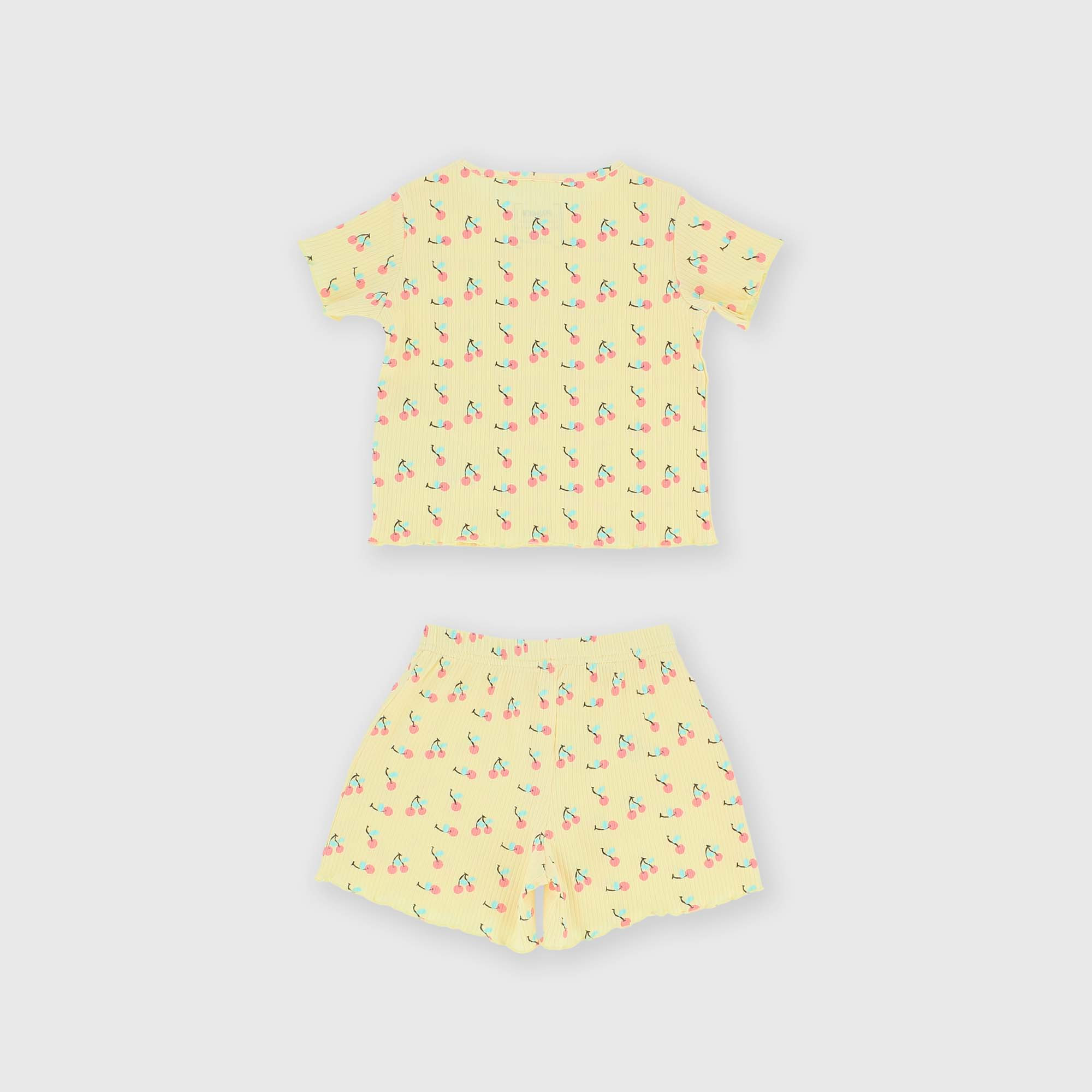 Completo pigiama in costina con stampa all-over. Maglietta girocollo a maniche corte. Shorts con vita elasticizzata. Rifiniture con punto bambola.