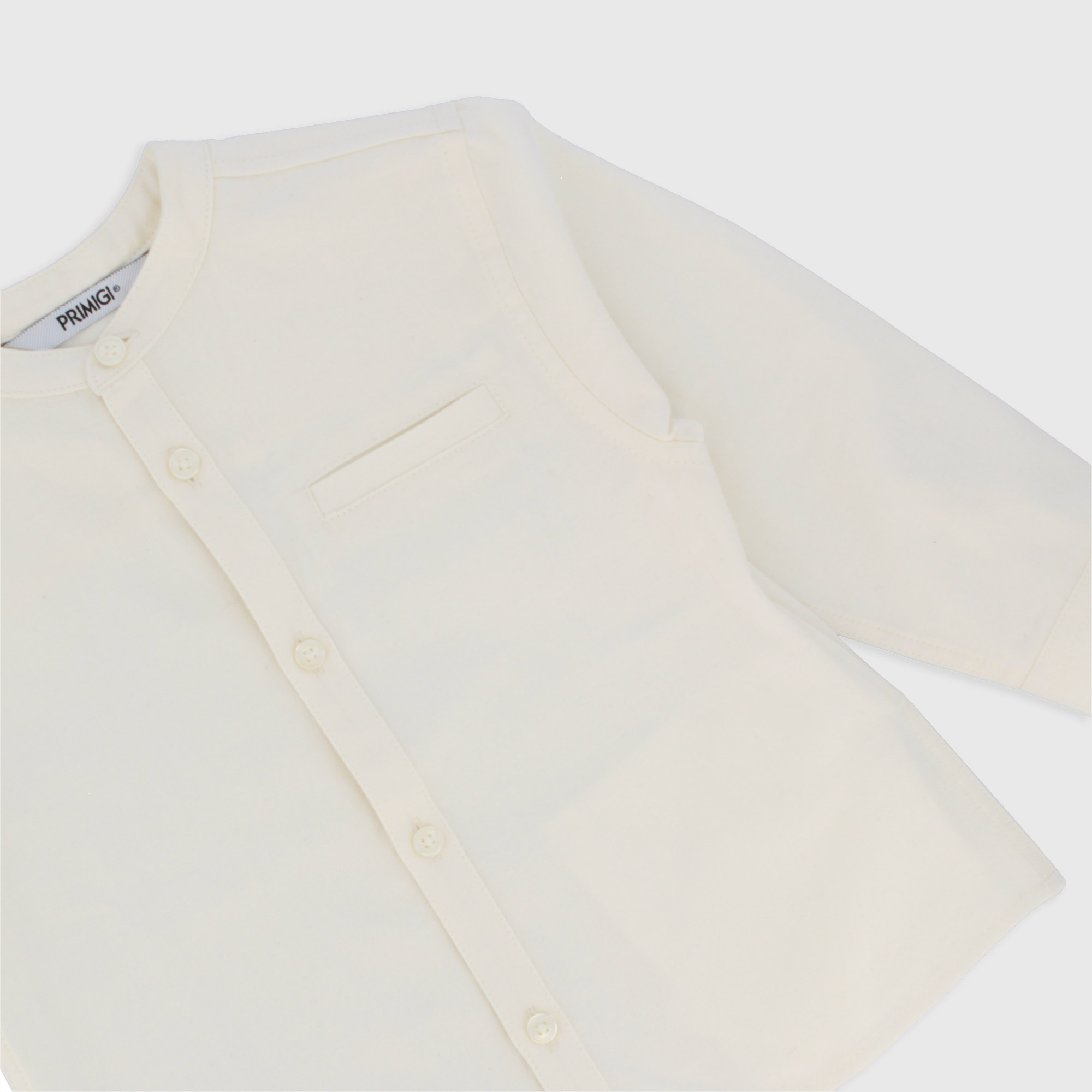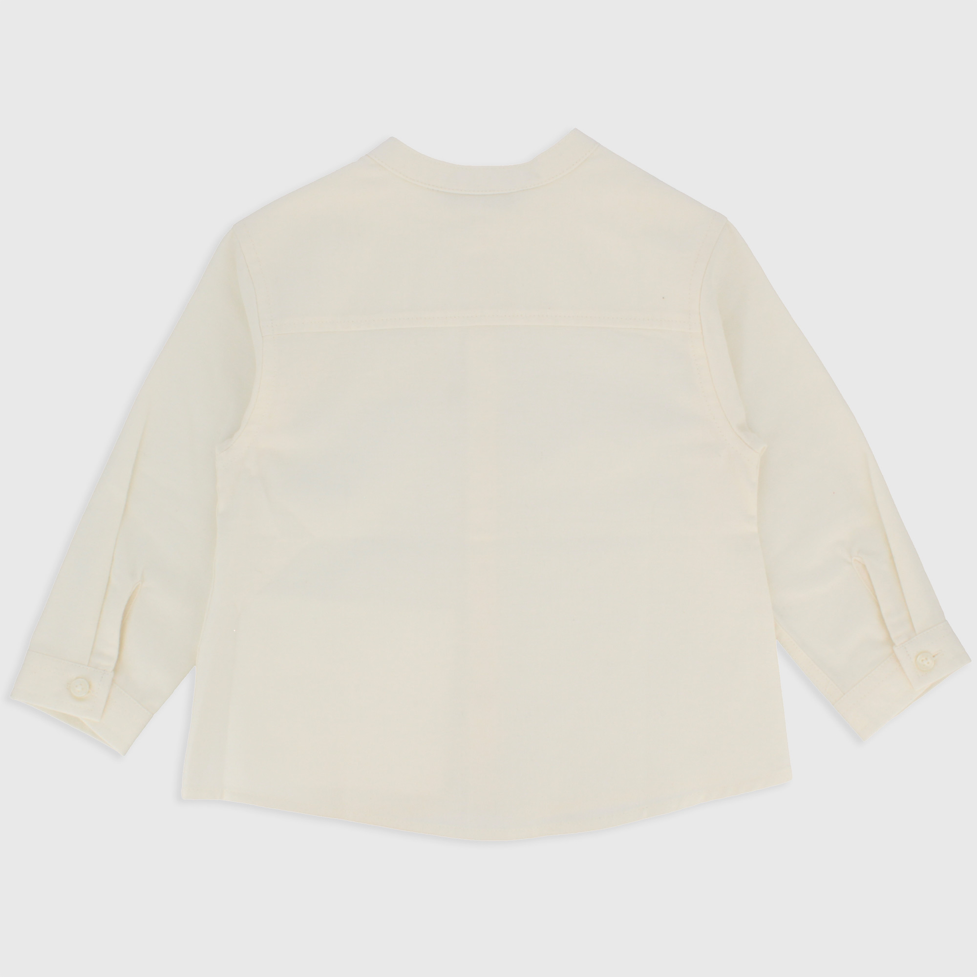 Camicia in cotone manopesca con collo alla coreana, a maniche lunghe. Chiusura con abbottonatura frontale. Finto taschino sul petto.