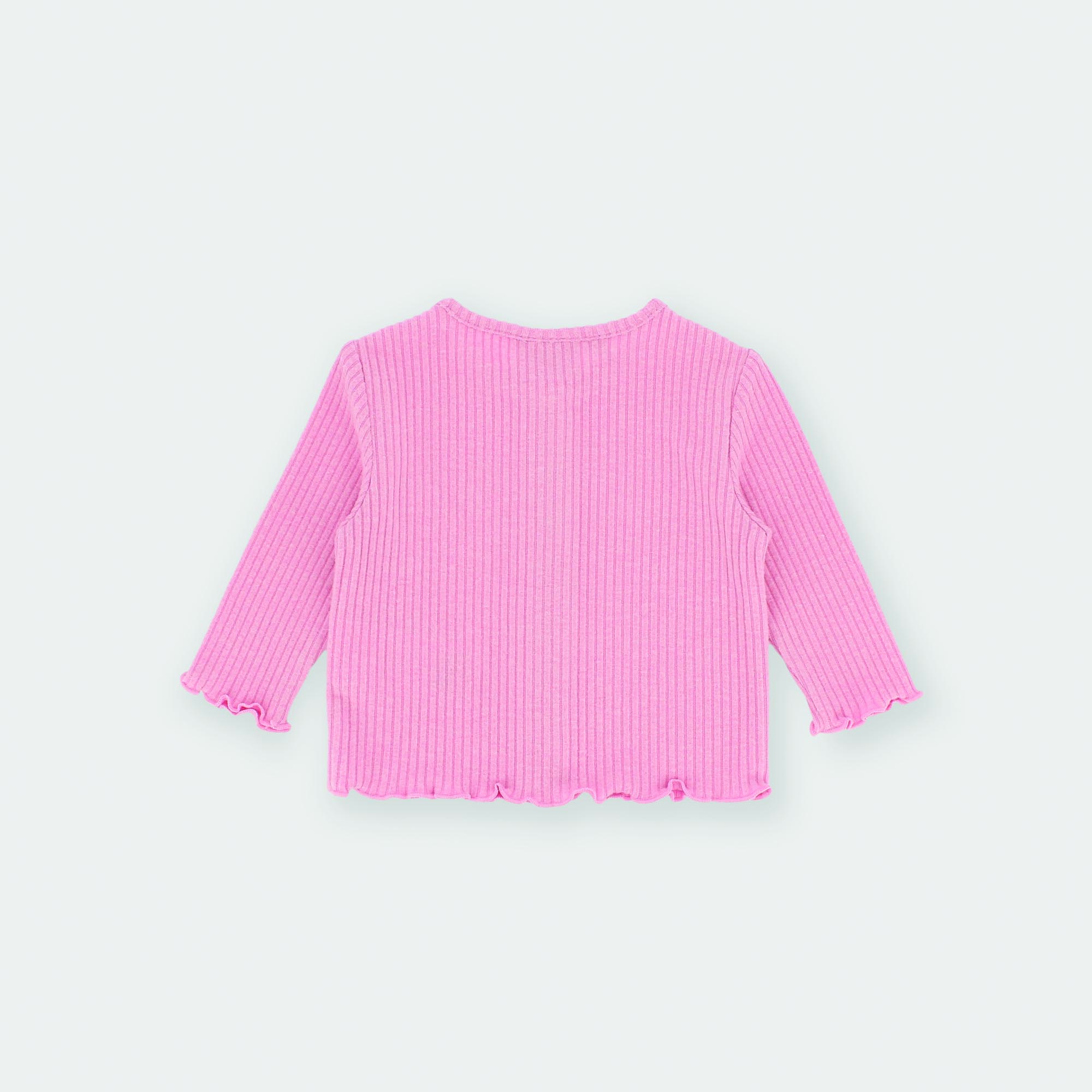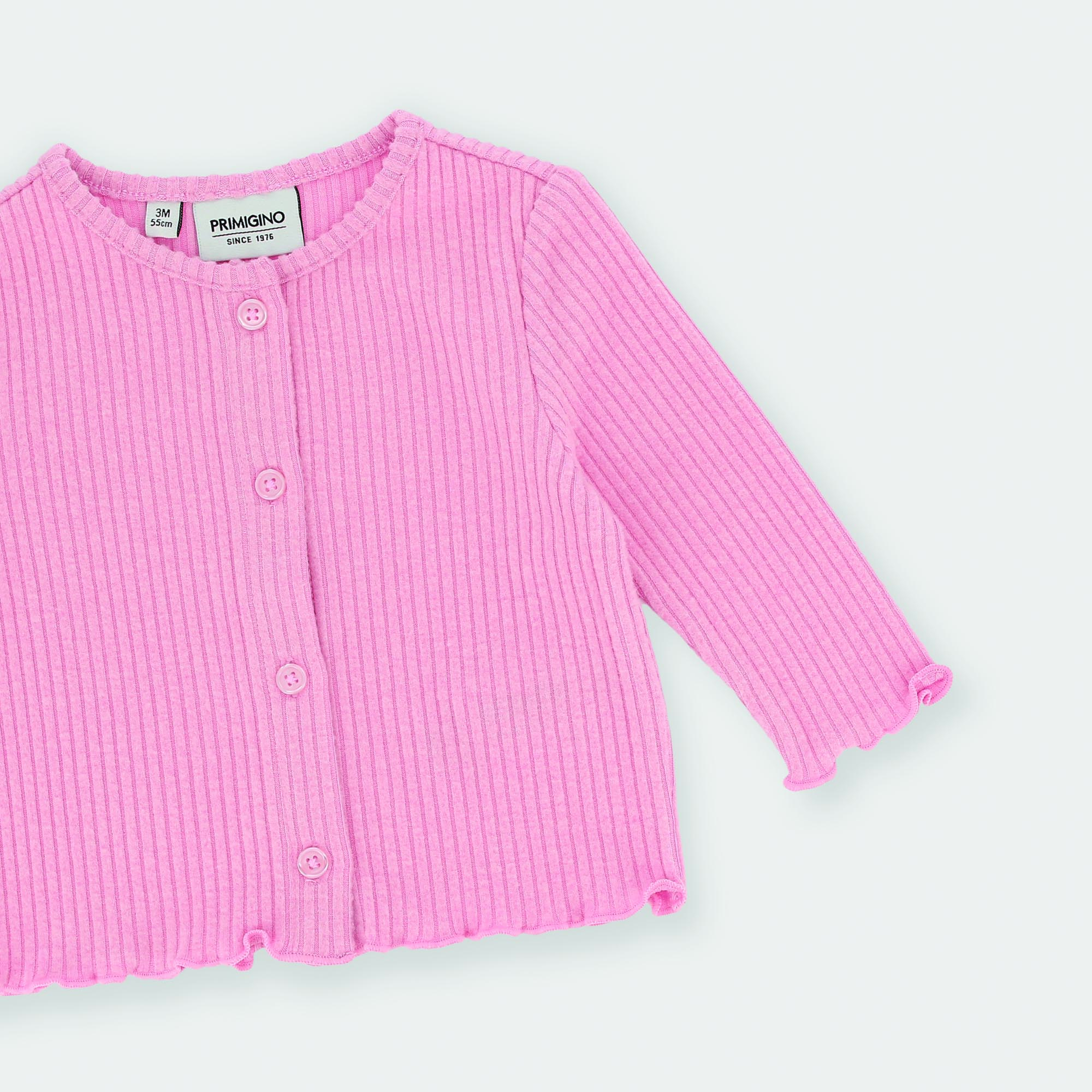 Cardigan in costina, girocollo. Chiusura con bottoncini sul davanti. Rifiniture con punto bambola.