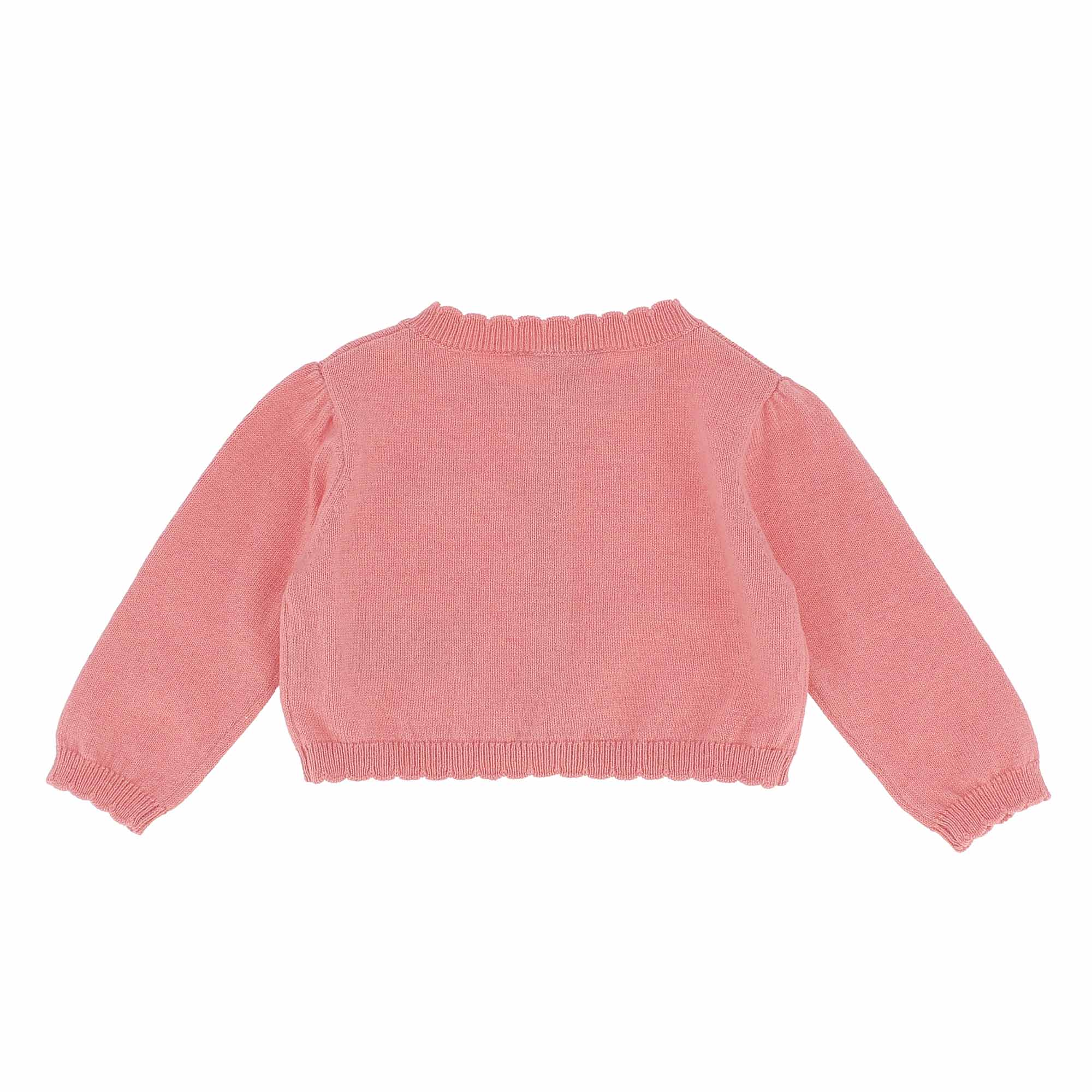 Cardigan in maglia, girocollo, a maniche lunghe. Chiusura con bottoni sul davanti. Profili smerlati e fiocchetto sul davanti.