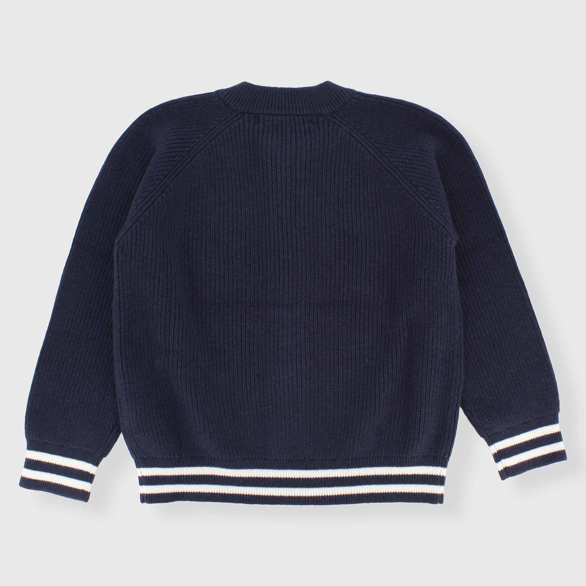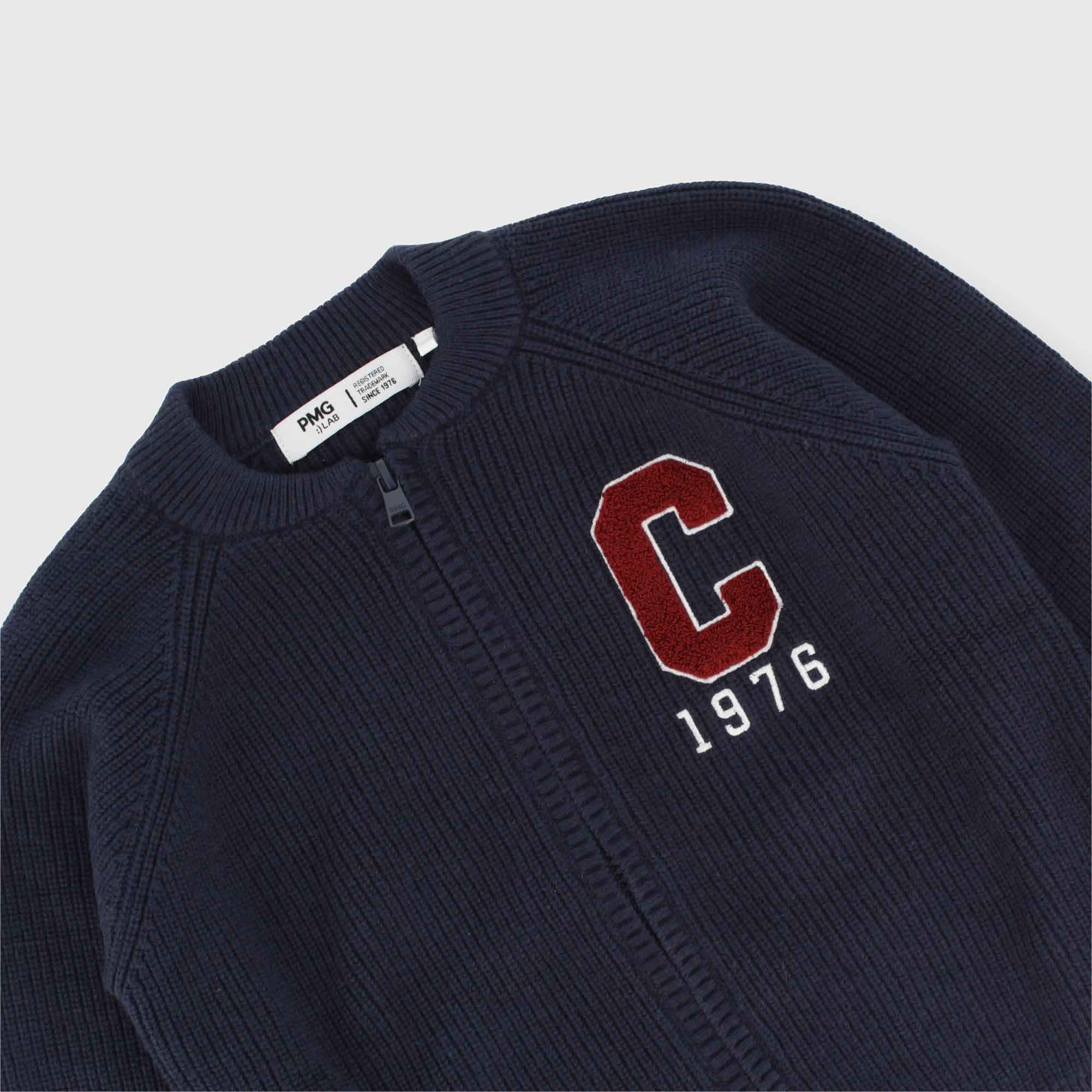 Cardigan in morbida maglia, modello bomber, a maniche lunghe. Chiusura frontale con zip. Patch punto spugna sul davanti. Polsini e fondo a righe.
