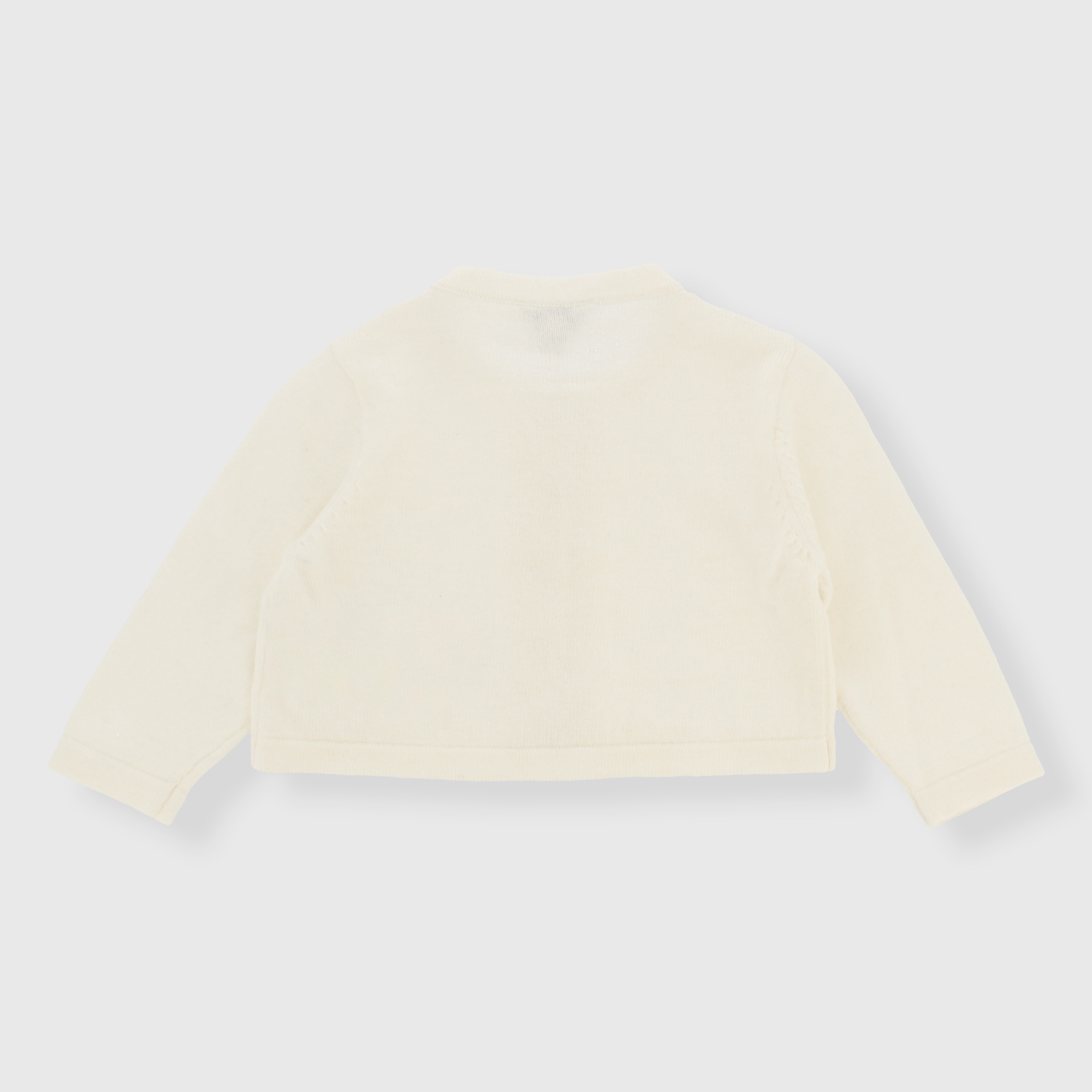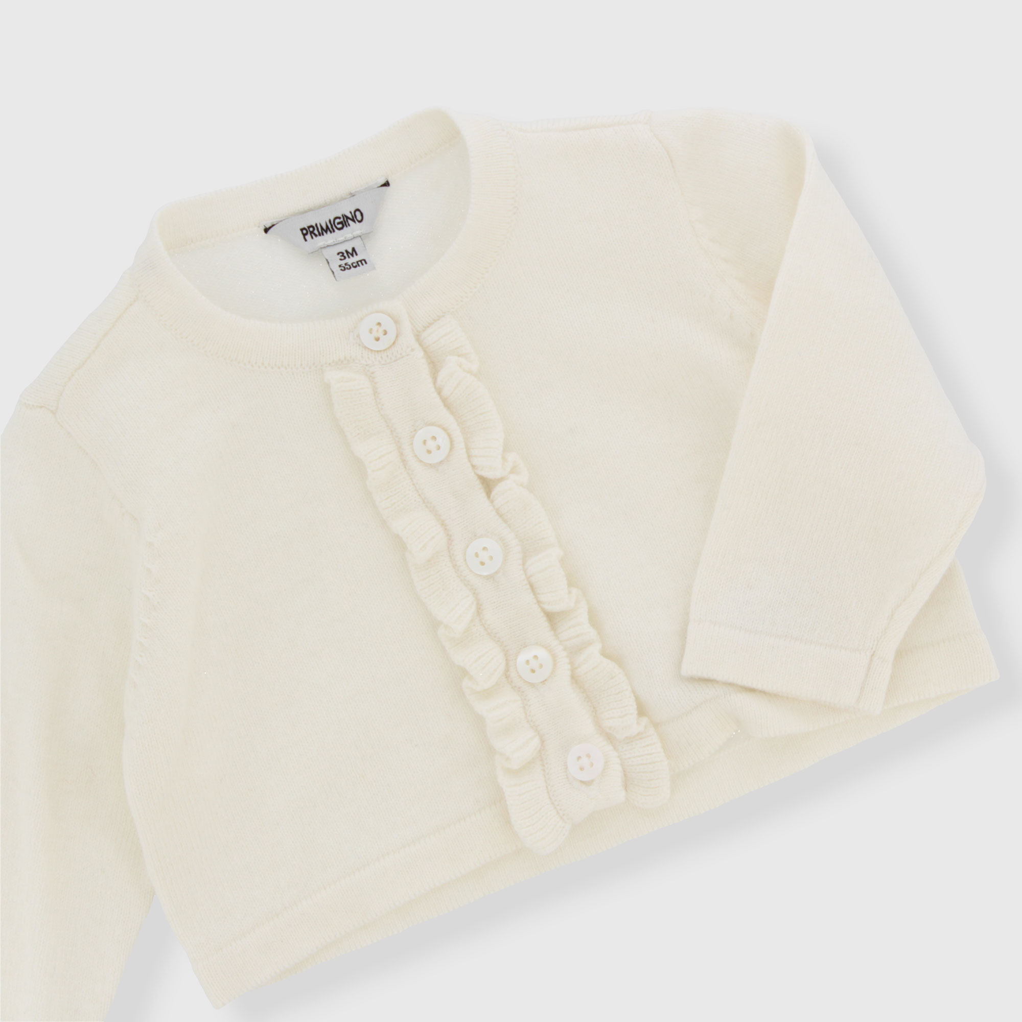 Cardigan in morbida maglia a maniche lunghe. Chiusura frontale con bottoni e volants applicati.