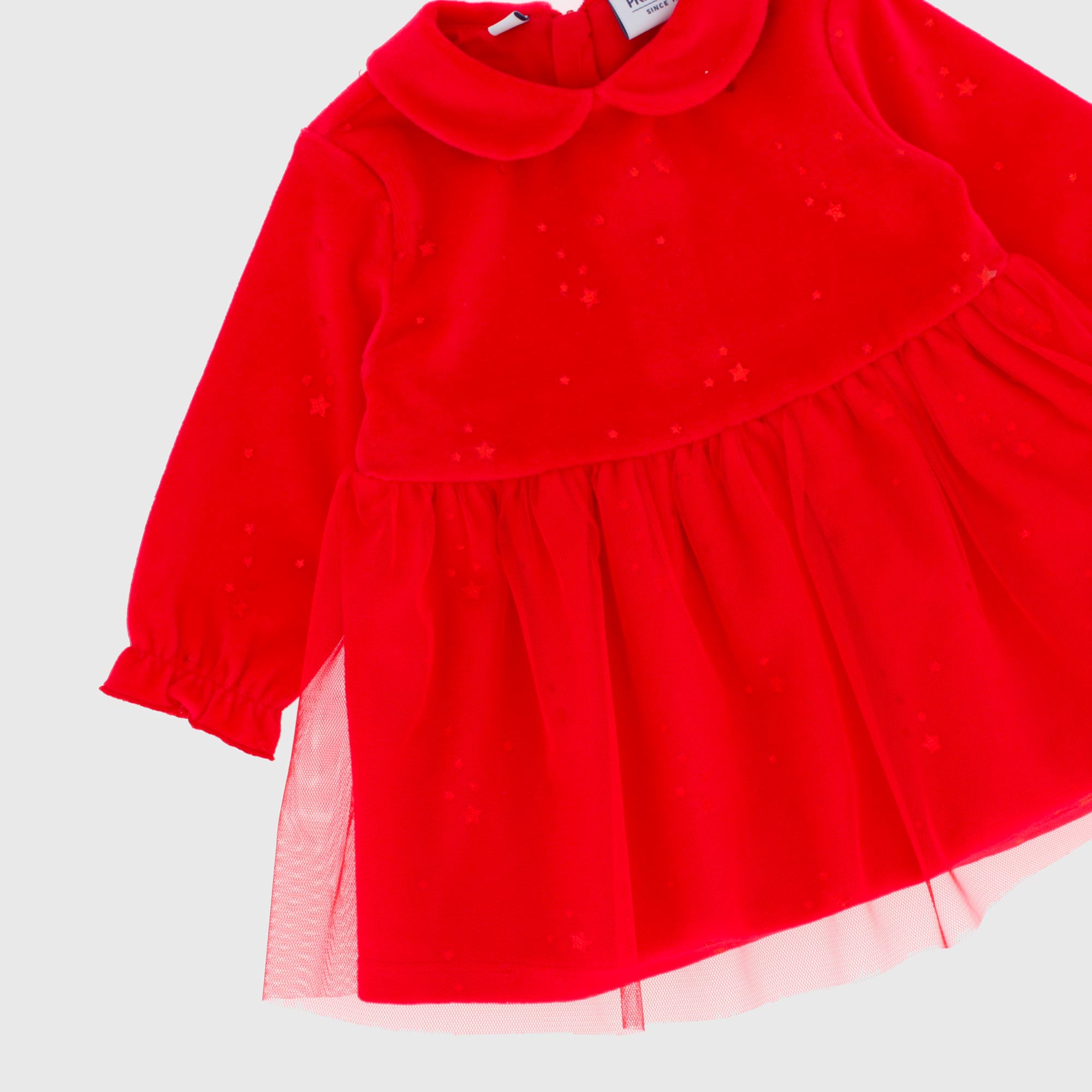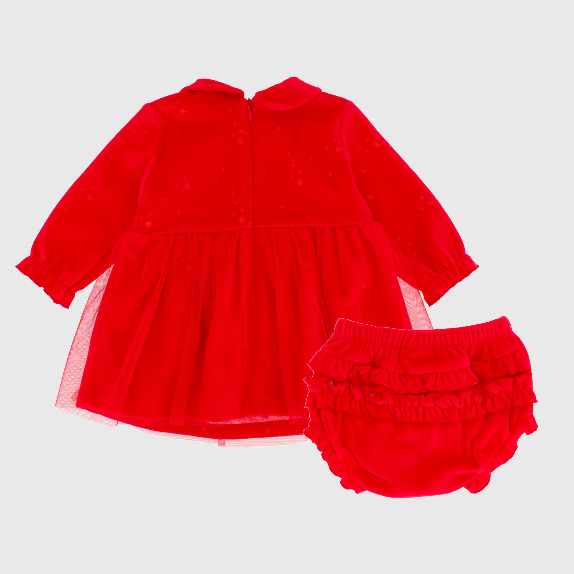 Vestito in ciniglia con colletto peter pan, a maniche lunghe. Chiusura con zip sul retro. Balza in tulle sulla gonna. Stampa all-over di stelle. Fodera interna. Culotte abbinata, con vita elasticizzata e volants sul retro.