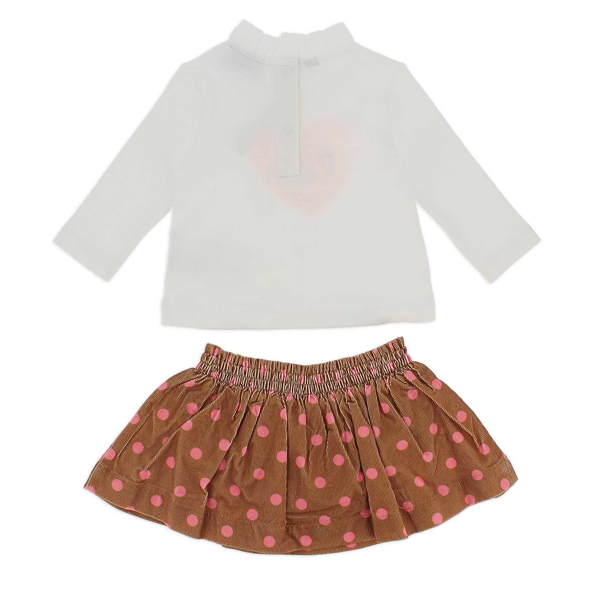 Completo composto da due pezzi. Maglietta in caldo cotone con colletto volant, a maniche lunghe. Chiusura con bottoncini automatici sul retro. Cuoricino stampato sul davanti e fiocchetto applicato. Gonna in velluto a costine stampato a pois, con culotte interna e vita elasticizzata.