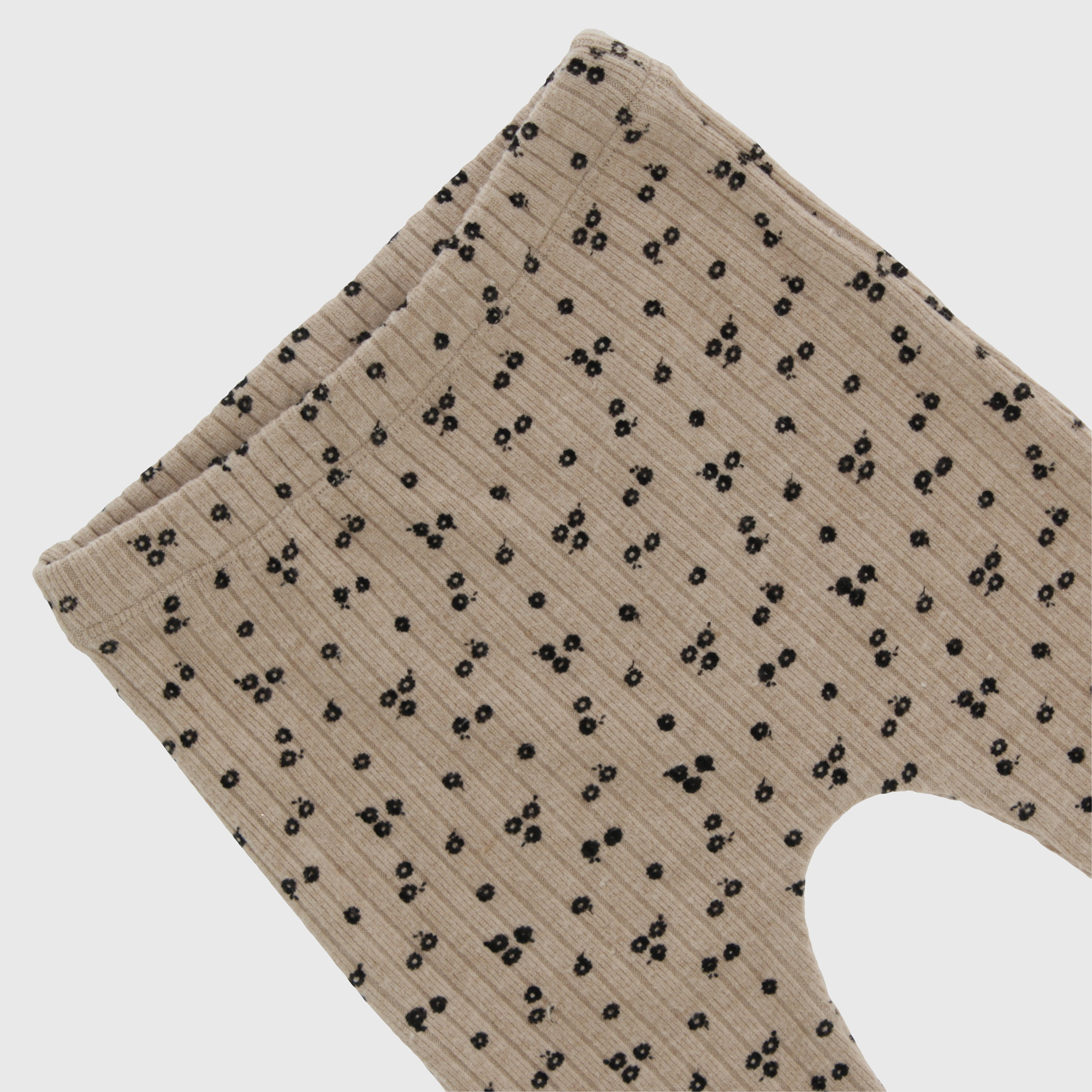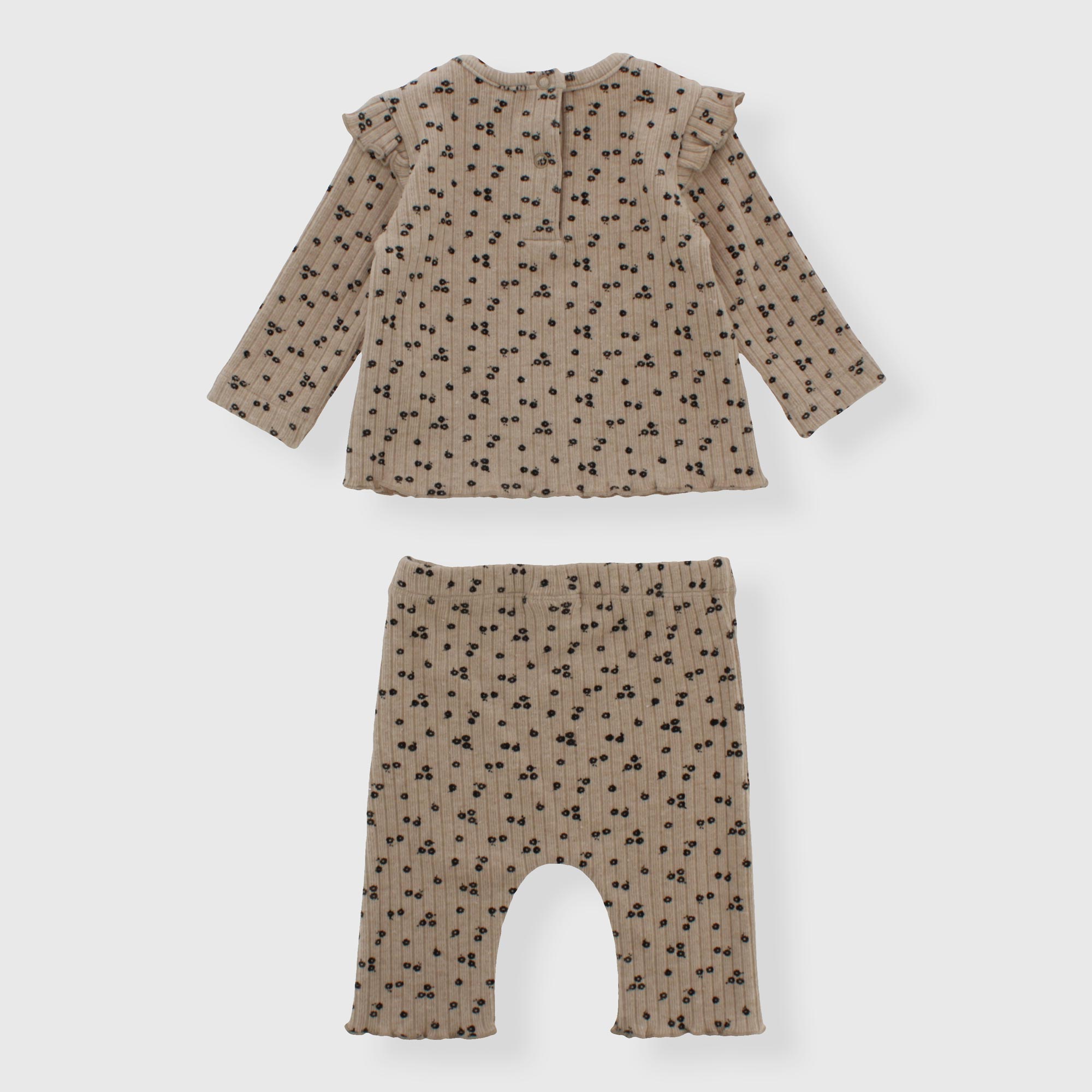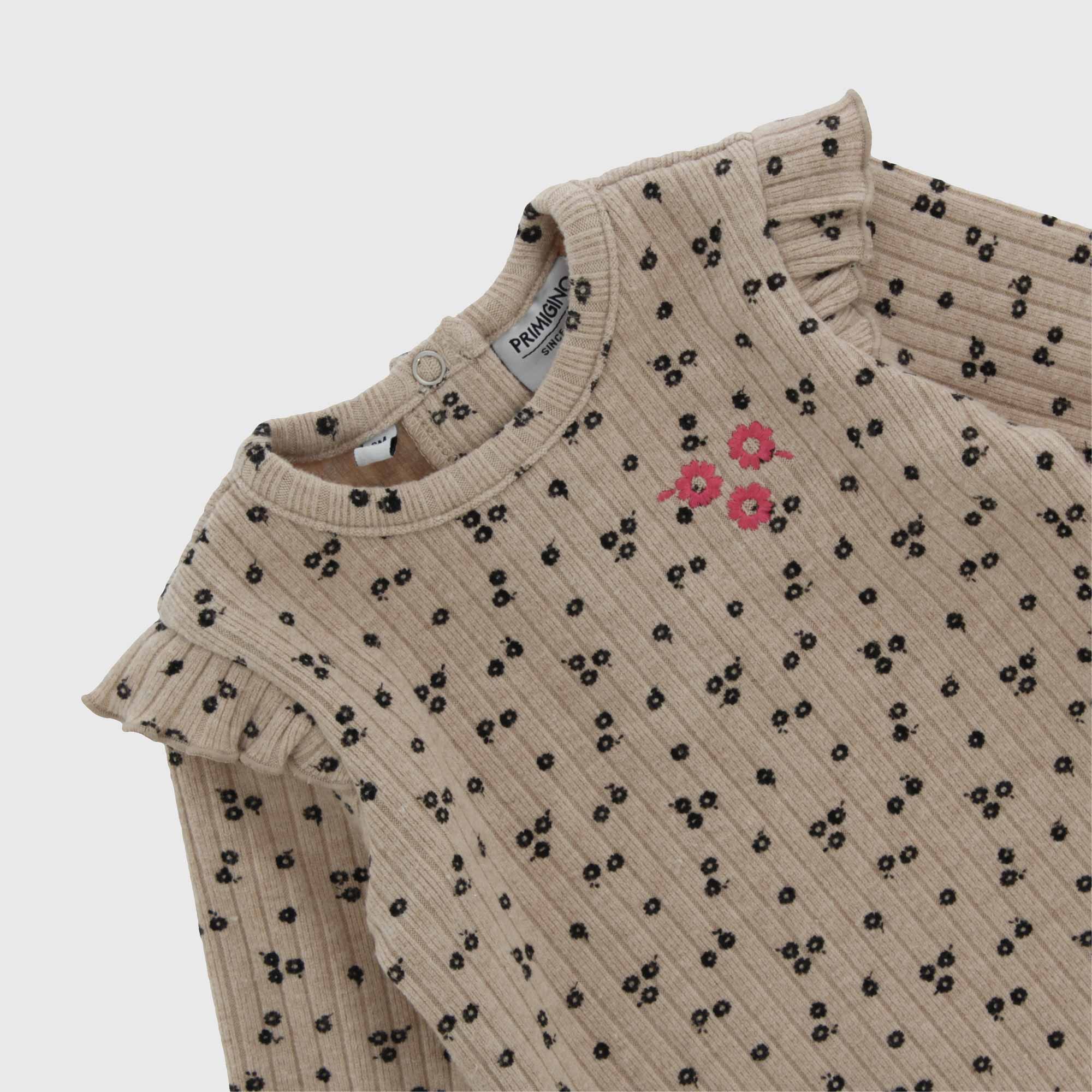 Completo composto da due pezzi, con stampa all-over fiorellini. Maglietta a costine, girocollo, con maniche lunghe. Chiusura con bottoncini automatici sul retro. Volants sulle spalle e ricamo sul davanti. Pantalone a costine con vita elasticizzata.