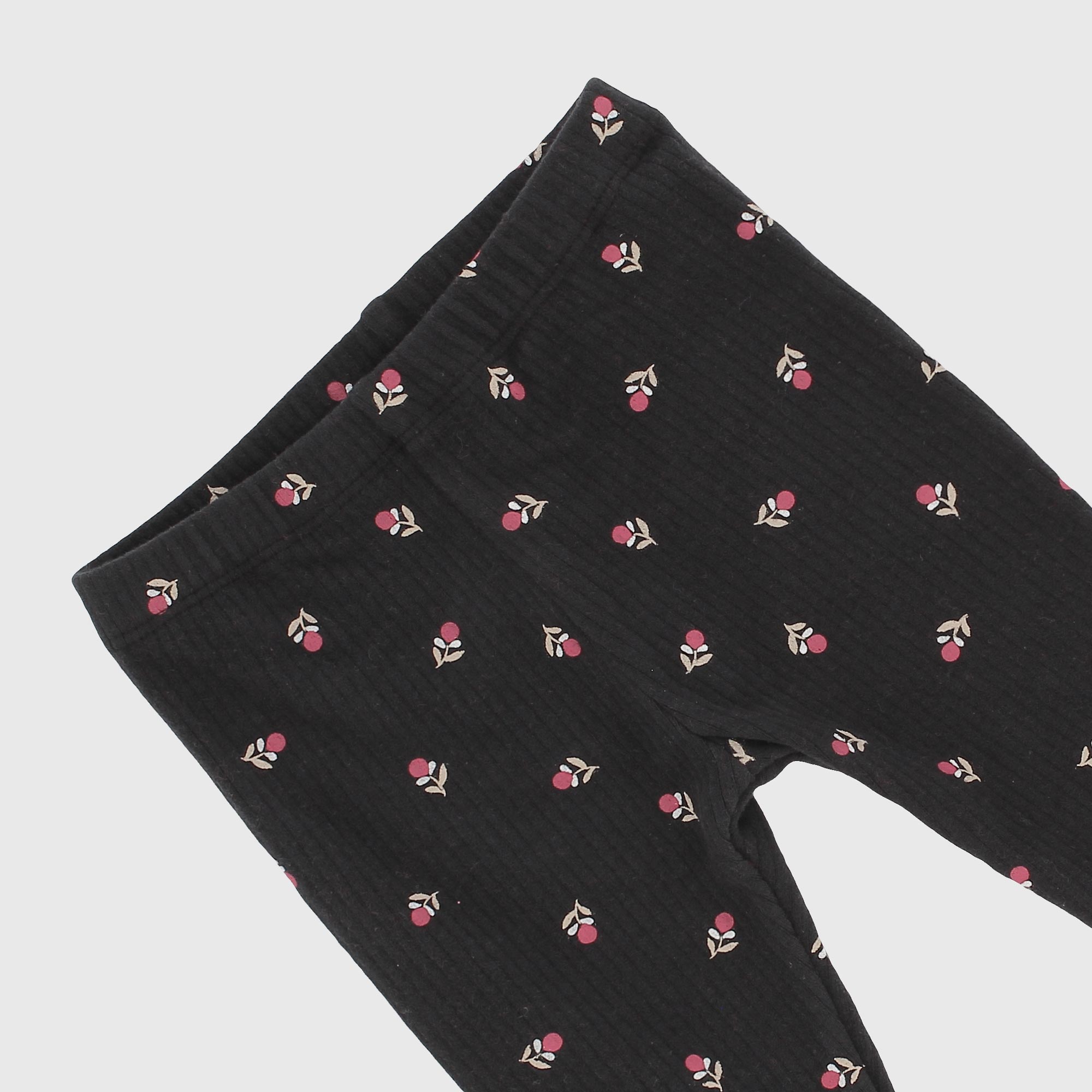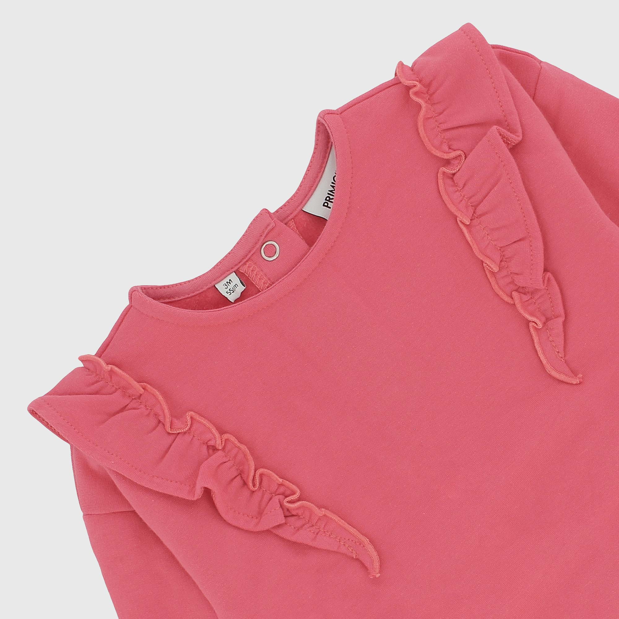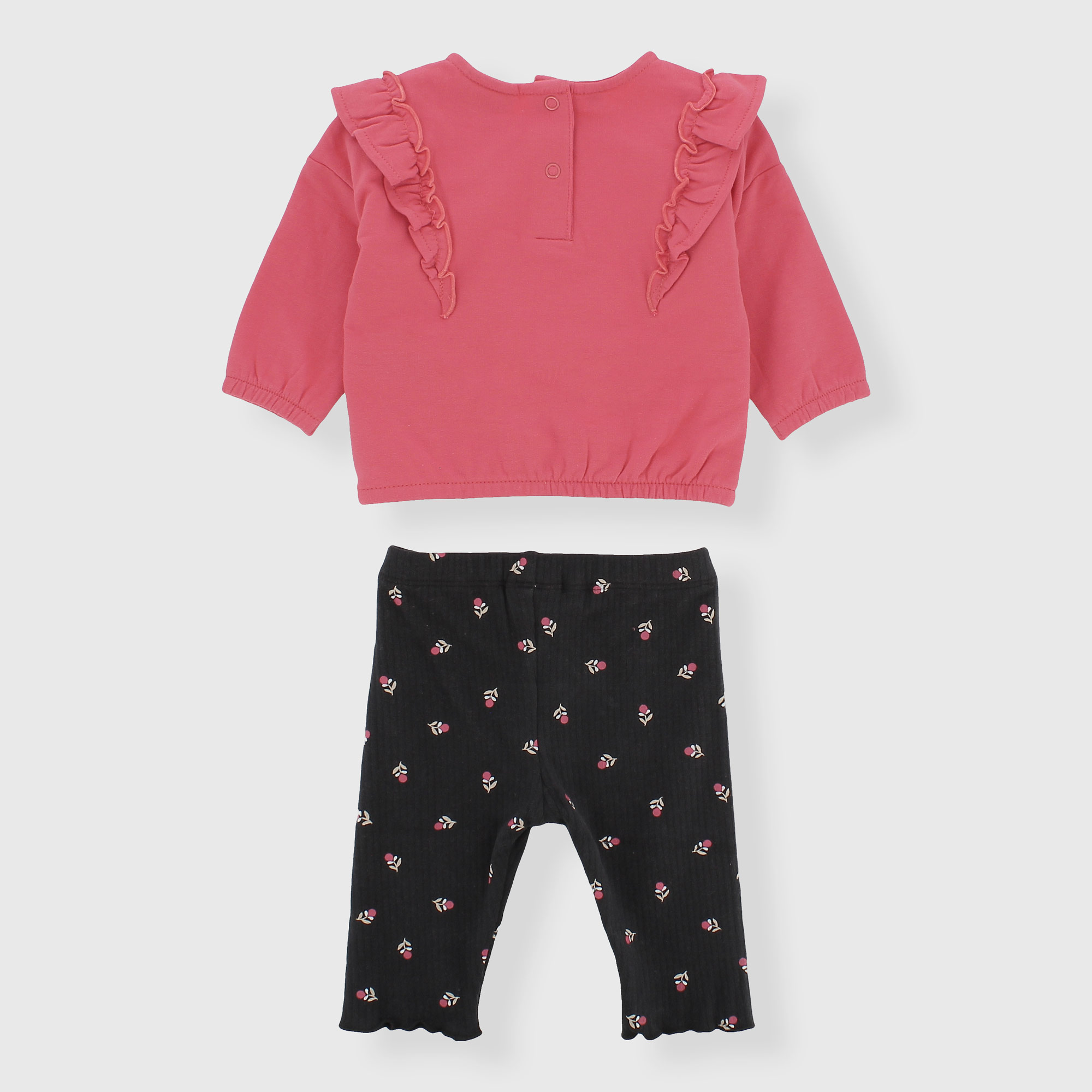 Completo composto da due pezzi. Felpa con morbido interno spazzolato, girocollo, a maniche lunghe. Chiusura con bottoncini automatici sul retro. Volants applicati. Leggings in costina con vita elasticizzata. Stampa all-over fiorellini.