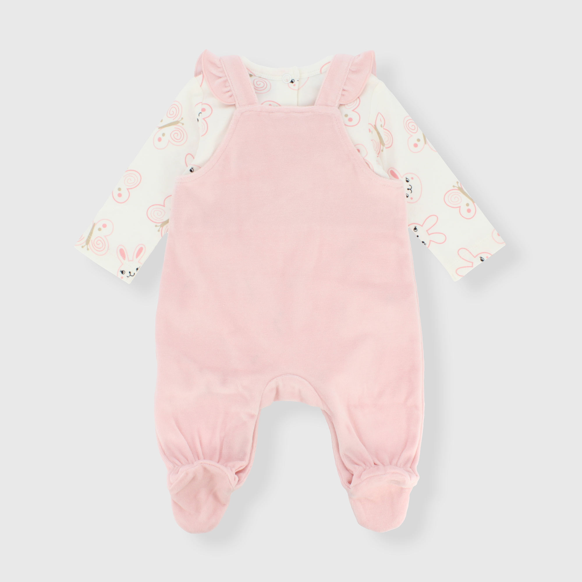 Completo composto da due pezzi. Body girocollo, con stampa all-over animaletti, a maniche lunghe. Chiusura con bottoncini automatici sul retro. Salopette in ciniglia con volants sulle bretelle. Chiusura con bottoncini sul davanti e sul cavallo. Applicazione ricamata Fiore sul davanti.