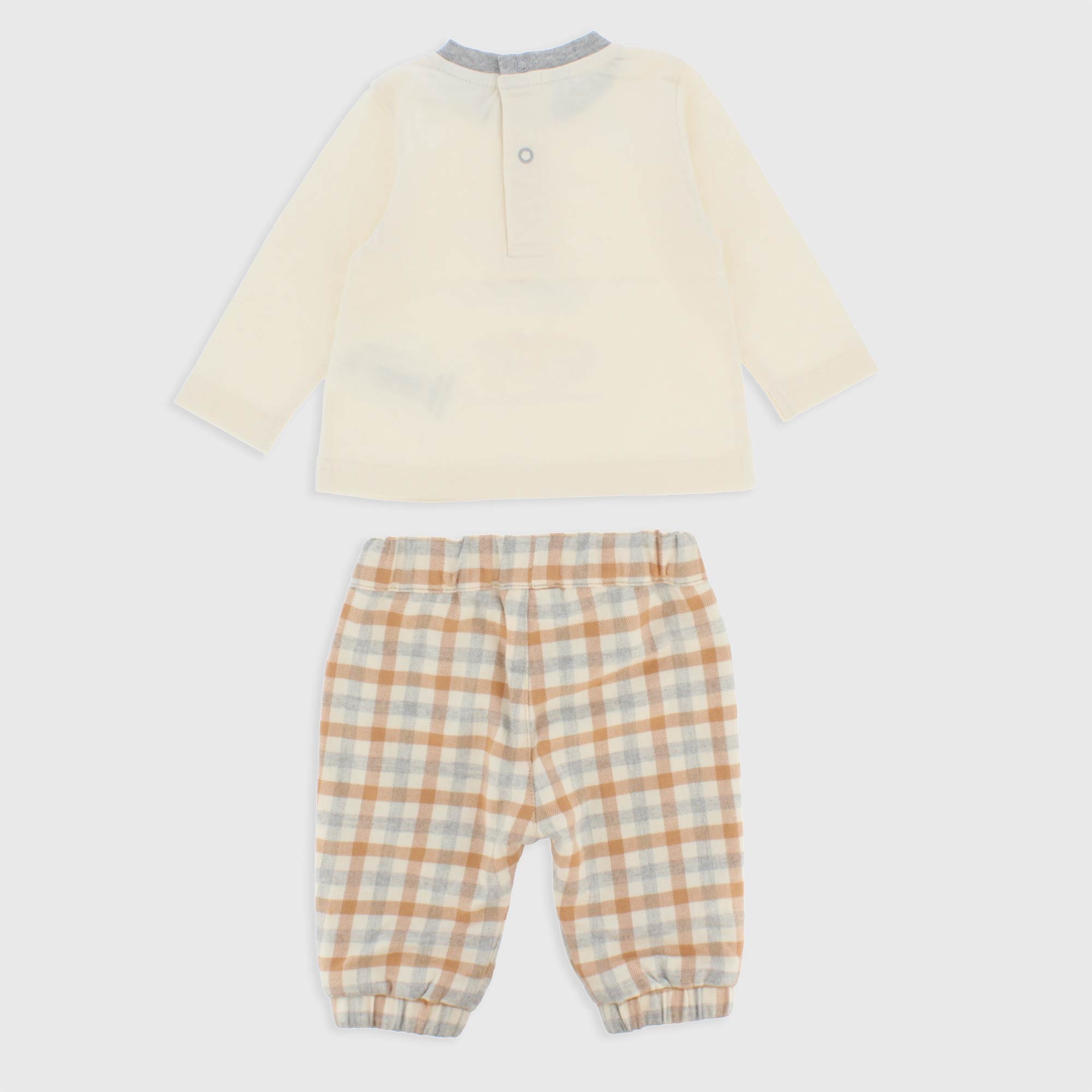 Completo composto da due pezzi. Maglietta in jersey girocollo, a maniche lunghe. Chiusura posteriore con bottoni automatici. Stampa sul davanti. Pantalone in panno effetto lana con vita elasticizzata.