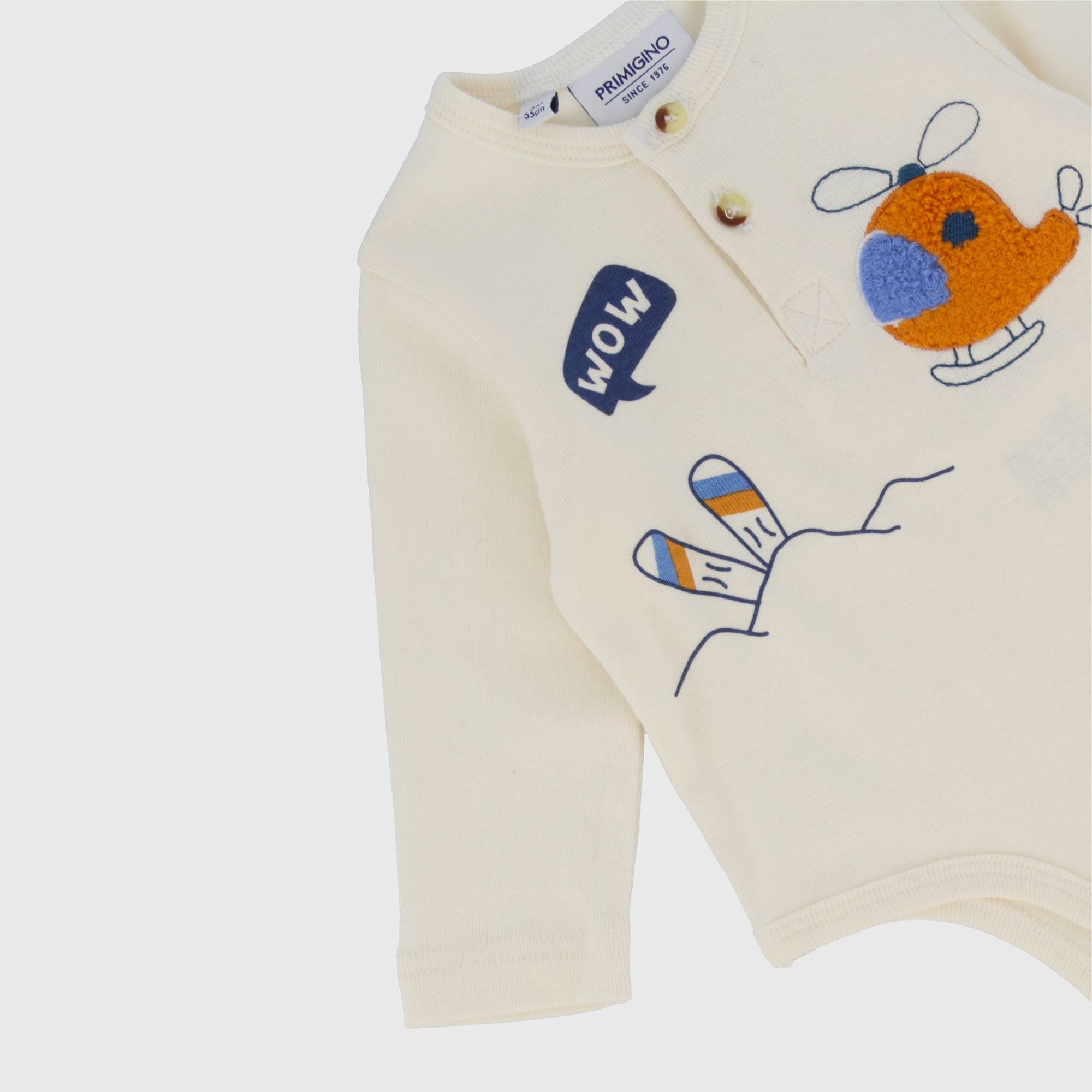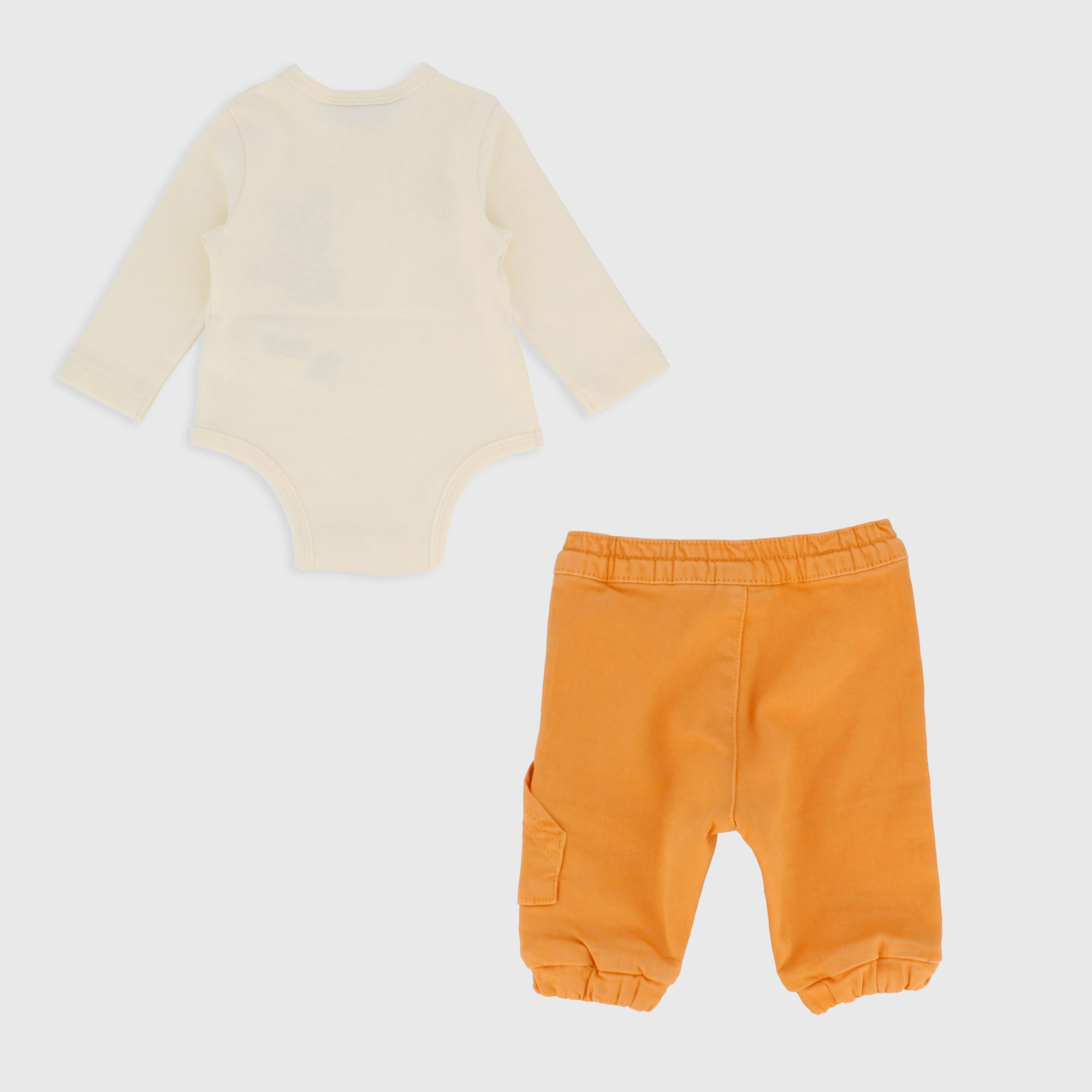 Completo composto da due pezzi. Body a serafino in jersey con costine, a maniche lunghe. Stampa con applicazione effetto spugna sul davanti. Pantalone in tela di cotone con bottoncino e vita elasticizzata. Taschina laterale e fondo con elastico.