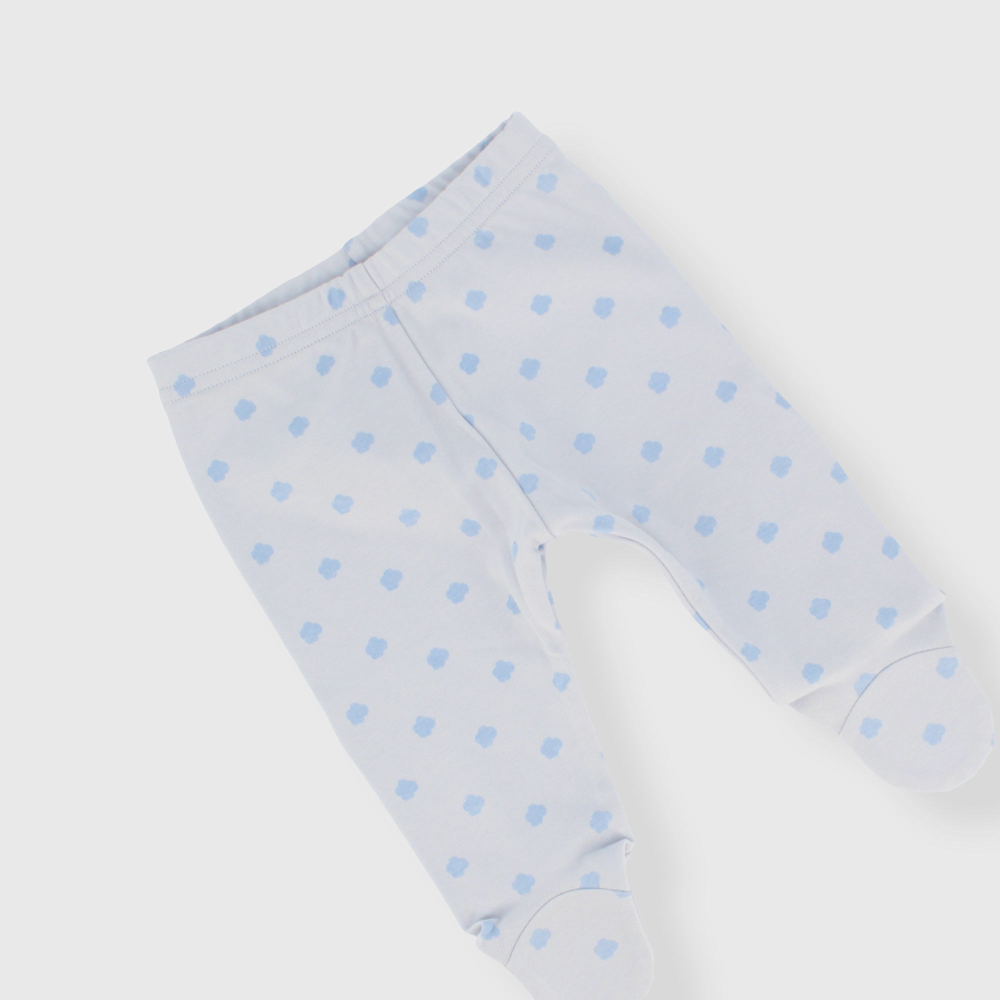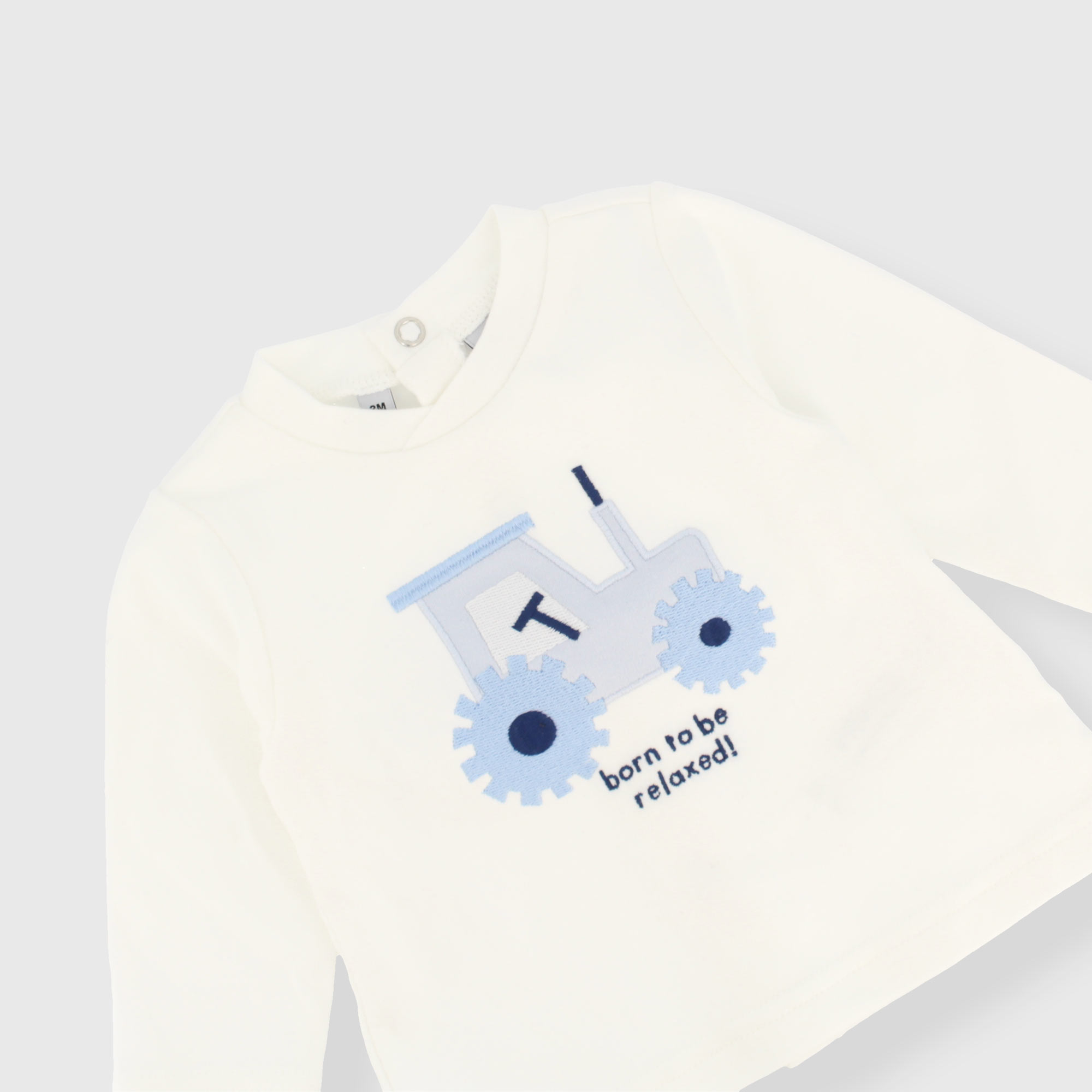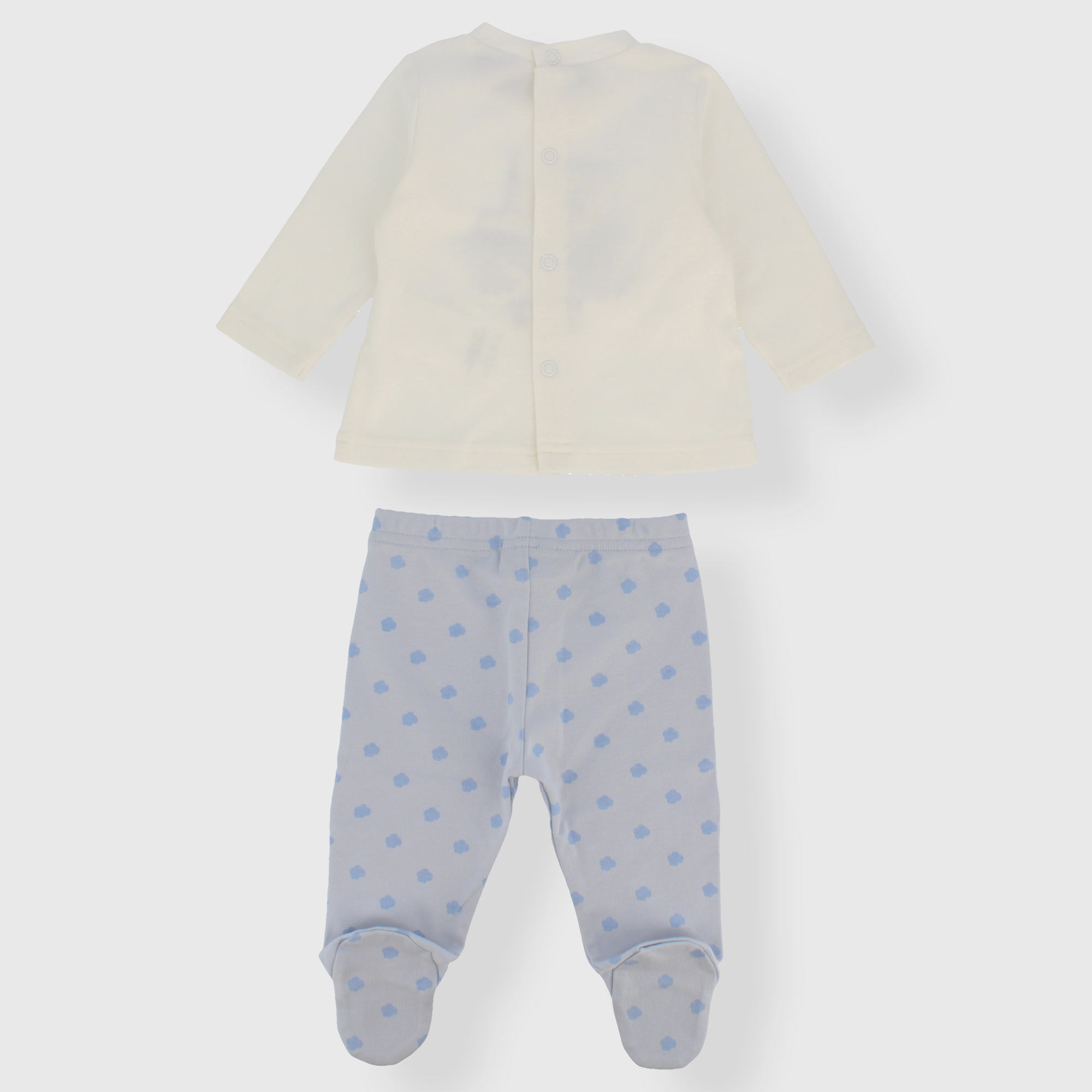 Completo composto da due pezzi. Maglietta in interlock girocollo, a maniche lunghe. Chiusura posteriore con bottoni automatici. Trattore ricamato sul davanti. Ghettina in interlock con vita elasticizzata e piedini, stampa all-over con nuvolette.