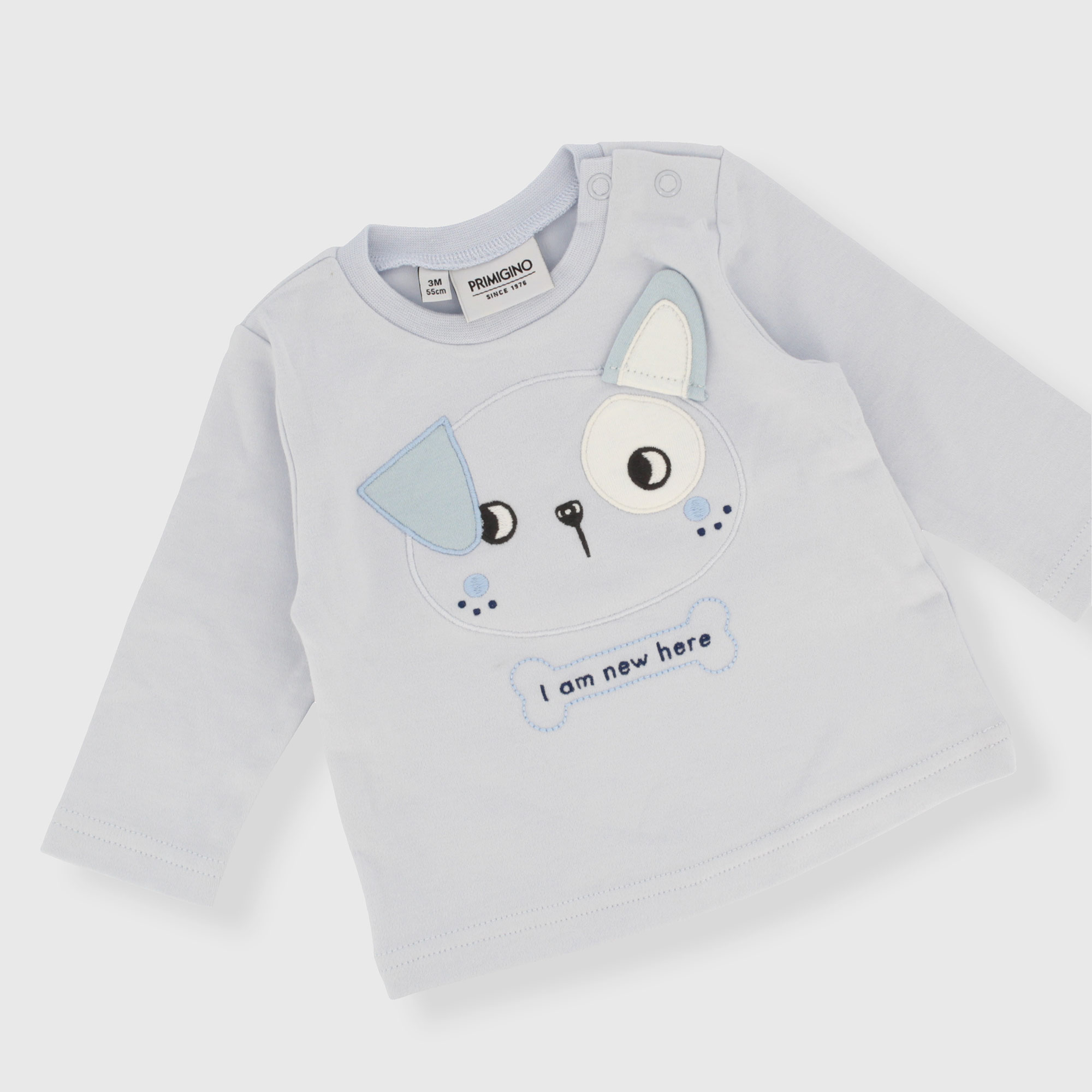 Completo composto da due pezzi. Maglietta in interlock girocollo, a maniche lunghe. Chiusura con bottoni automatici sulla spalla. Cagnolino ricamato con applicazione sul davanti. Pantaloni in interlock con righe tinto filo e vita elasticizzata.