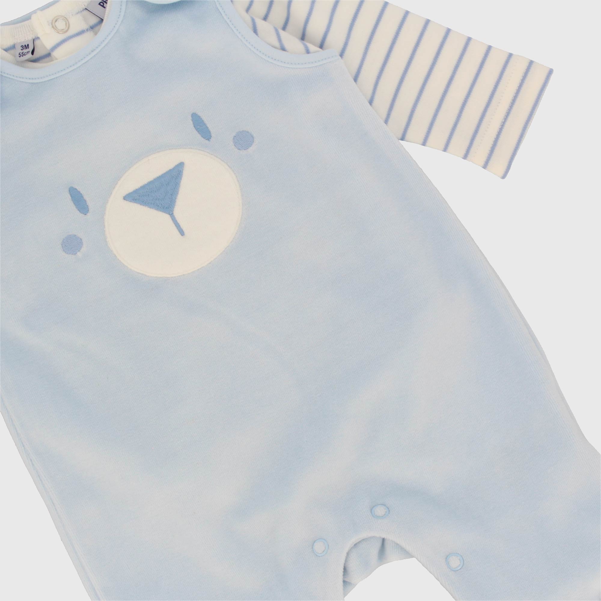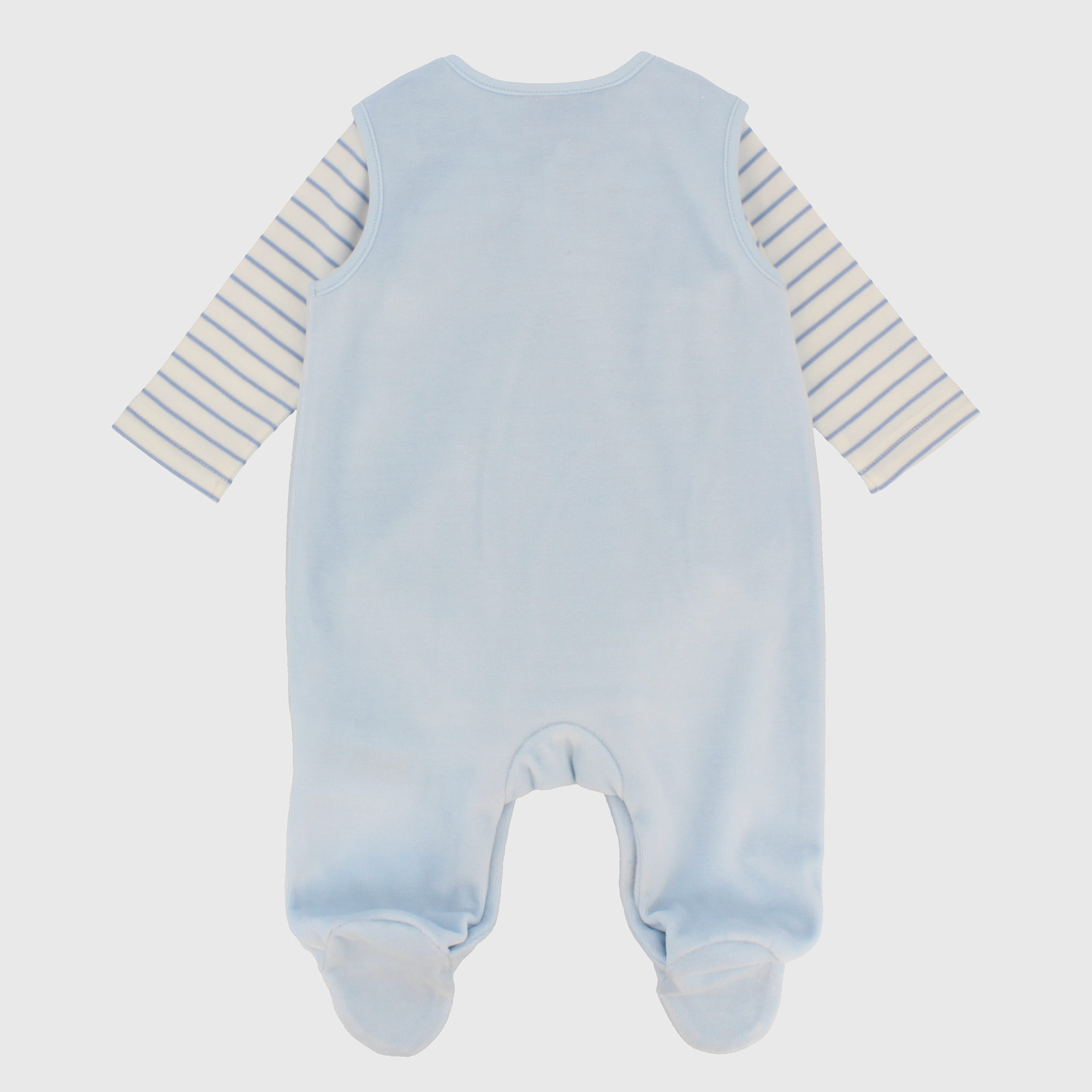 Completo composto da due pezzi. Body girocollo, con righe tinto filo, a maniche lunghe. Chiusura con bottoncini automatici sul retro. Salopette in ciniglia con bottoncini automatici sulle spalle e sul cavallo. Orsetto ricamato.