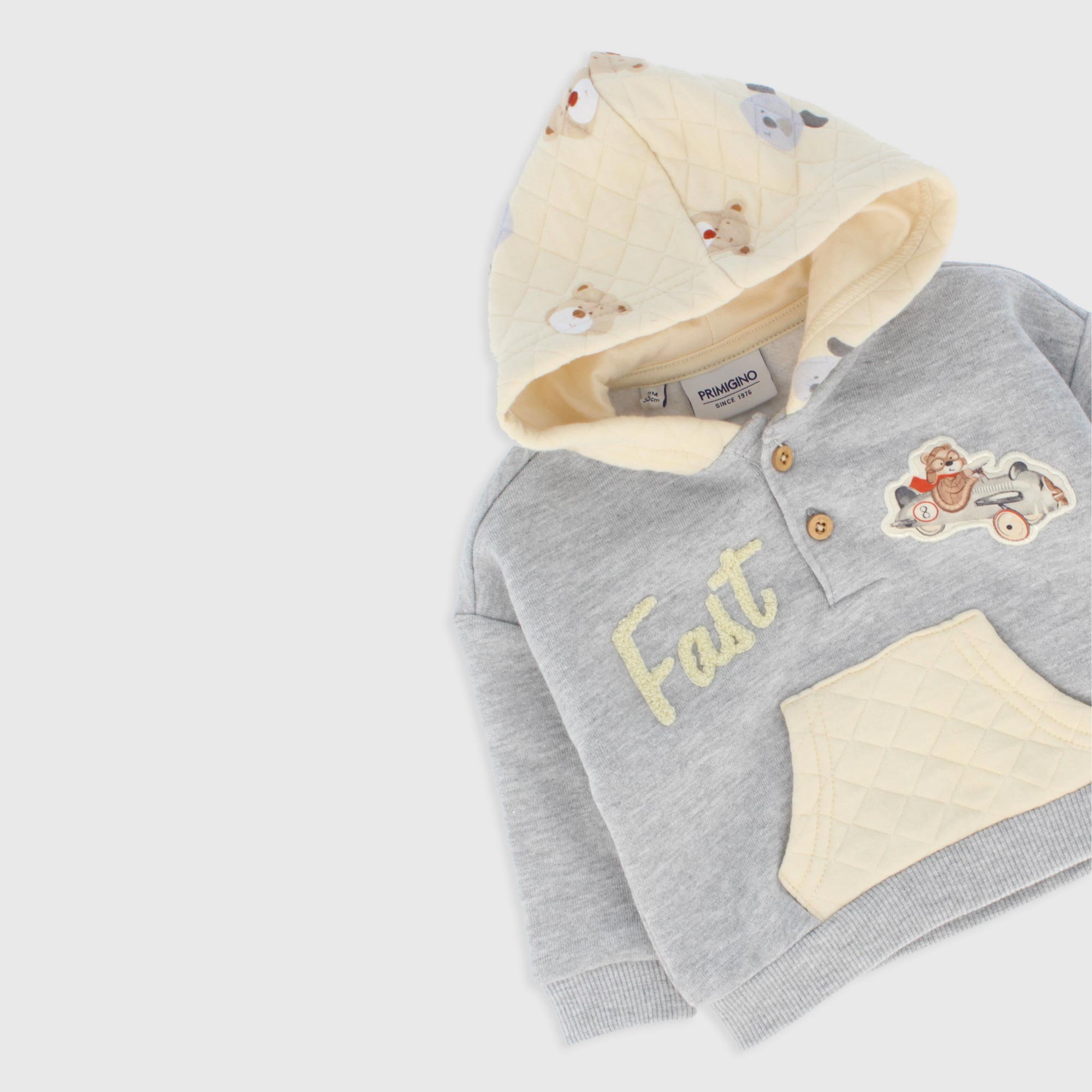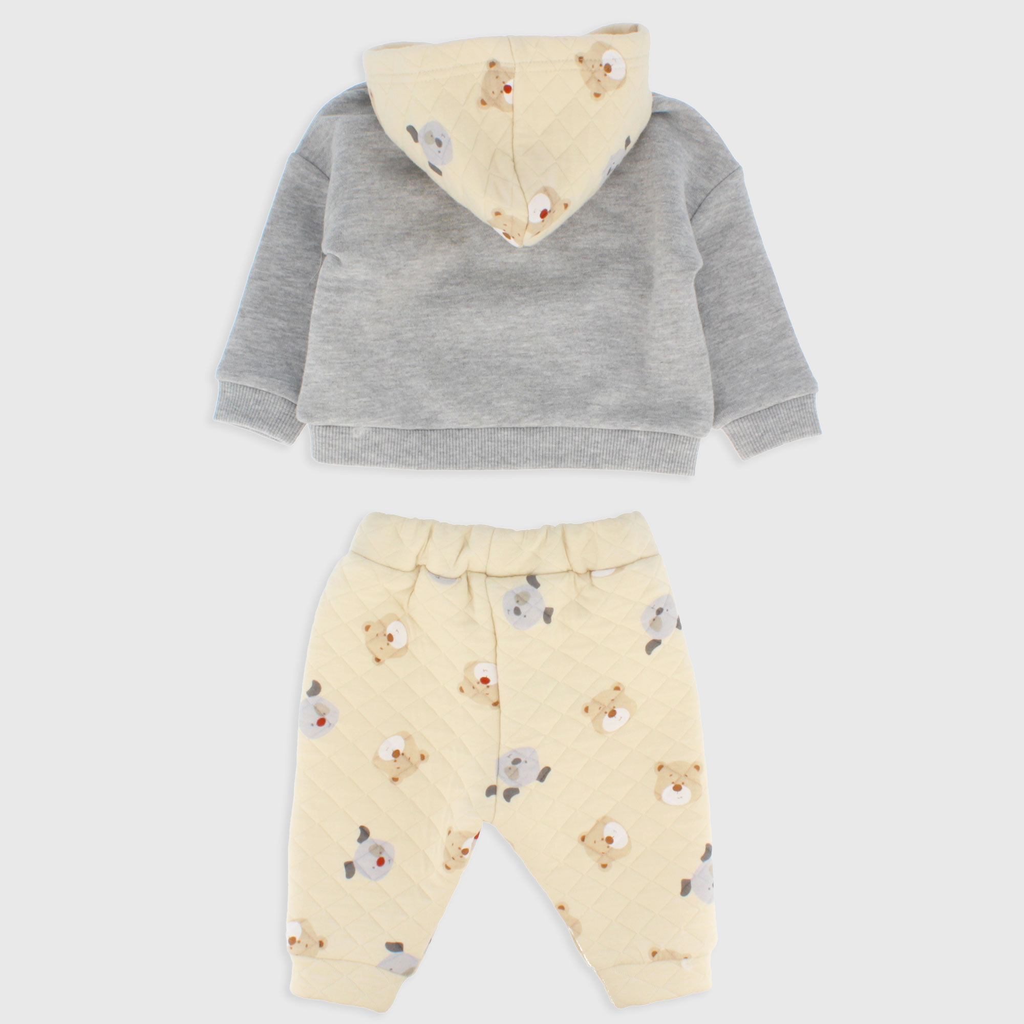 Completo composto da due pezzi. Felpa con cappuccio, a maniche lunghe. Applicazioni e tasca marsupio sul davanti. Pantalone in felpa matelassè, con vita elasticizzata. Stampa all-over su cappuccio e pantaloni.