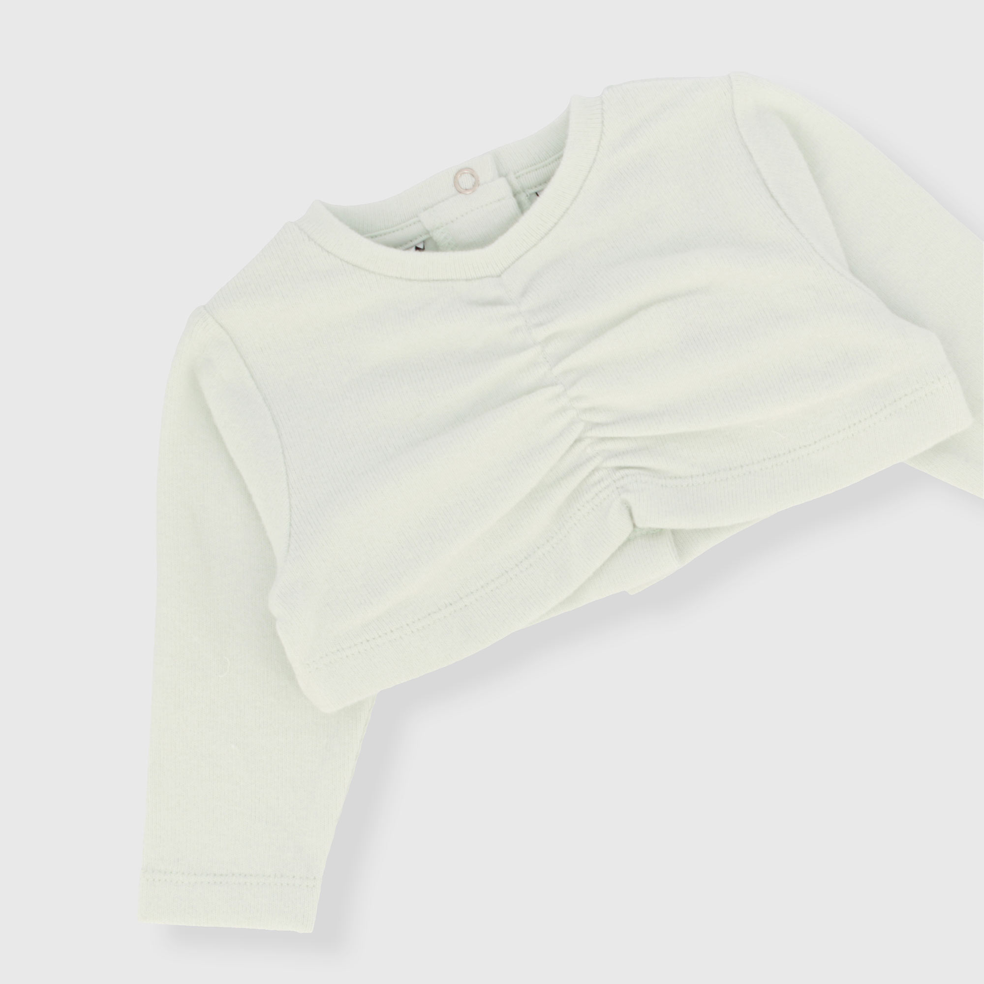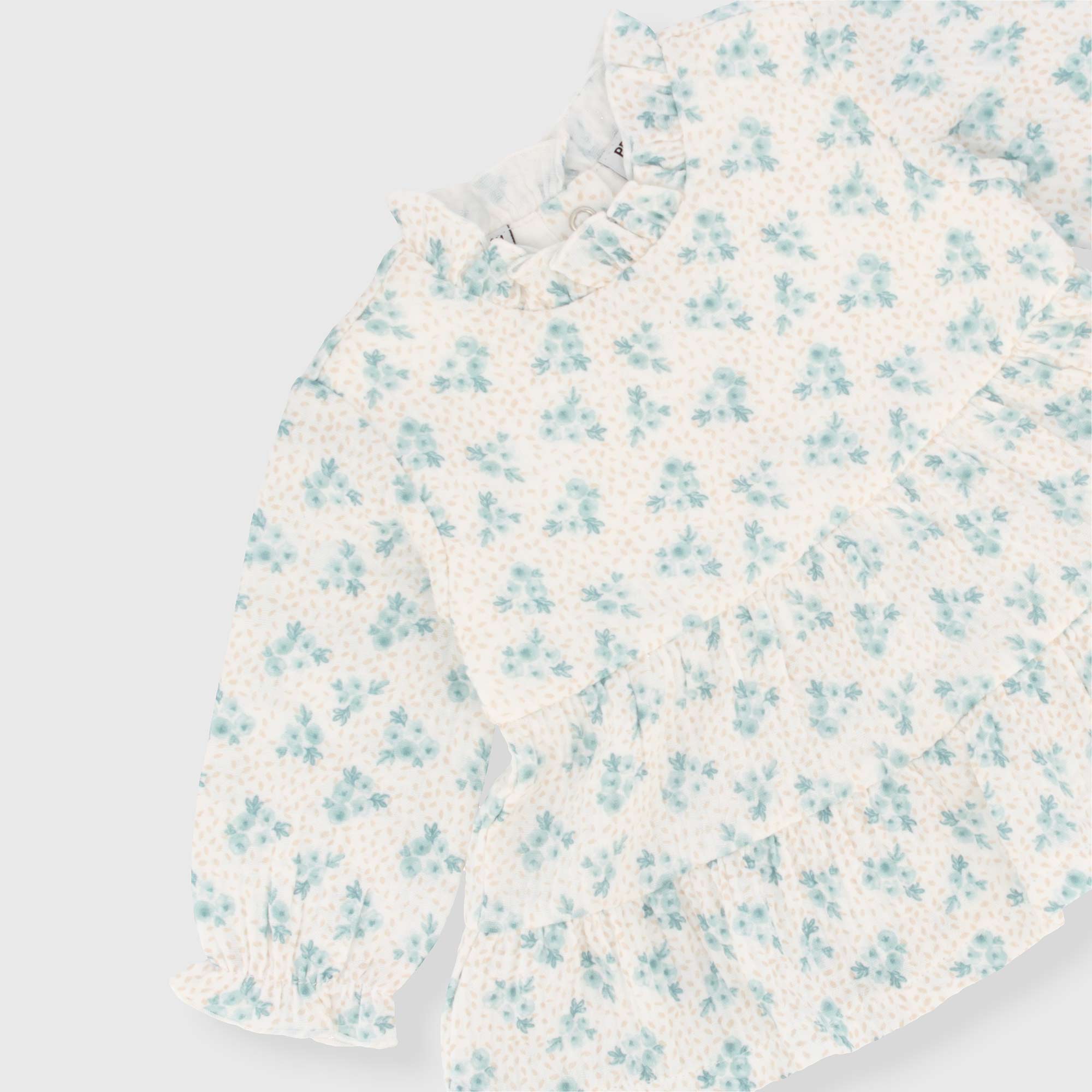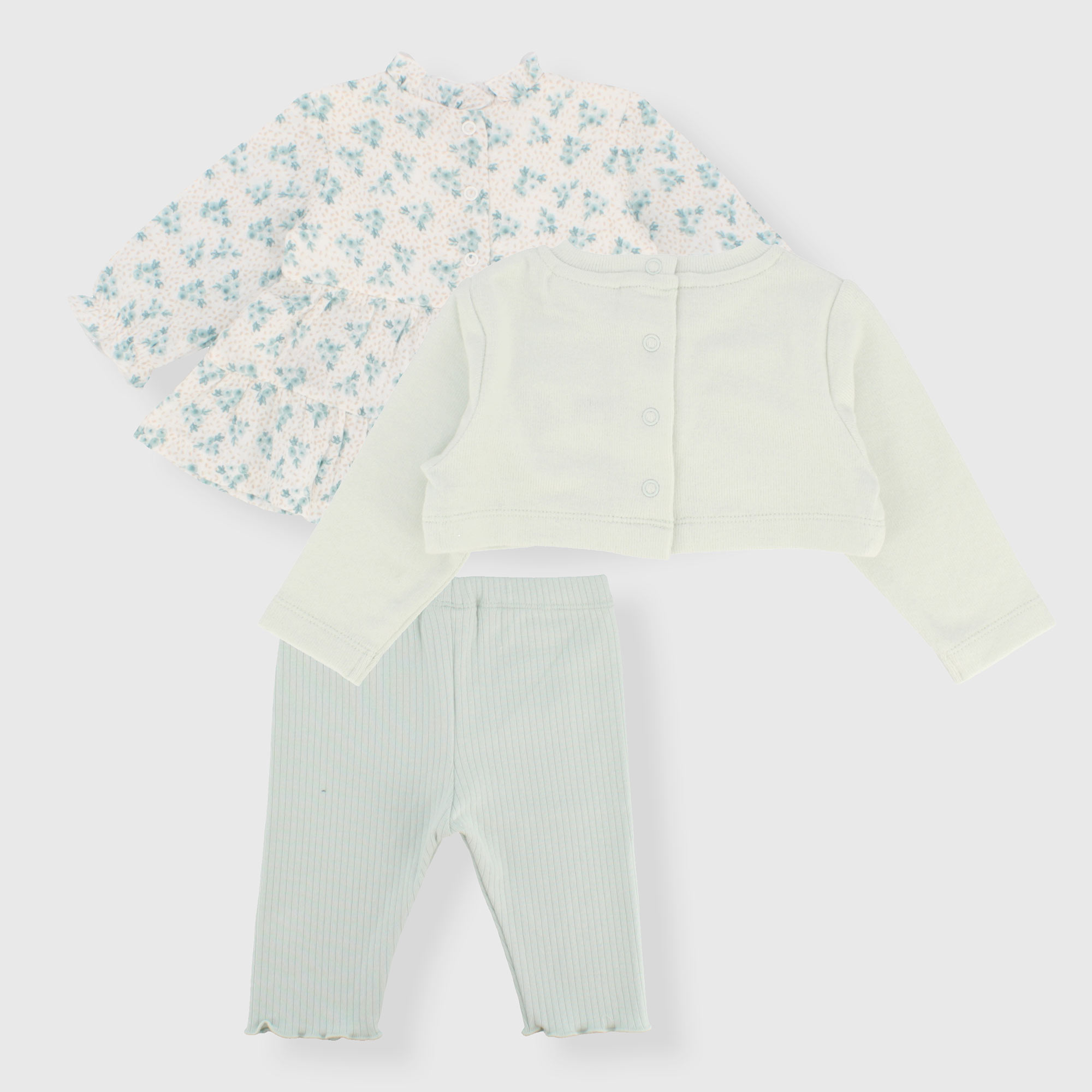 Completo composto da tre pezzi. Cardigan in tessuto soft touch a maniche lunghe. Chiusura con bottoncini automatici sul retro. Blusa mezzo collo a maniche lunghe. Chiusura con bottoncini automatici sul retro. Stampa all-over fiorellini. Leggings in costina con vita elasticizzata e ricamo sul fondo.