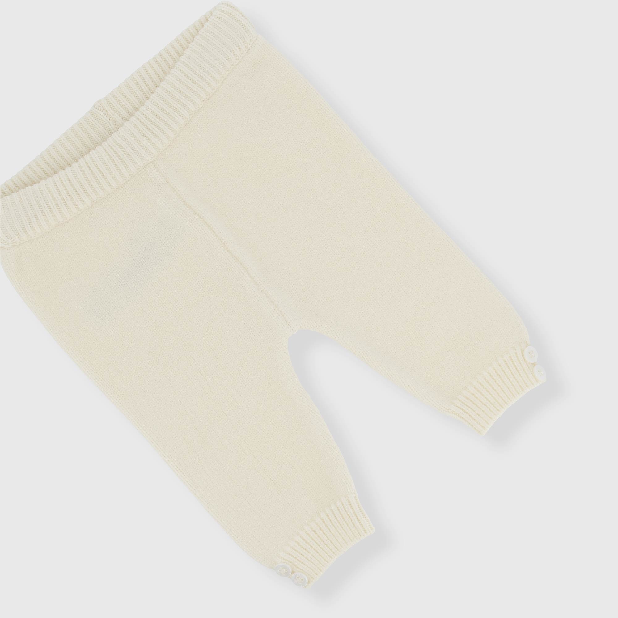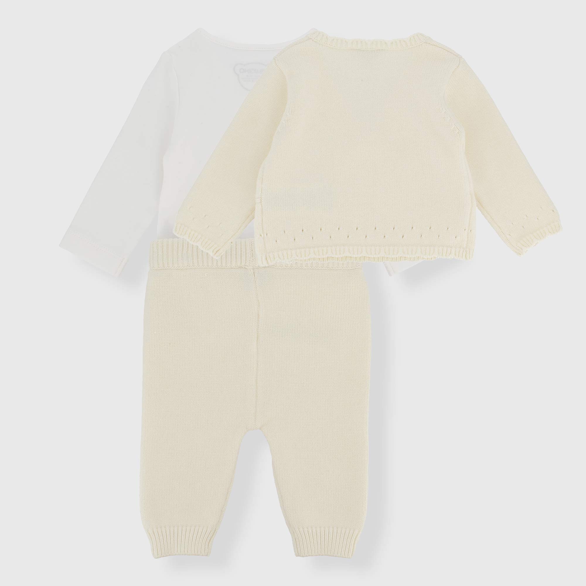 Completo in maglia composto da tre pezzi. Scaldacuore con chiusura incrociata, a maniche lunghe, con lavorazione effetto traforato. Body girocollo a maniche lunghe. Pantalone in maglia con vita elasticizzata e bottoncini sul fondo laterale.