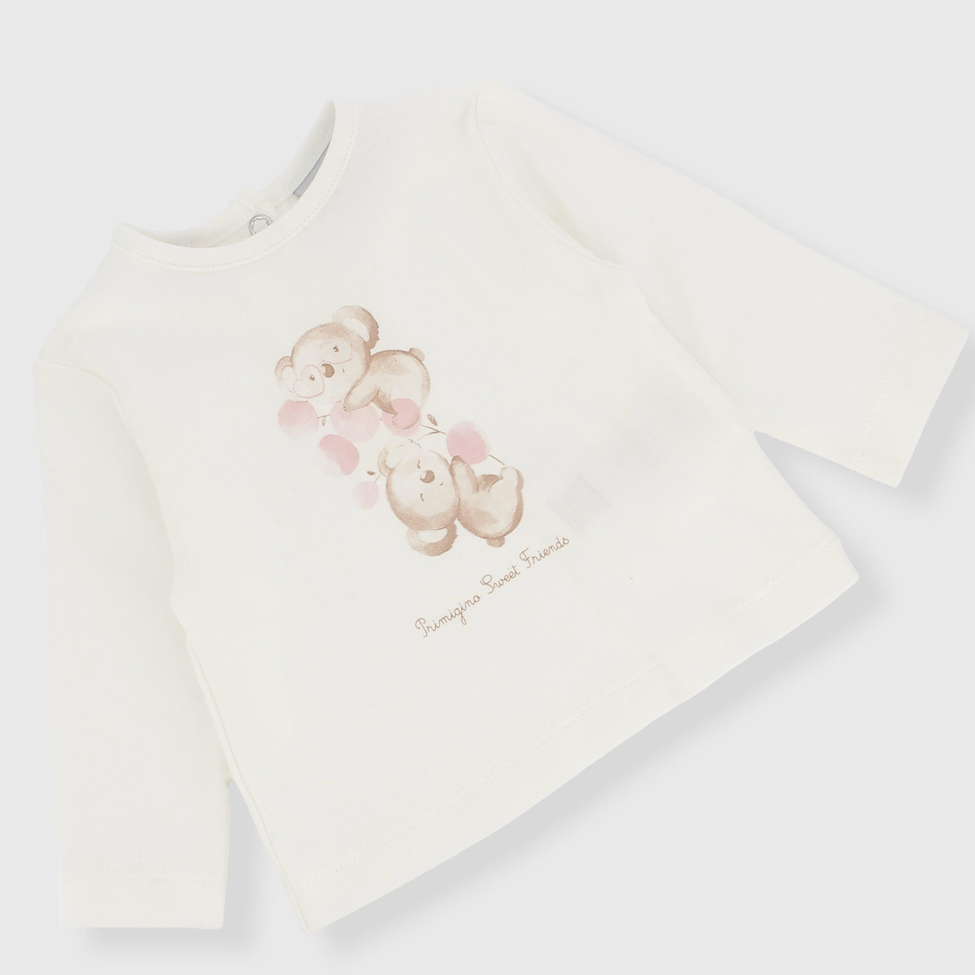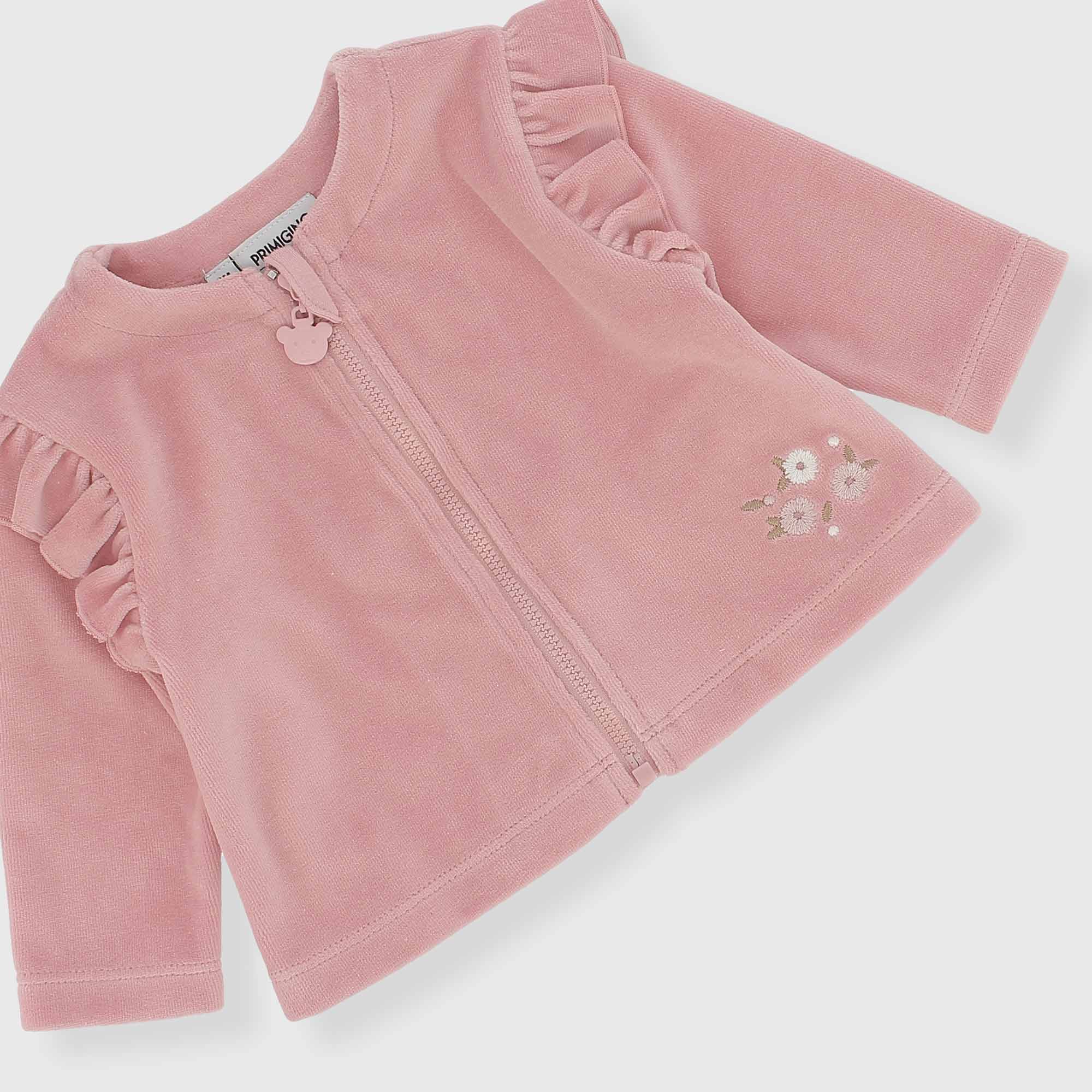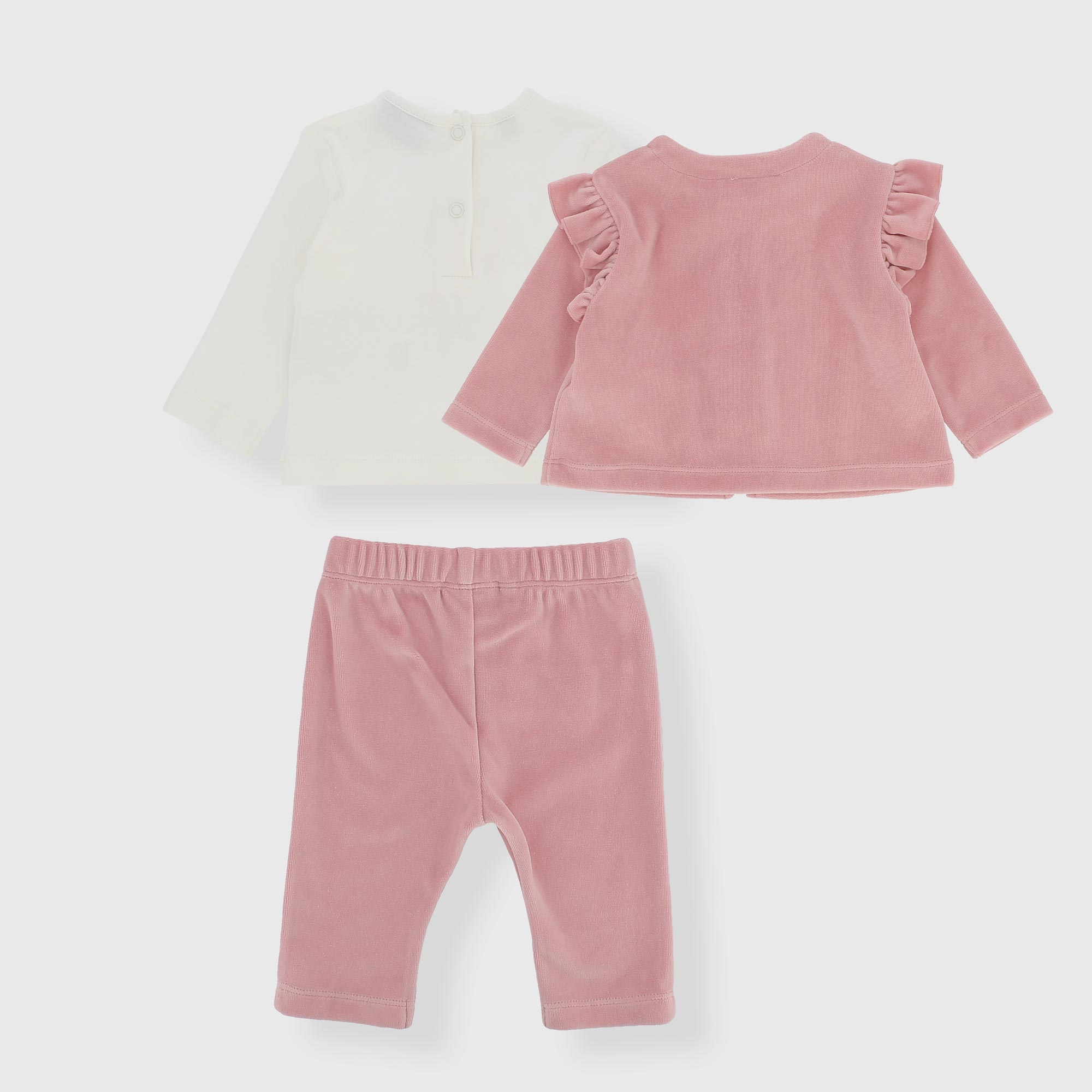Completo composto da tre pezzi. Giacchina aperta a maniche lunghe. Chiusura con zip sul davanti. Volants sulle spalle e fiori ricamati. Maglietta in jersey, a maniche lunghe. Chiusura con bottoncini automatici sul retro. Stampa sul davanti. Pantalone in ciniglia con vita elasticizzata.