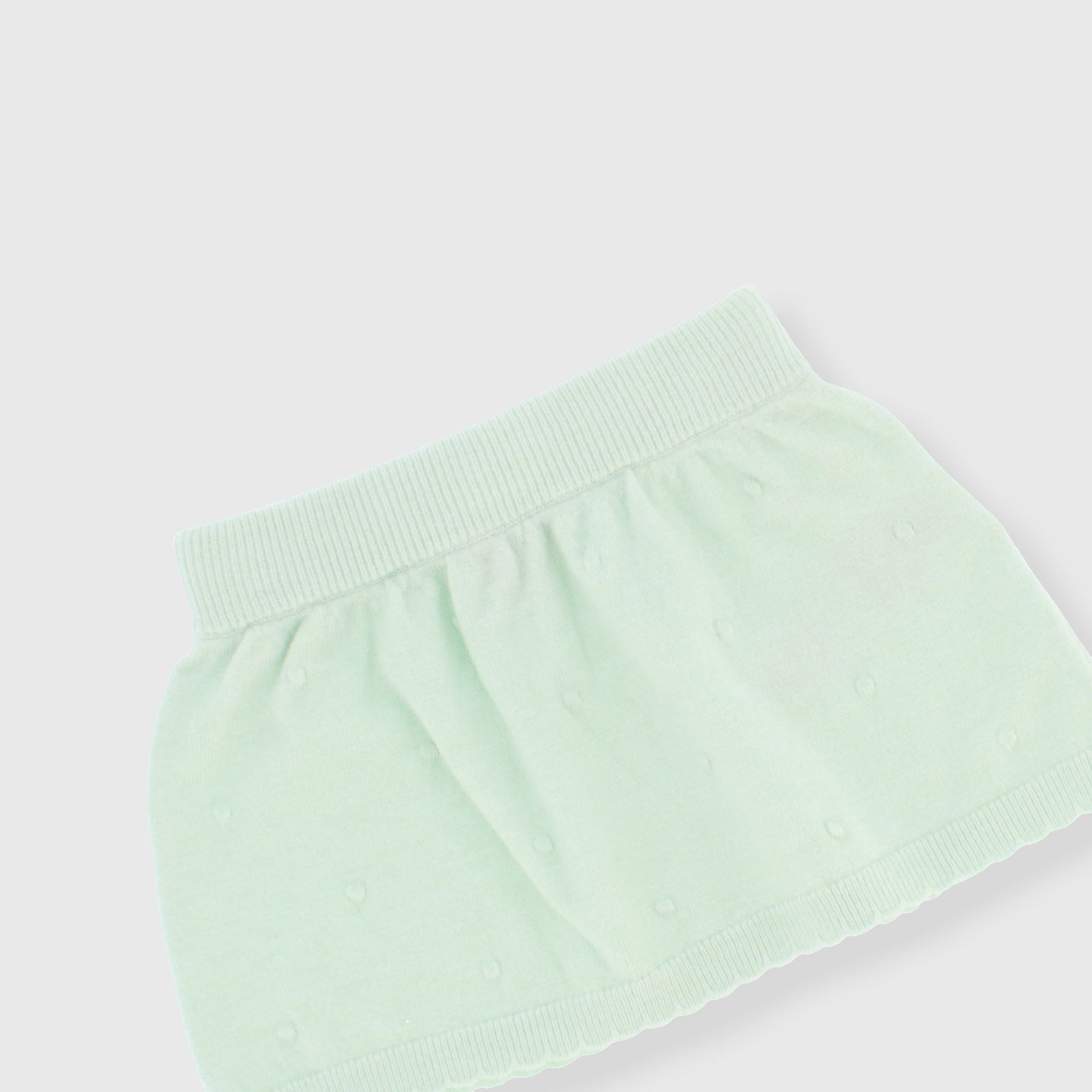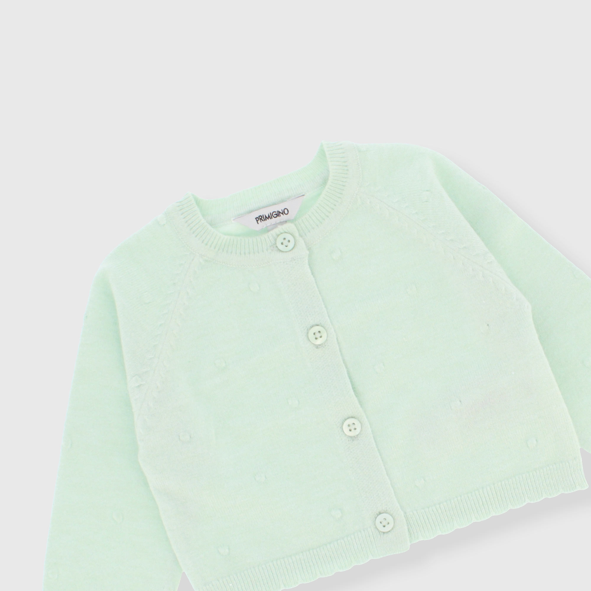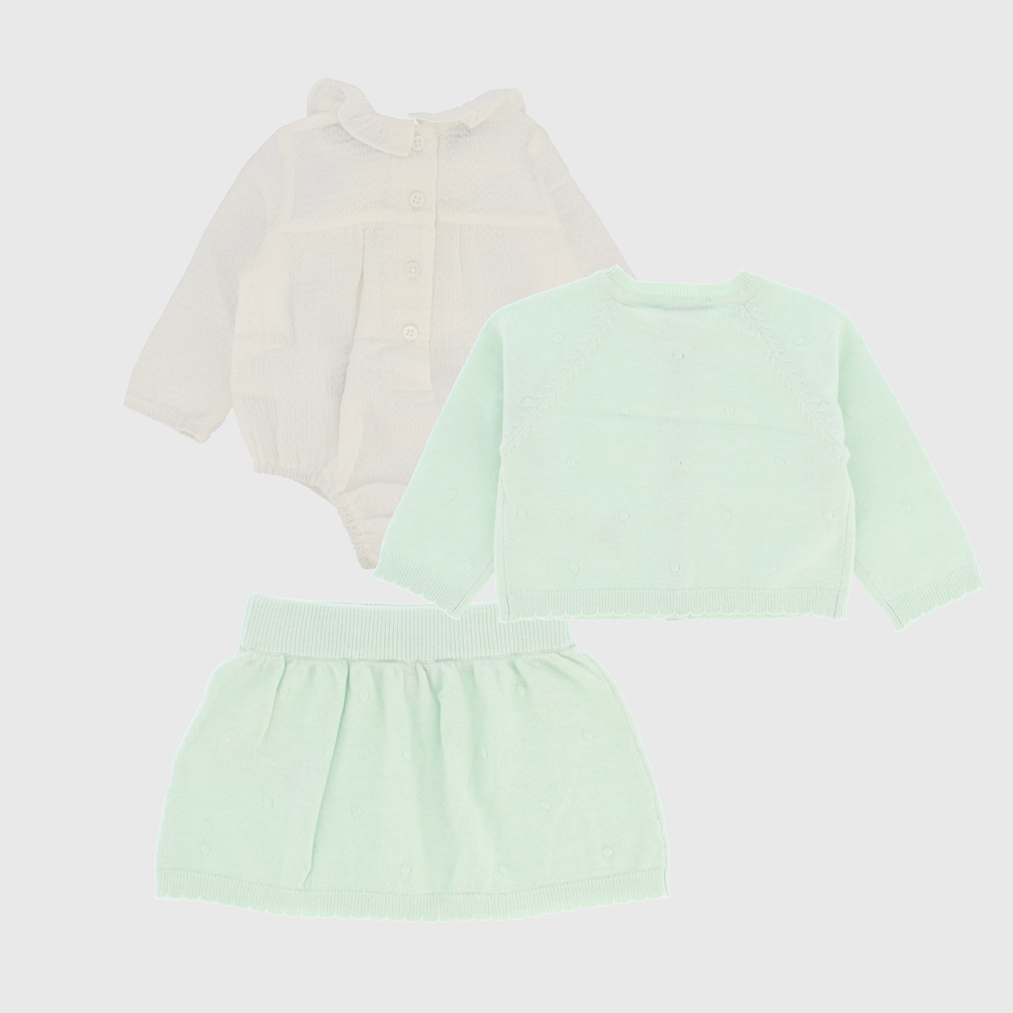 Completo composto da tre pezzi. Cardigan in morbida maglia a maniche lunghe. Chiusura con bottoncini sul davanti. Body con colletto con volants, a maniche lunghe. Chiusura con bottoncini automatici sul retro. Gonna in morbida maglia, con vita elasticizzata.