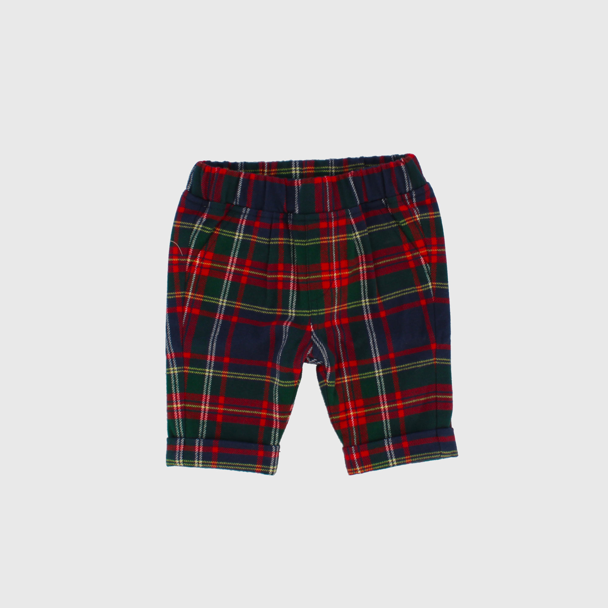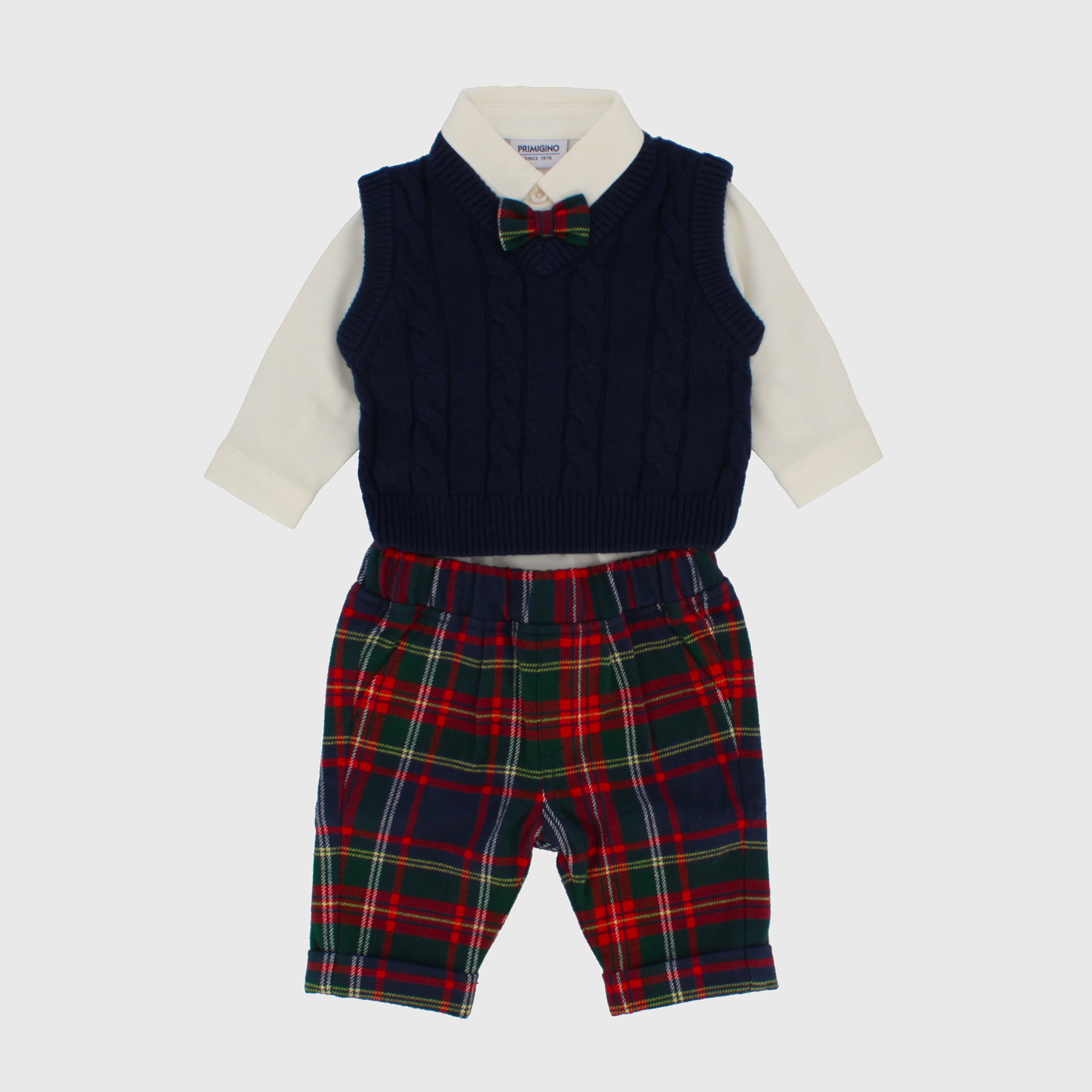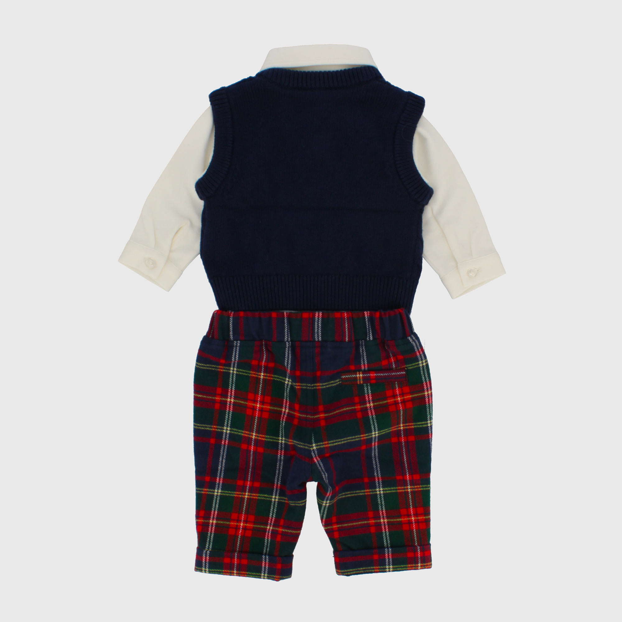 Completo composto da tre pezzi. Gilet in morbida maglia con scollo a V. Lavorazione a trecce. Camicia a body, a maniche lunghe, con papillon tartan. Pantalone tartan foderato.